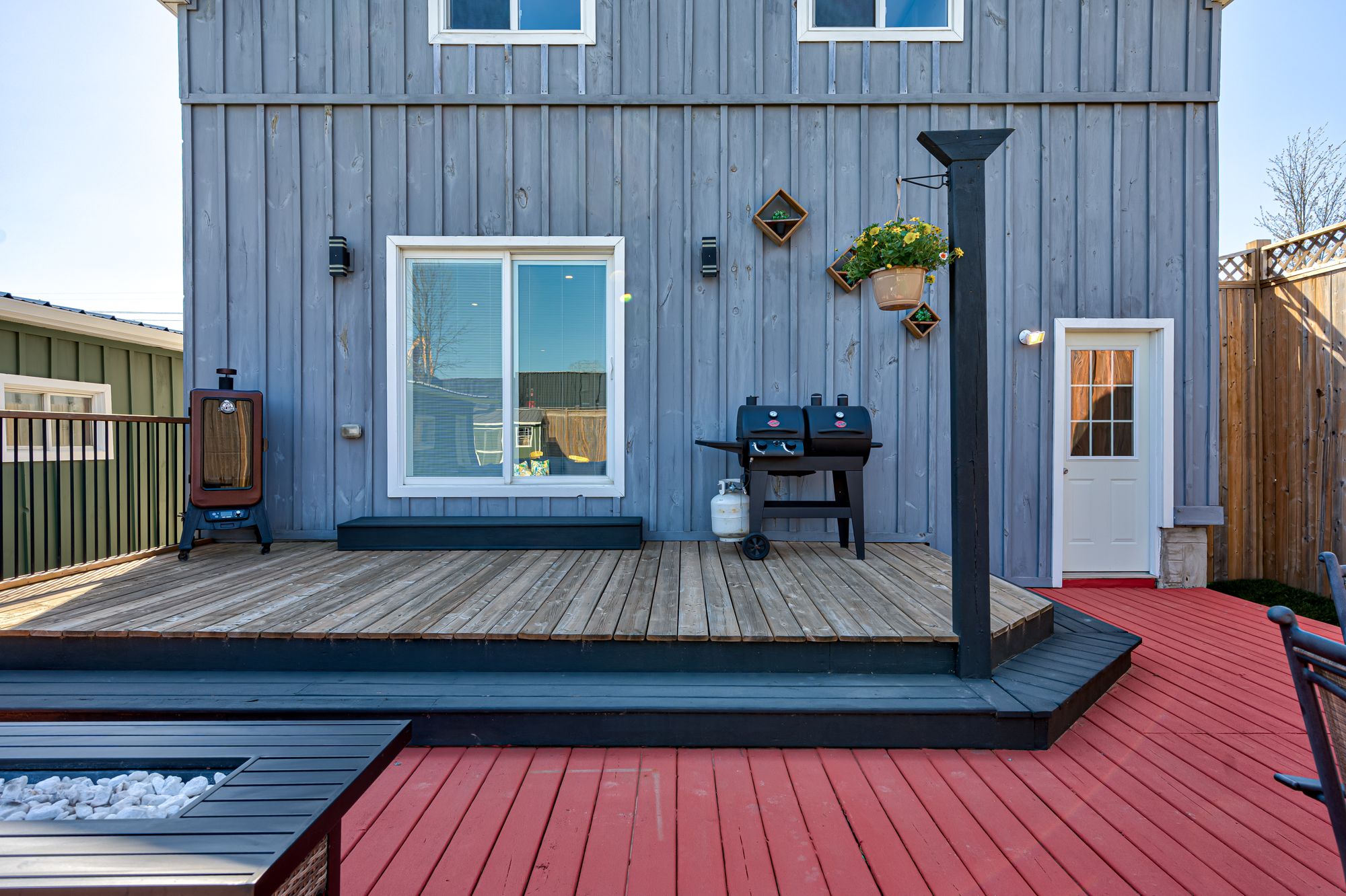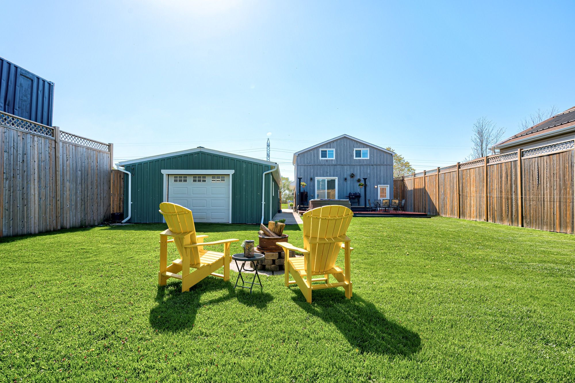 • Fully fenced backyard with deck, firepit area, and garden shed.