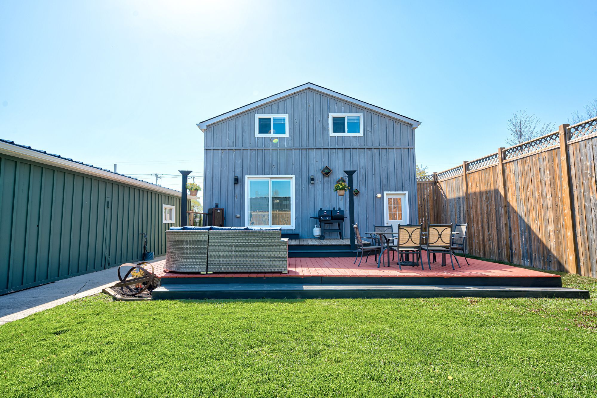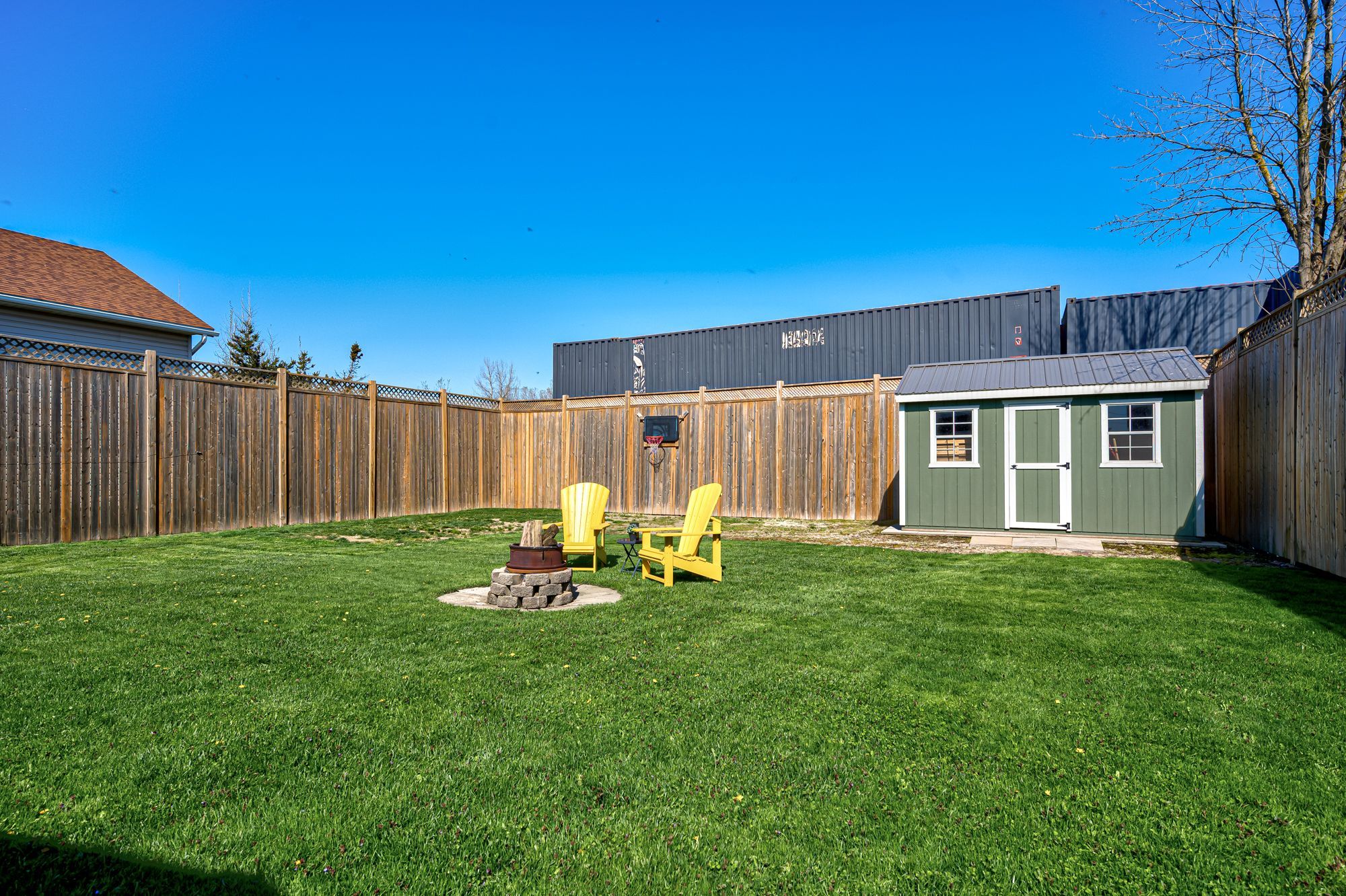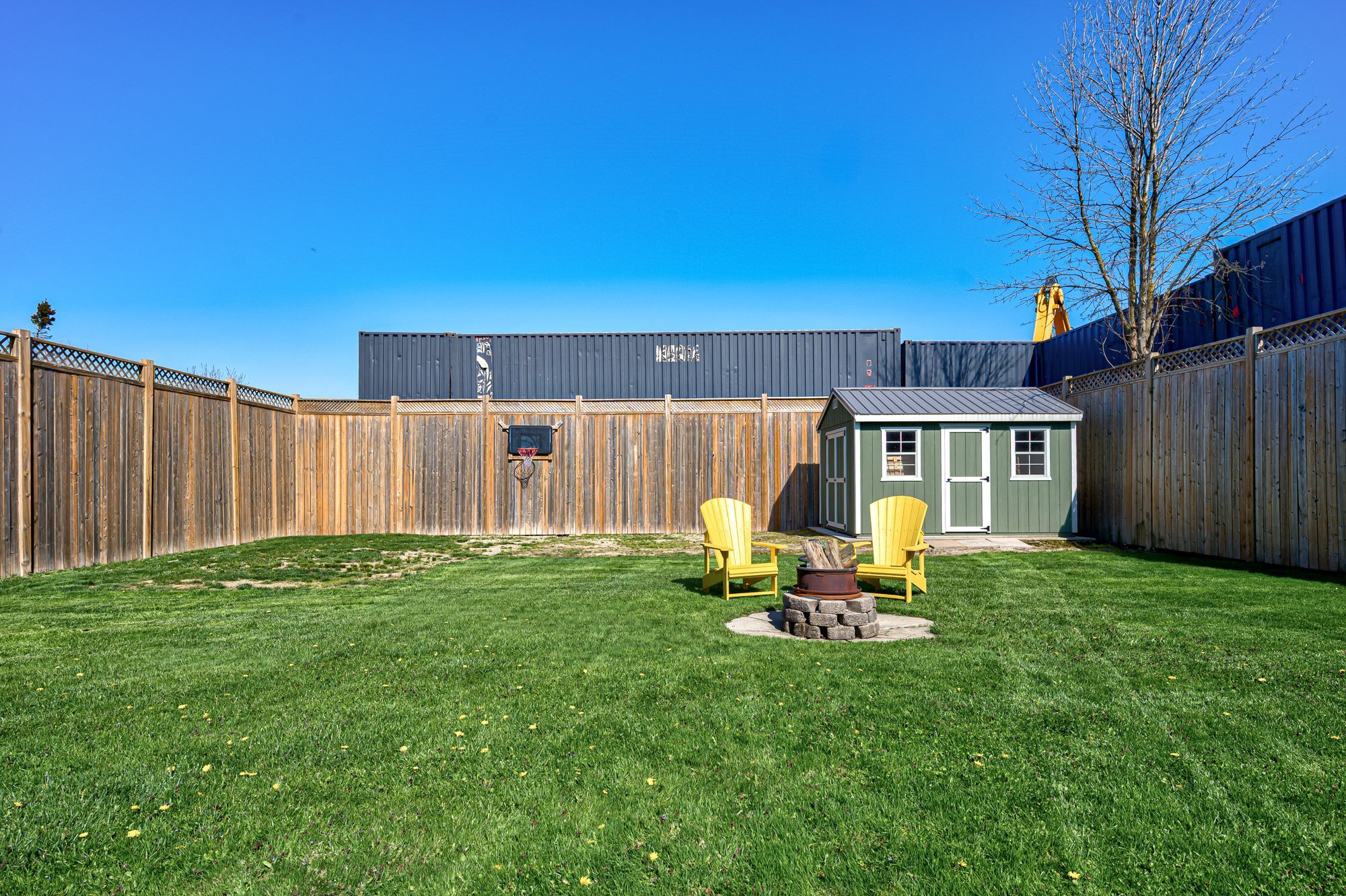 • Fully fenced backyard with a deck, firepit area, and garden shed for privacy.
