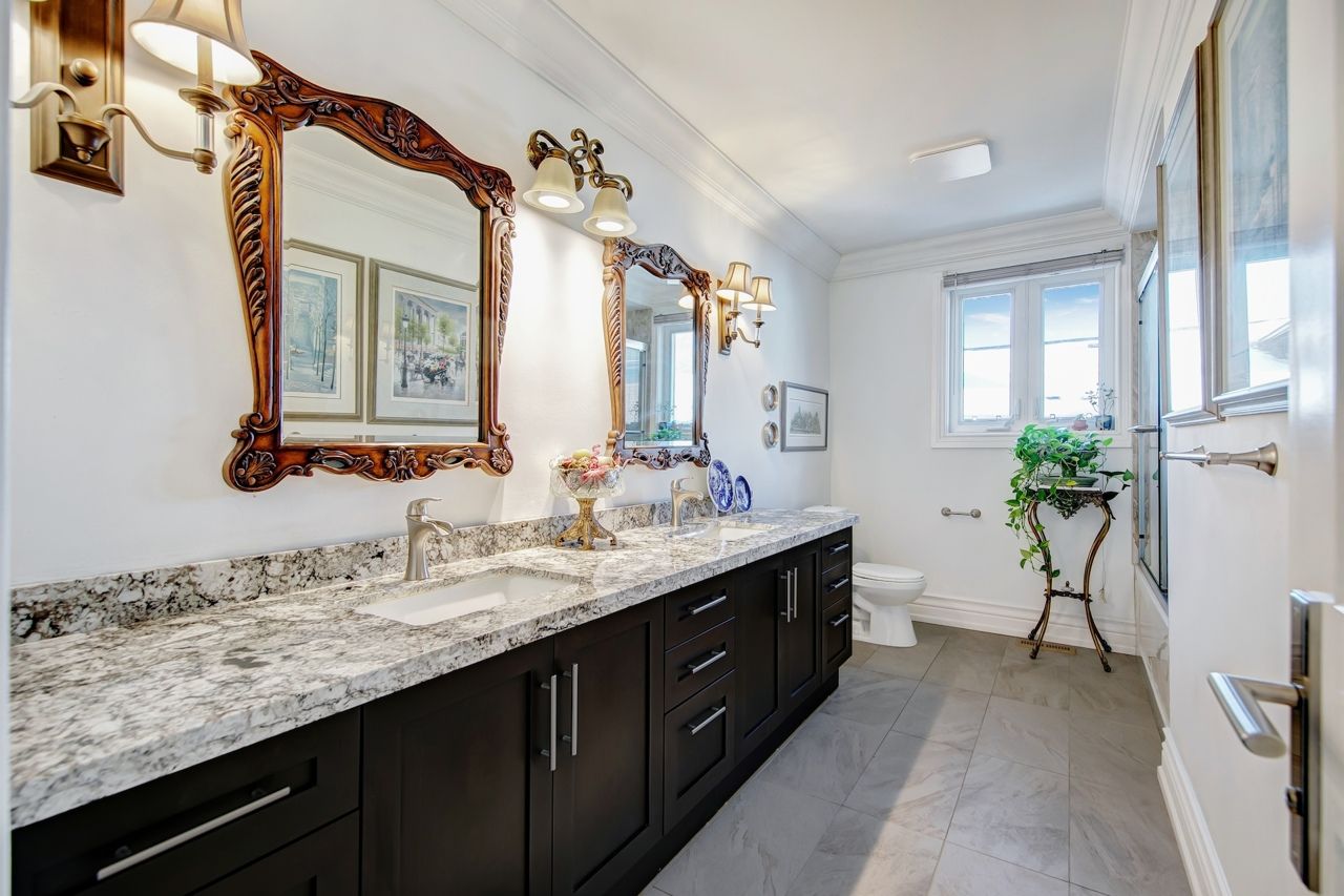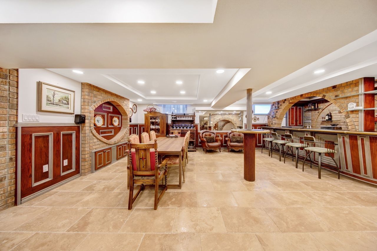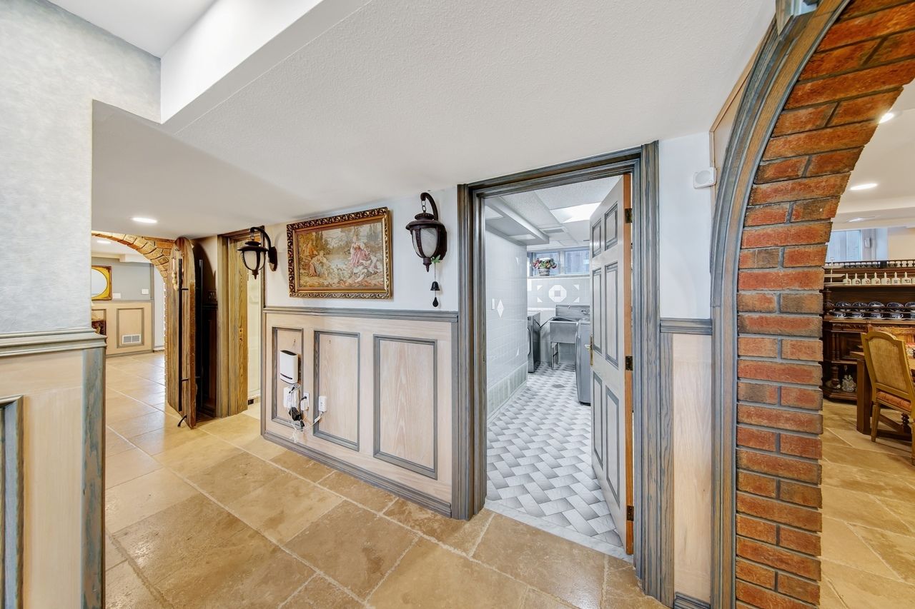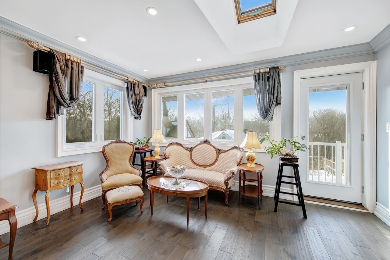 Spectacular fully renovated ravine-lot residence! 4105 sqf of luxury living+267 solarium. This exceptional home has undergone $$$in renovations, showcase timeless elegance, thoughtful design&superior craftsmanship throughout. The main level features walnut hardwood floor, marble foyer, abundant interior & exterior pot lights, crown moulding, millwork, coffered ceiling, solid interior doors, operable skylights, wraparound balconies shared by the primary & 2nd bedroom. The primary retreat offers two walk-in closets and a spa-like ensuite. Additional conveniences include security cameras, sprinkler systems, electrical sub-panel, direct garage access, and an extra-long driveway for up to 10 vehicles. The main floor offers 3 generously sized bedrooms and 3 luxury finished washrooms. The lower level mirrors the scale of the main floor and is flooded with natural light. Finished with stone tiling, extensive cedar accents, and dramatic white oak open-riser stairs with matching wood paneling throughout, this level delivers warmth and architectural character. Antique solid wood doors lead to a private bedroom (or family rm)with a fireplace and direct walk-out access showcasing breathtaking ravine views. Ideal for entertaining or extended family living, the space includes a wet bar, full 2nd kitchen with sub-zero refrigerator, dry sauna, and an elegant seven-piece washroom featuring a jacuzzi and extensive use of the cedar ceiling. A separate side entrance adds flexibility and privacy. A standout feature is the custom-built solarium (around 267 sq ft, over $$$in construction) engineered with a steel-beam structure. Hardwood flooring with rough-in water supply and drainage already in place, it offers future potential for an additional washroom. This bright, versatile space is perfect for relaxing, working, or gathering while enjoying tranquil ravine views. A rare offering combining luxury, space, privacy, nature, and exceptional location in one remarkable home.