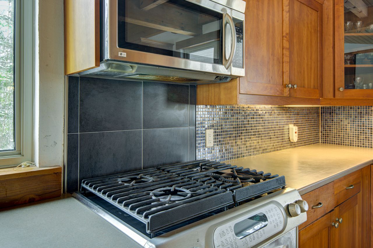• Custom kitchen with cherry wood cabinetry and stainless steel appliances.