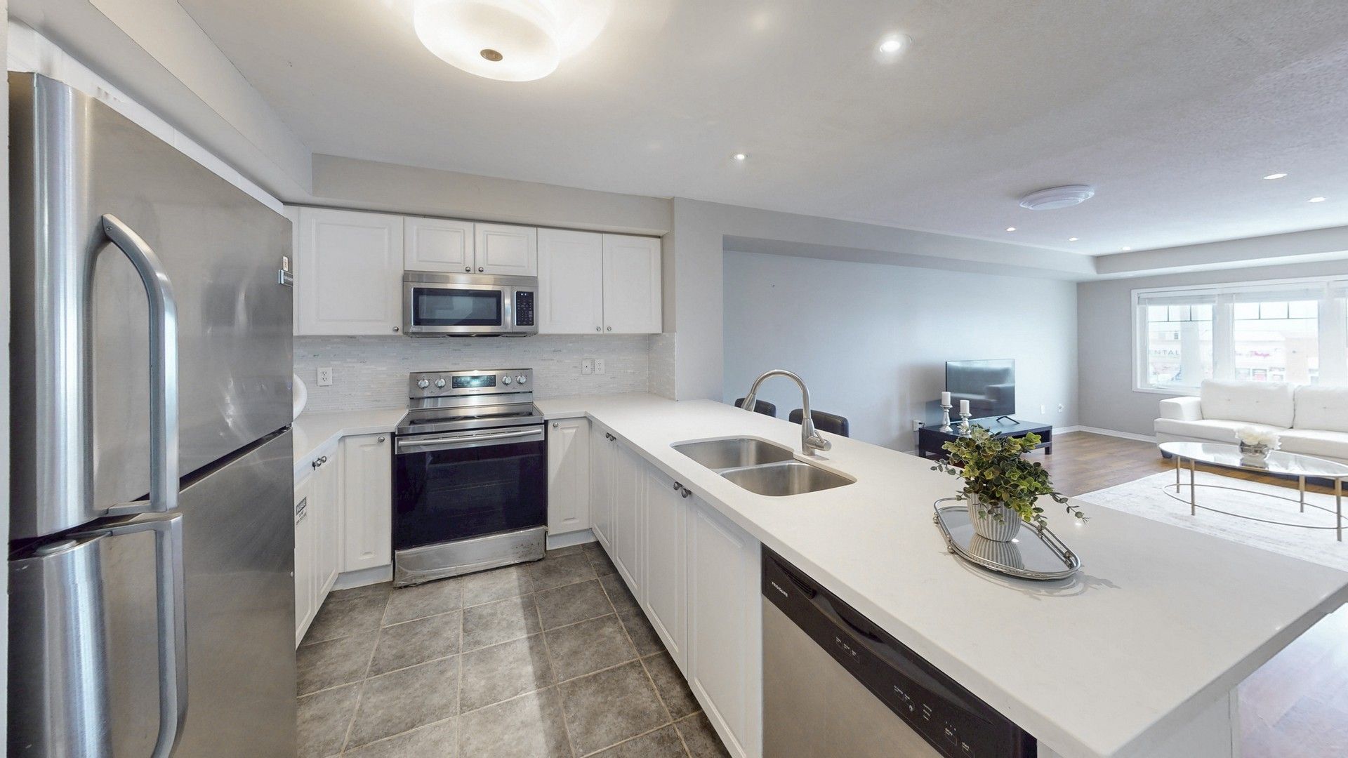 • Bright open-concept kitchen featuring modern appliances and quartz countertops.