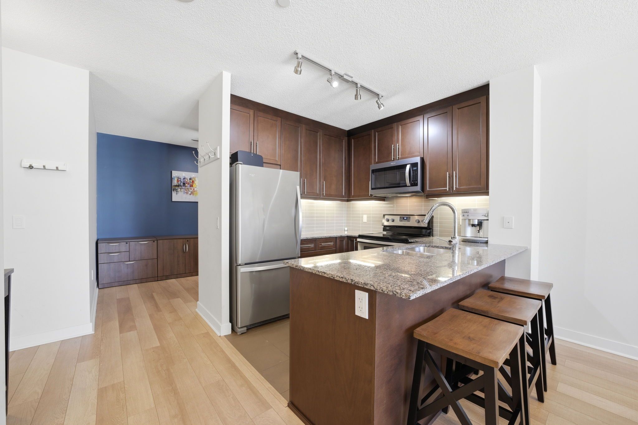 • Full kitchen with breakfast bar and ample cabinetry for cooking needs.