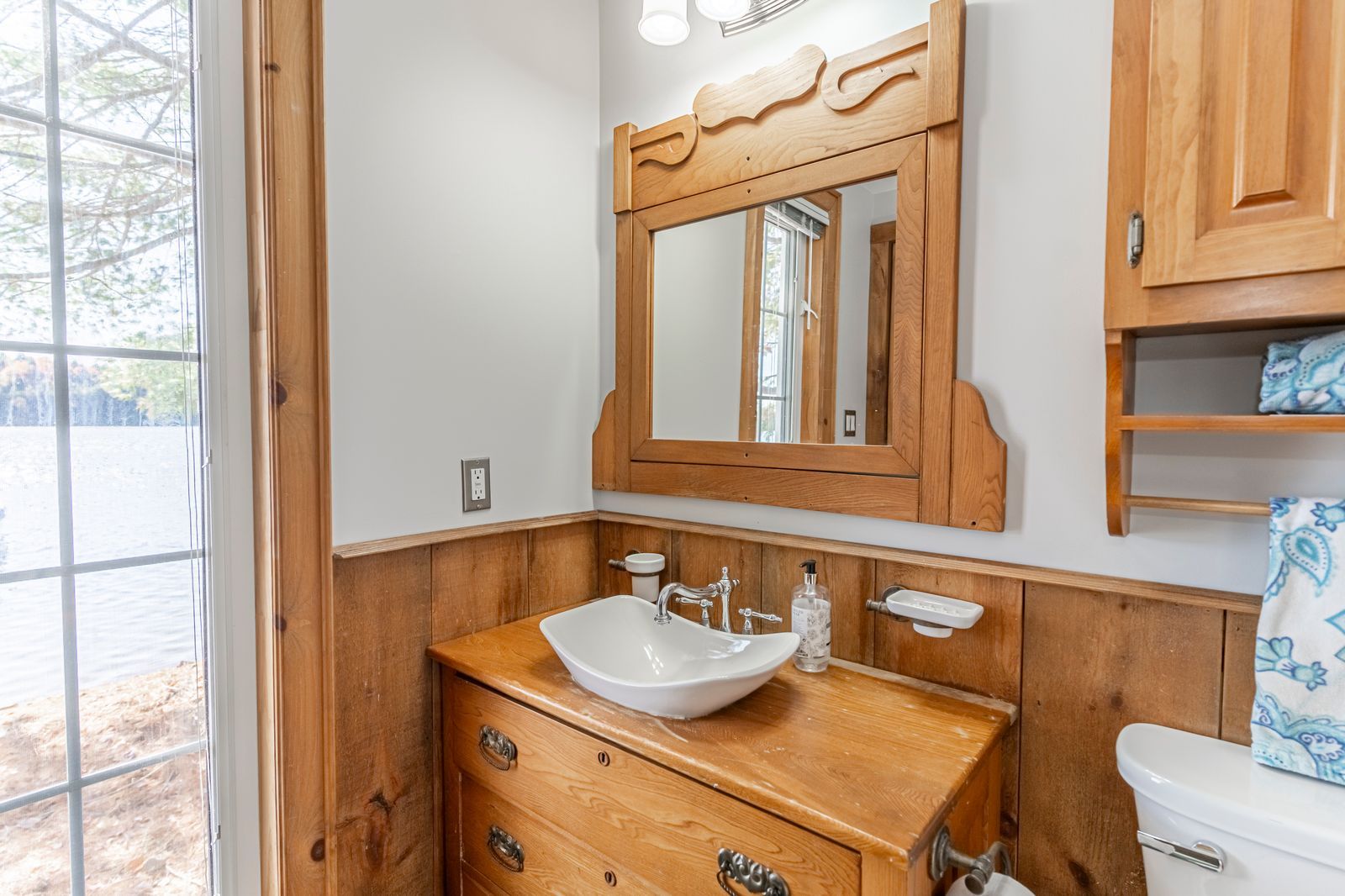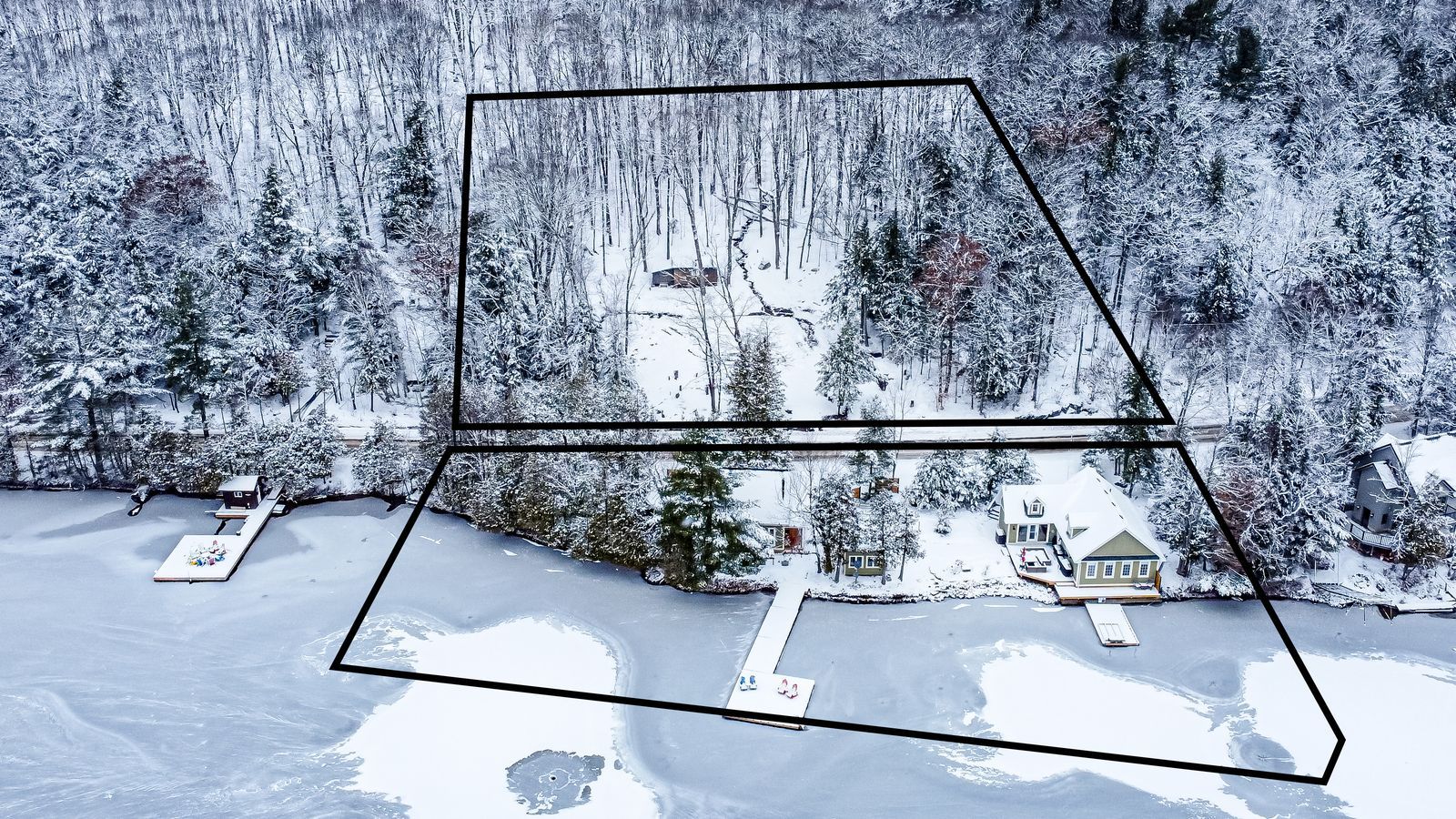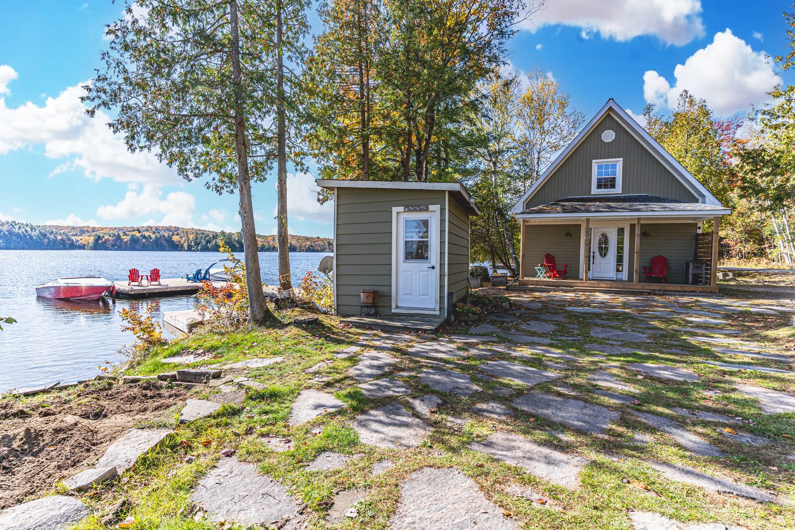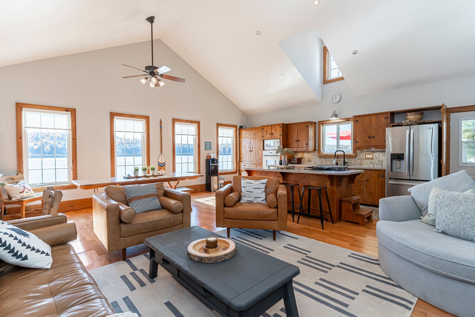 • Open-concept main residence with panoramic lake views and cathedral ceilings.