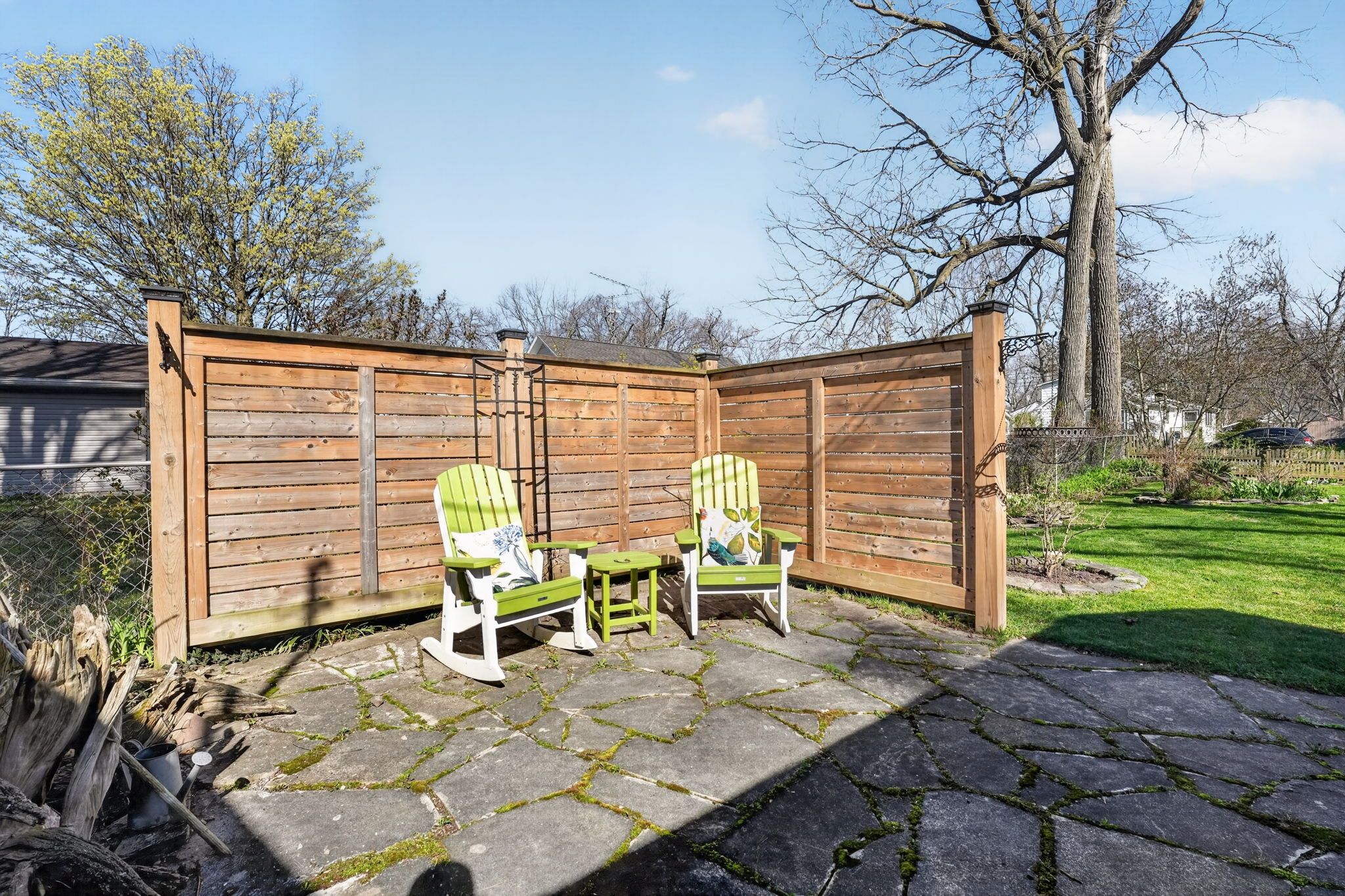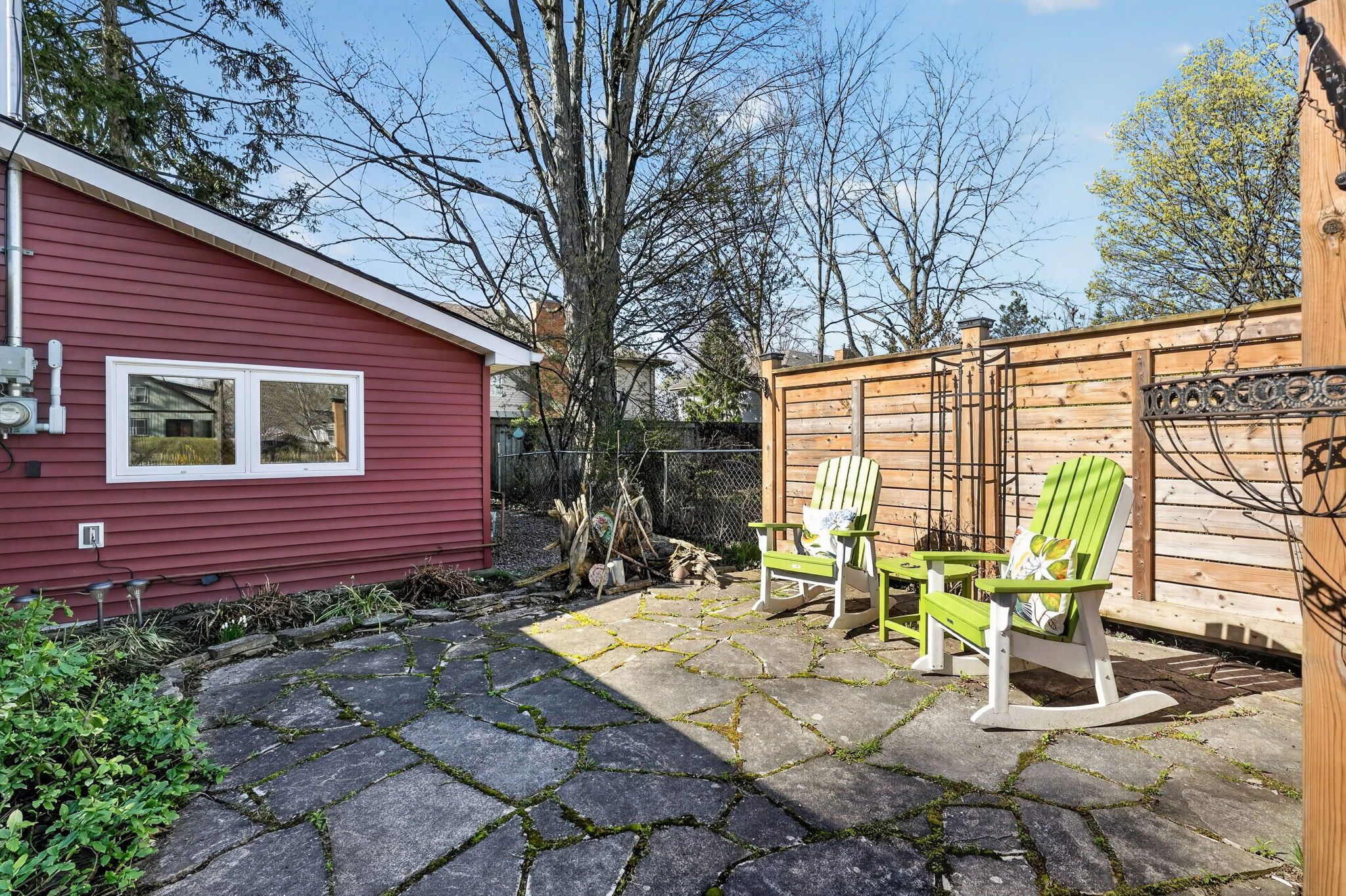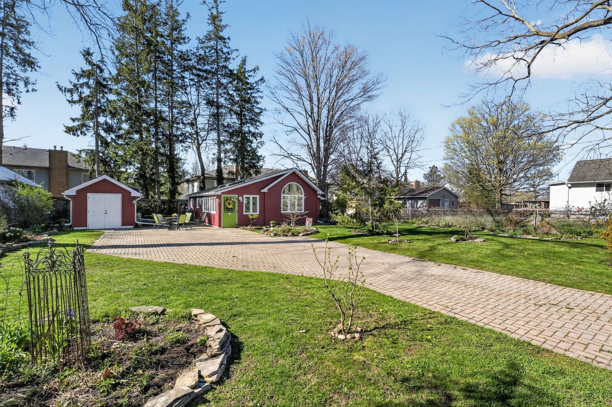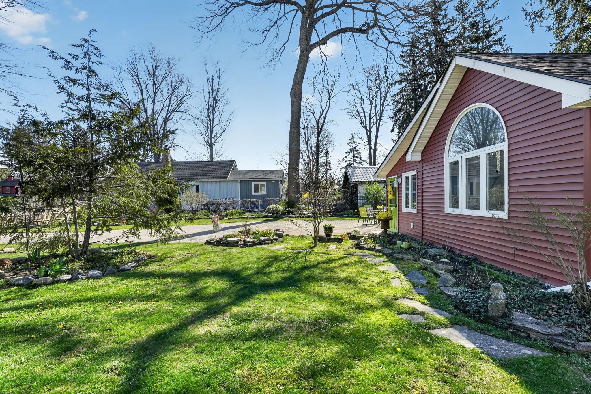 • Spacious 78x123 ft lot with landscaped grounds and a flagstone patio.
