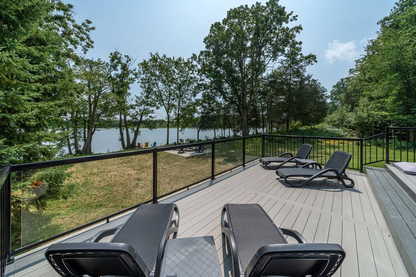 • Outdoor features like a double garage, private dock, and expansive two-level deck.