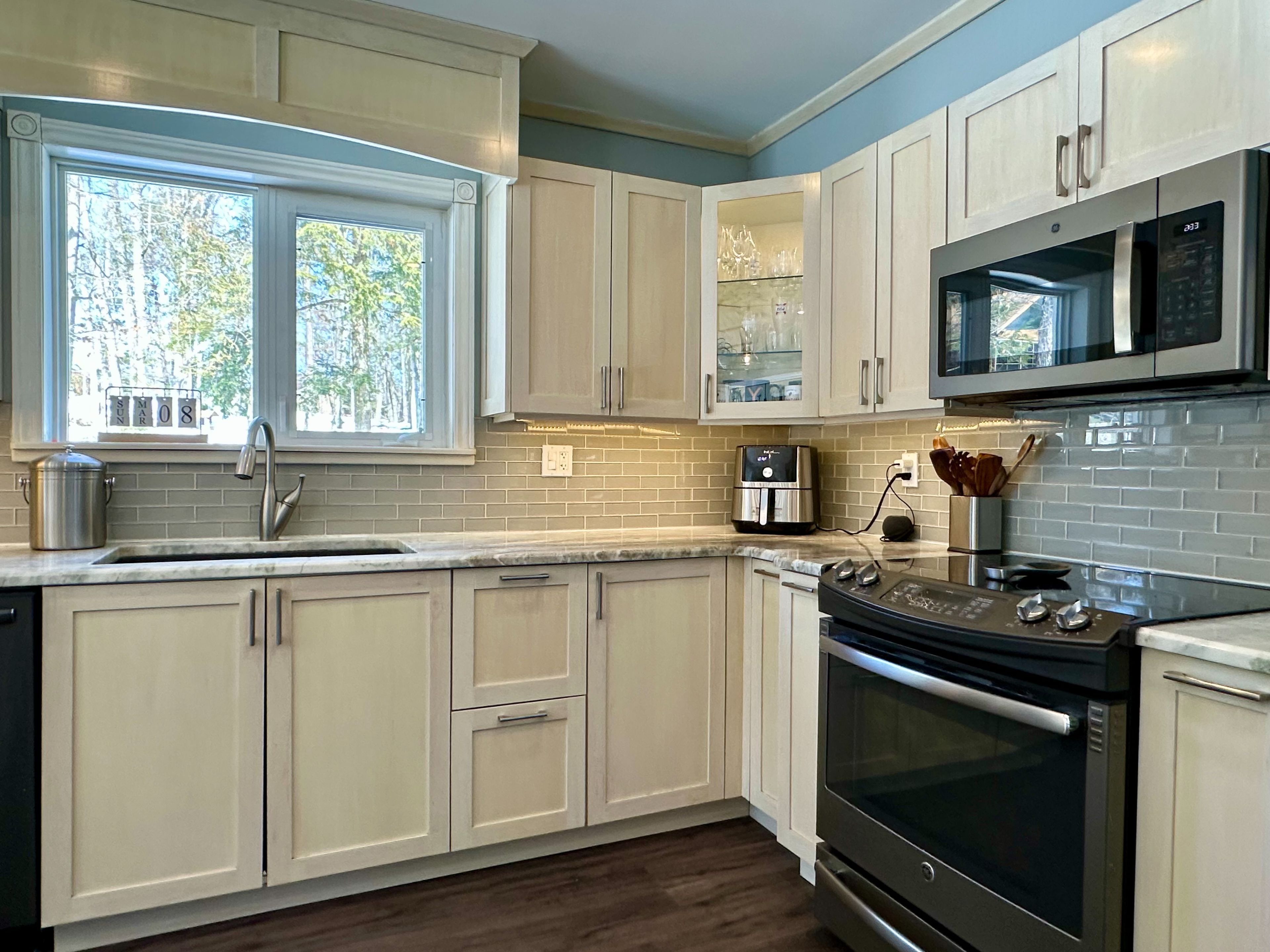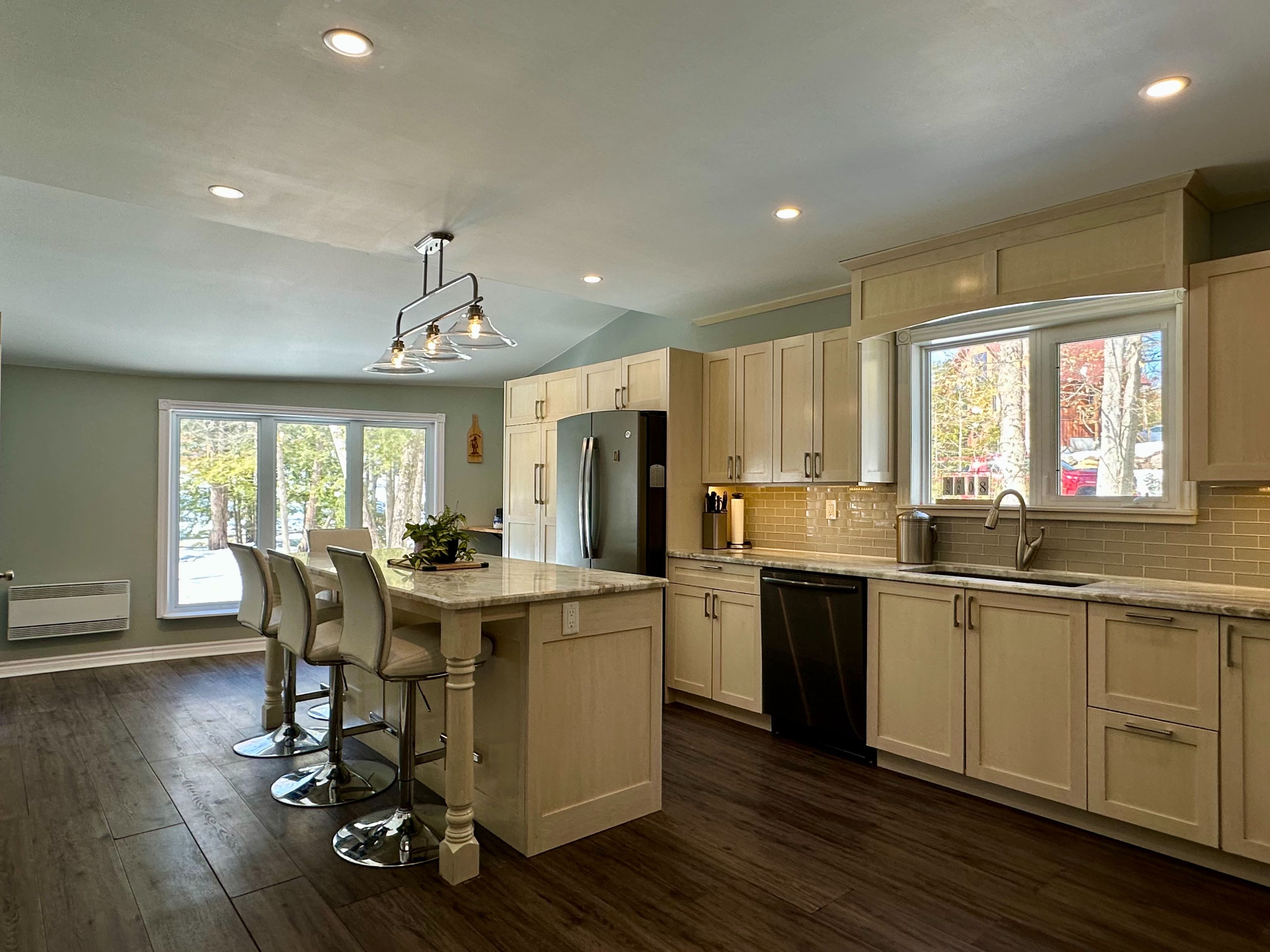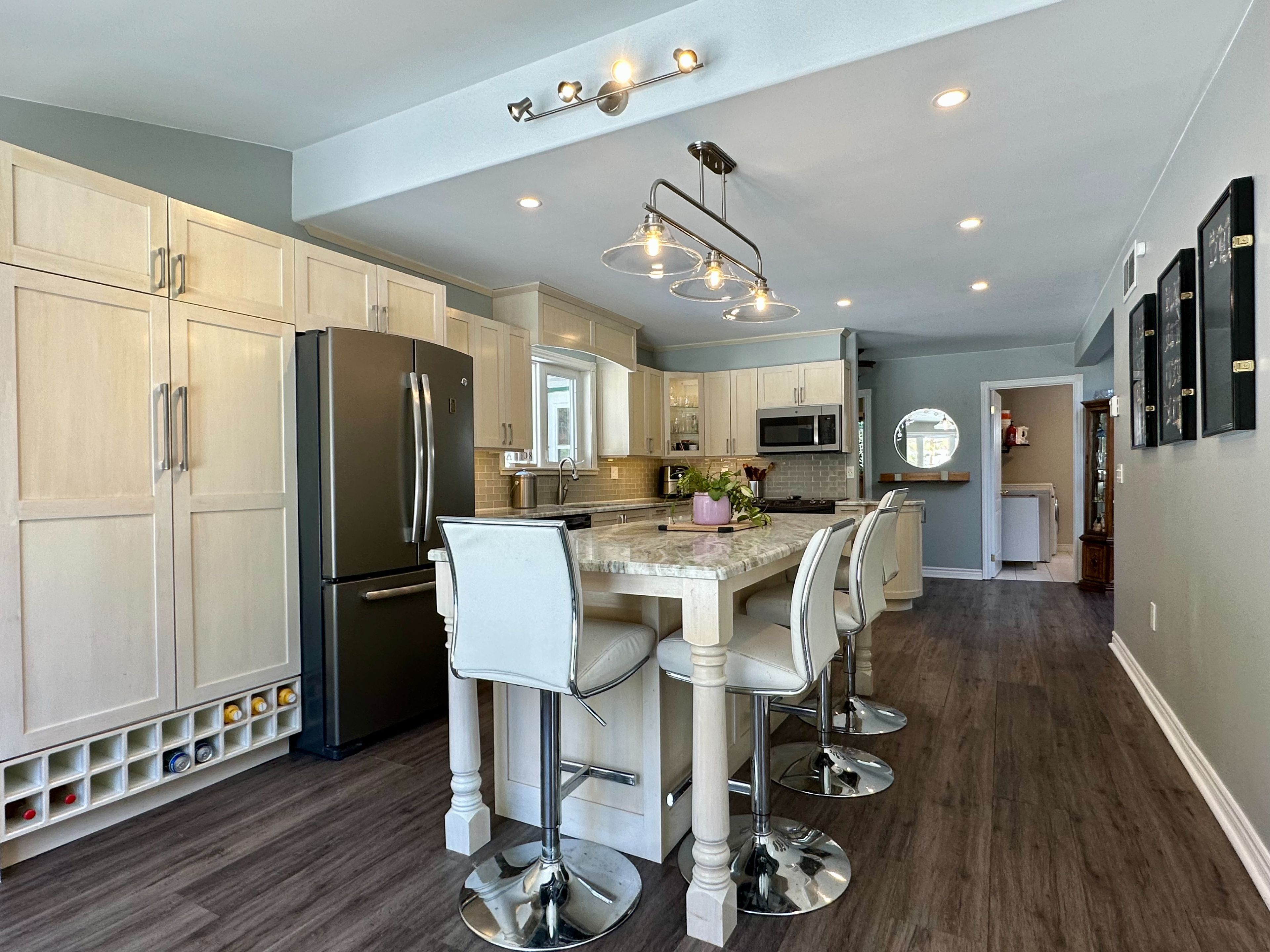 • Modern kitchen with granite countertops, large island, and stainless steel appliances.