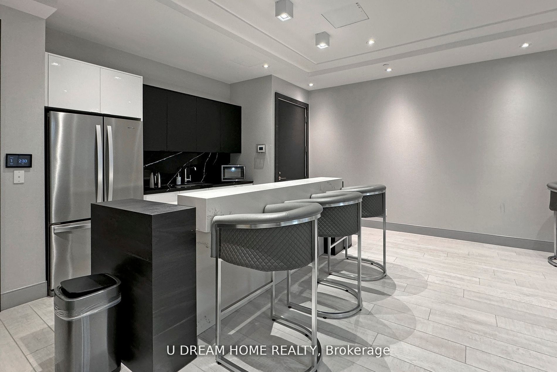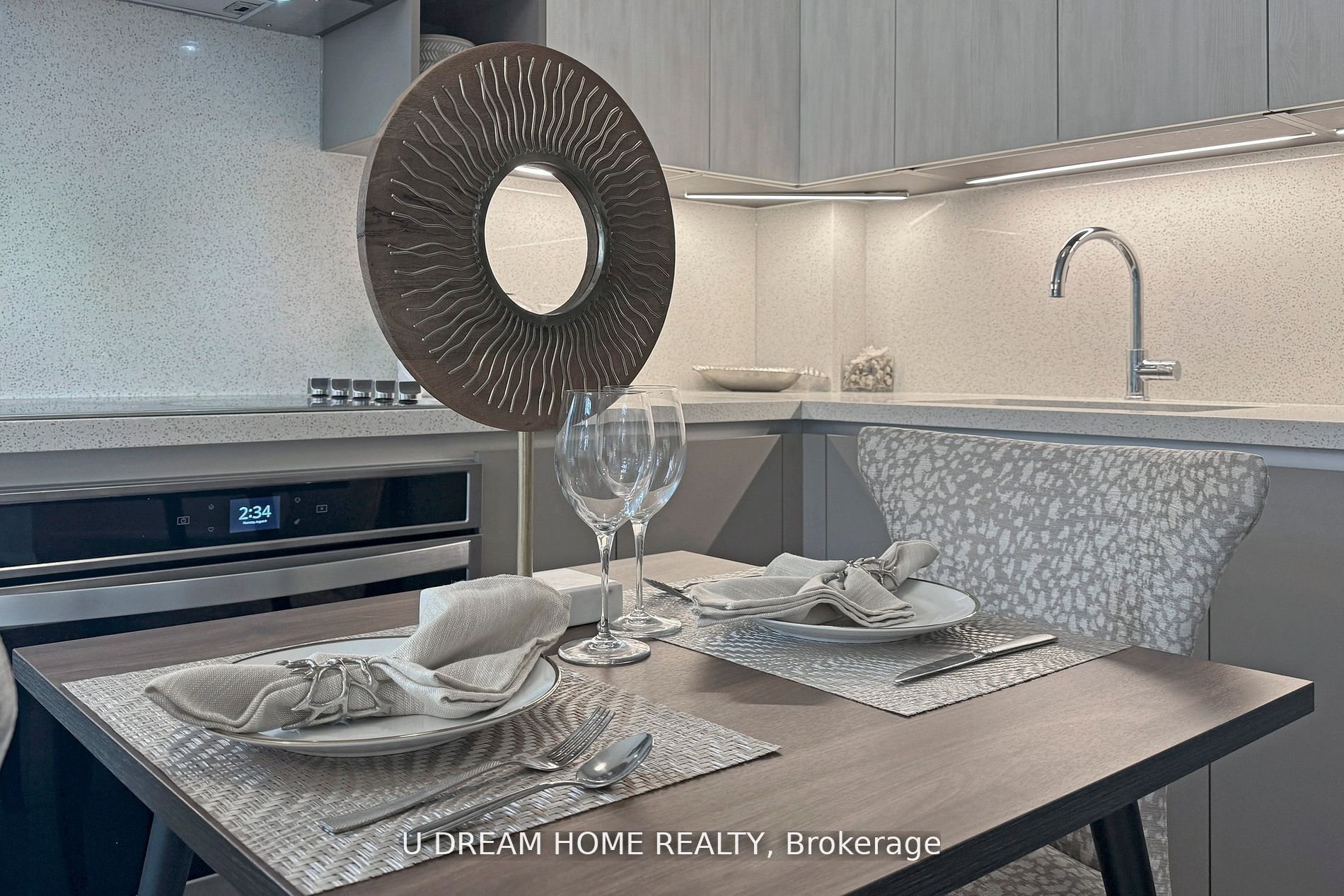• Modern kitchen featuring quartz countertops and under cabinet lighting.