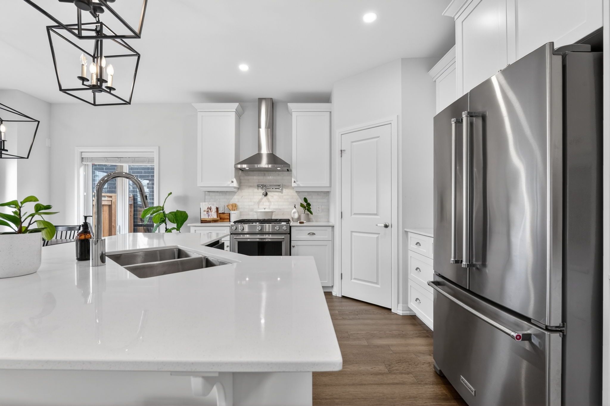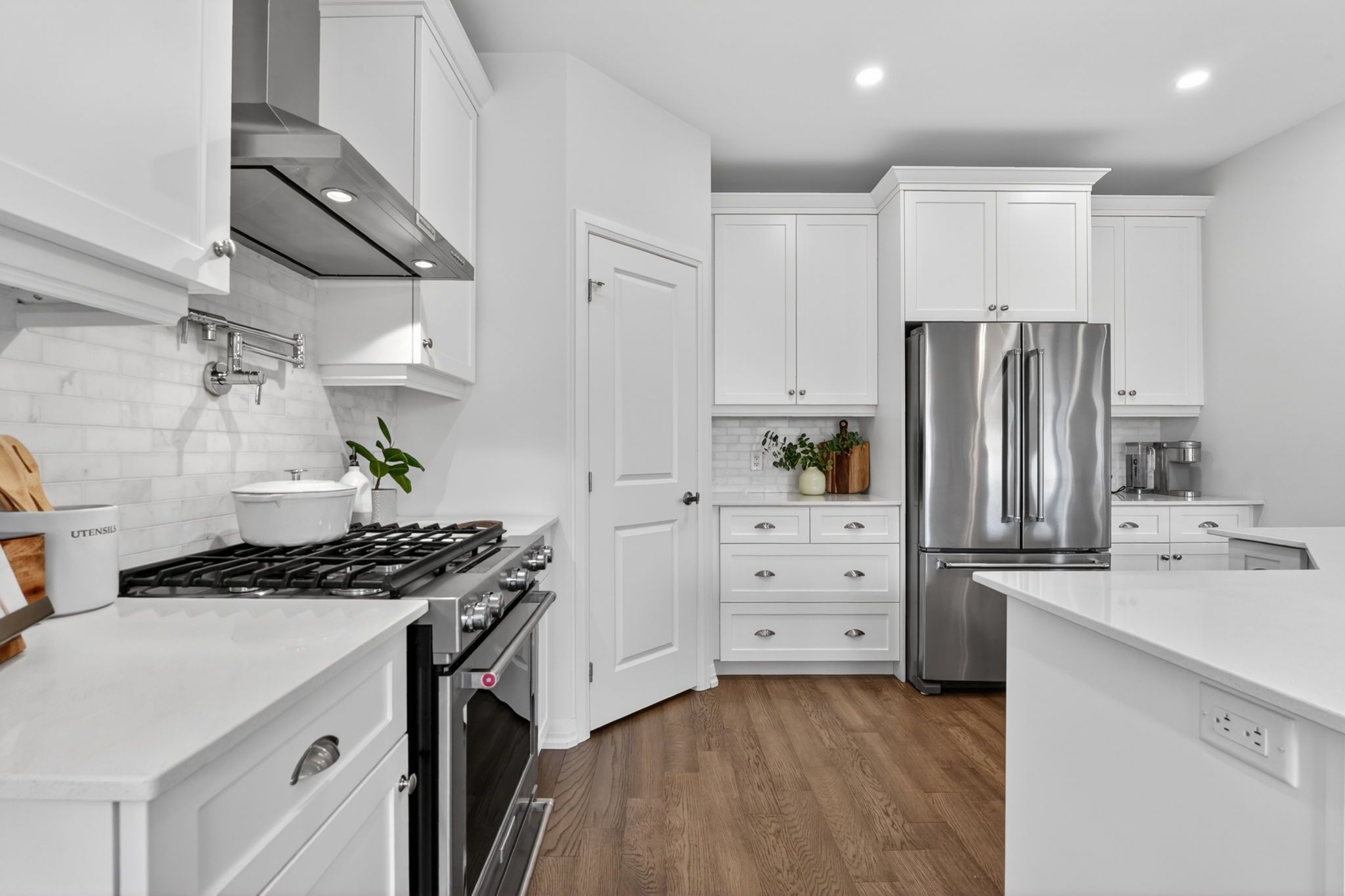 • Impressive kitchen includes quartz countertops and a gas range with pot filler.