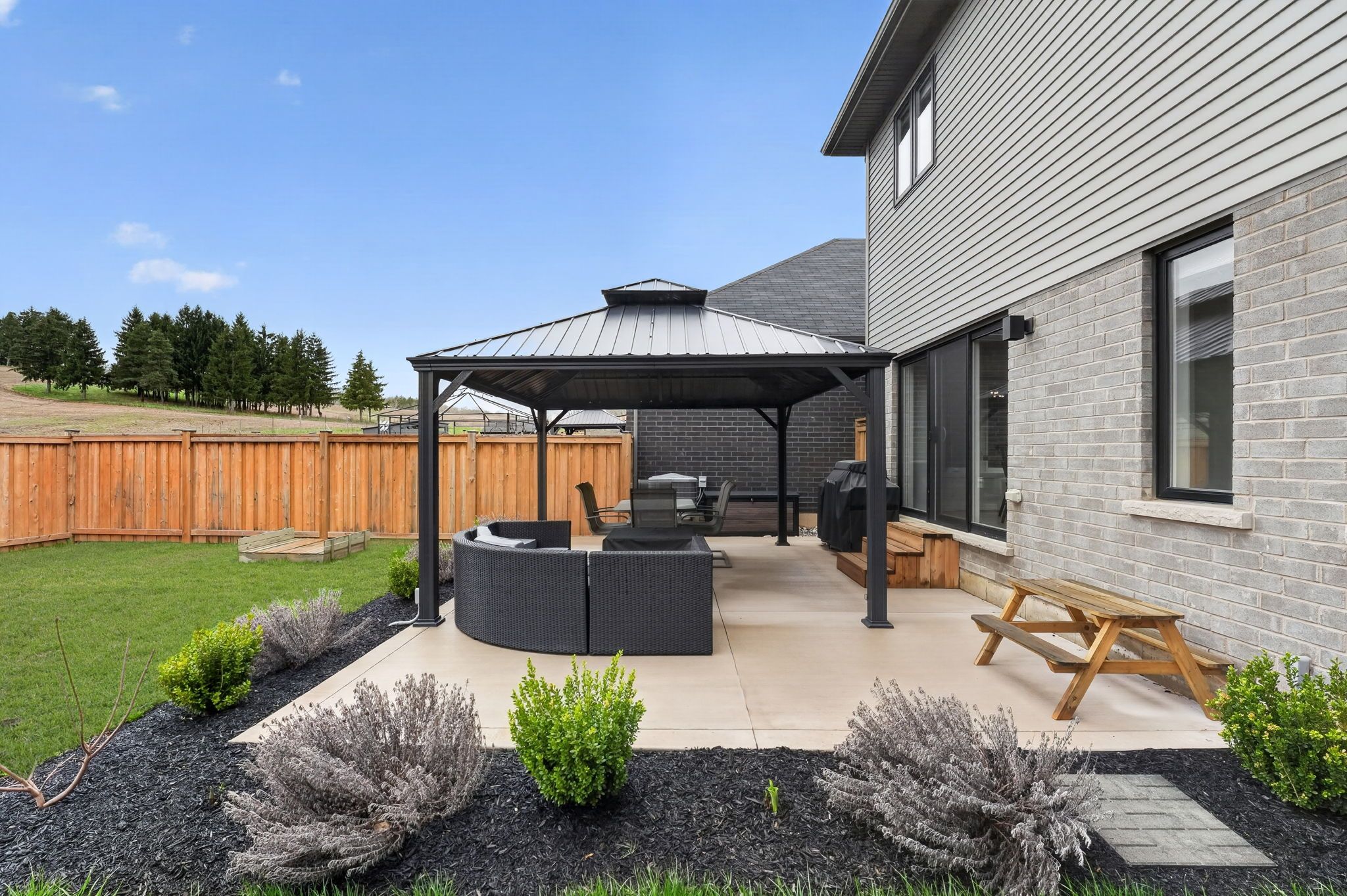 • Private backyard oasis with a concrete patio and stunning farmland views.