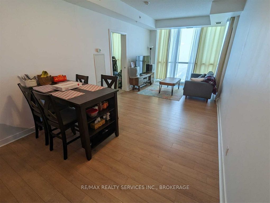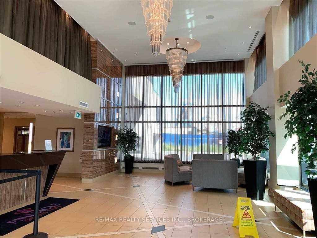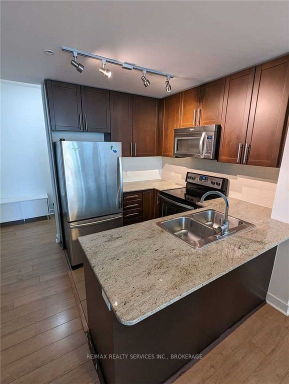 Upscale condo! This beautiful and bright unit features 9ft ceiling, modern kitchen, stainless steel appliances, granite countertops. Beautiful engineered wood floors. Large balcony and unobstructed view of the toronto skyline and lake. Walking distanceto sq 1, library, ymca, transit, art centre and much more. This unit is a must see!! S/s fridge, stove, b/i dishwasher, andmicrowave, stackable washer, dryer in laundry. One parking spot, locker.