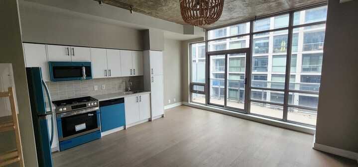 Welcome to lofts 399, a stylish loft residence in the heart of toronto's vibrant entertainment district. This bright and airy suite features soaring exposed concrete ceilings, creating an authentic urban loft feel, while floor-to-ceiling windows fill the space with natural light. The open-concept layout offers a seamless flow between the living, dining, and kitchen areas-perfect for both everyday living and entertaining. The modern kitchen is equipped with stainless steel appliances, sleek cabinetry, and contemporary finishes. A spacious bedroom with sliding closet doors provides comfort and functionality, while the versatile den is ideal for a home office or creative space. Step out onto your private balcony and take in the surrounding cityscape. Residents enjoy premium amenities including a fully equipped gym, resistance pool, landscaped courtyard with water features, billiard lounge, party room, and 24-hour concierge service. Unbeatable location just steps to ttc, top restaurants, shops, nightlife, and everything downtown toronto has to offer.