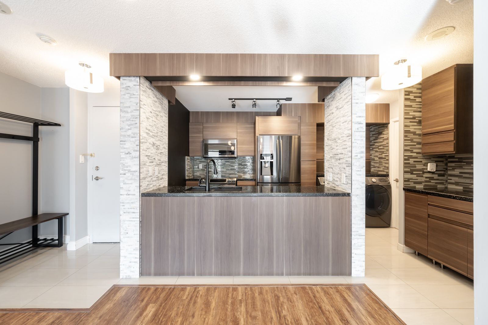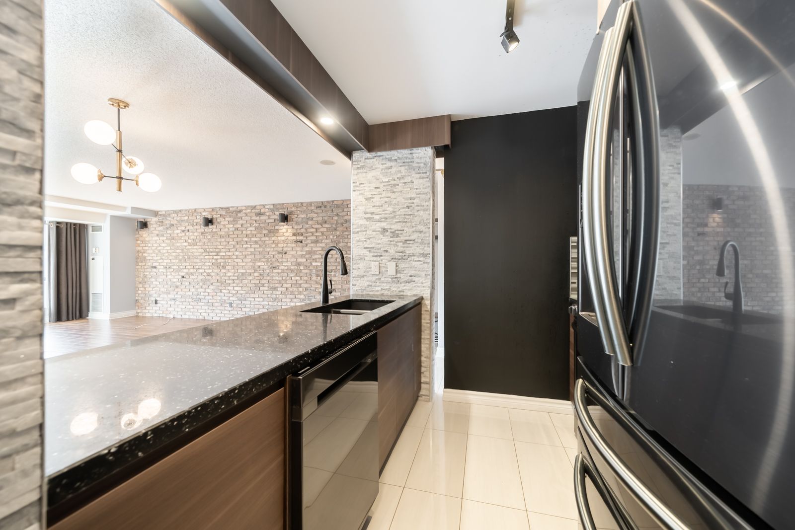 • Stylishly decorated with a trendy brick accent wall and modern kitchen.