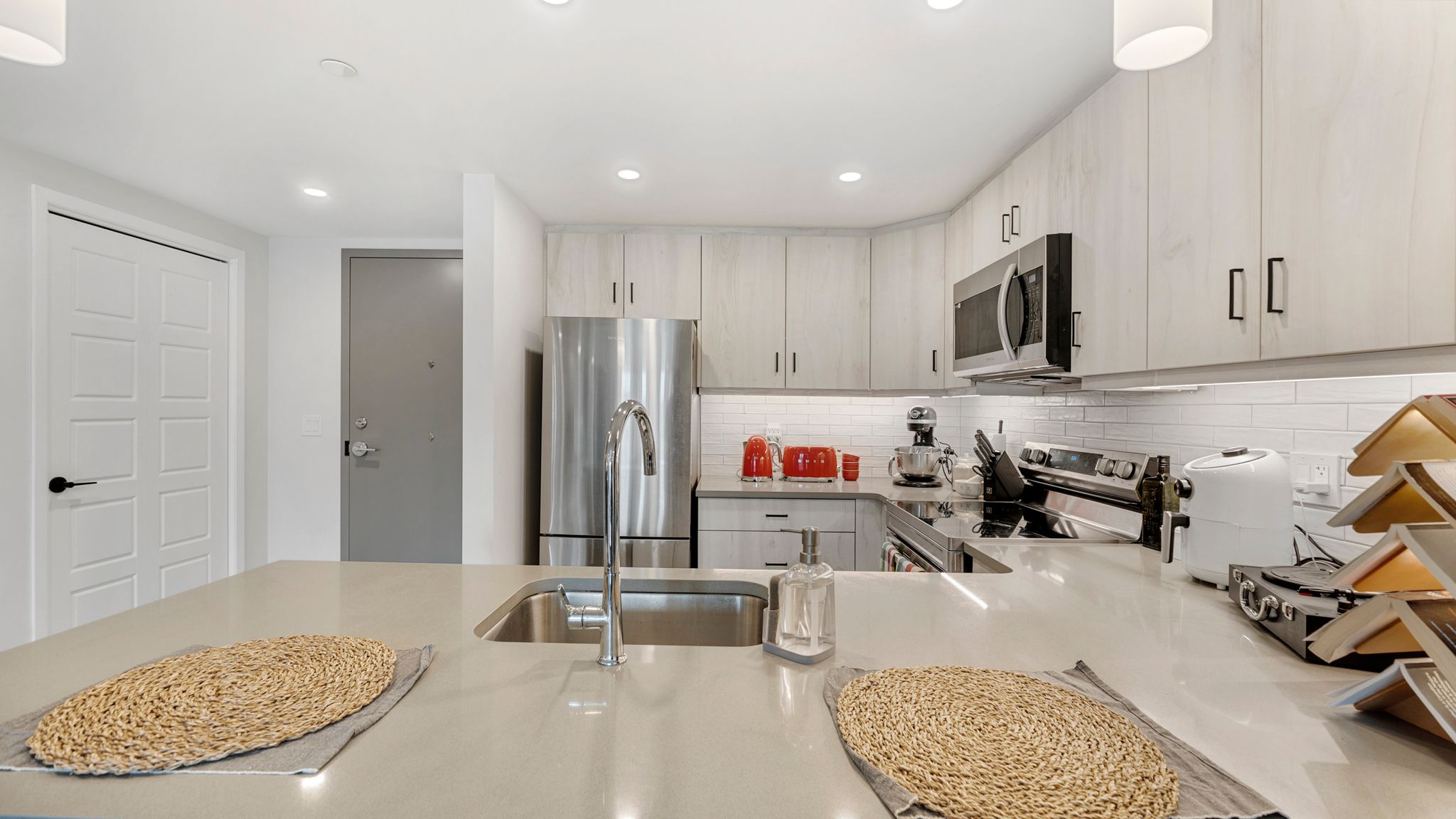 • Inviting open concept kitchen featuring sleek breakfast bar and new appliances.