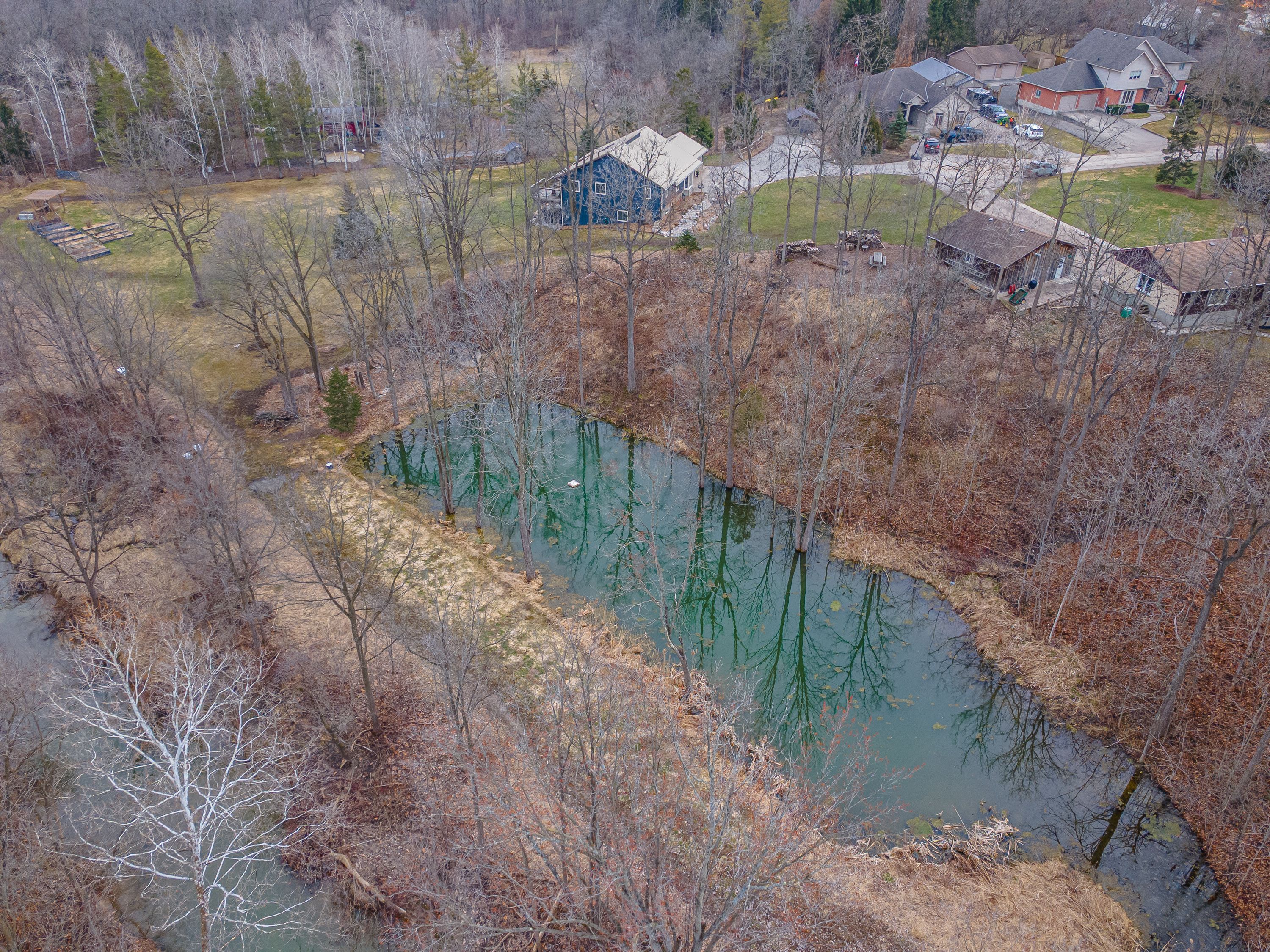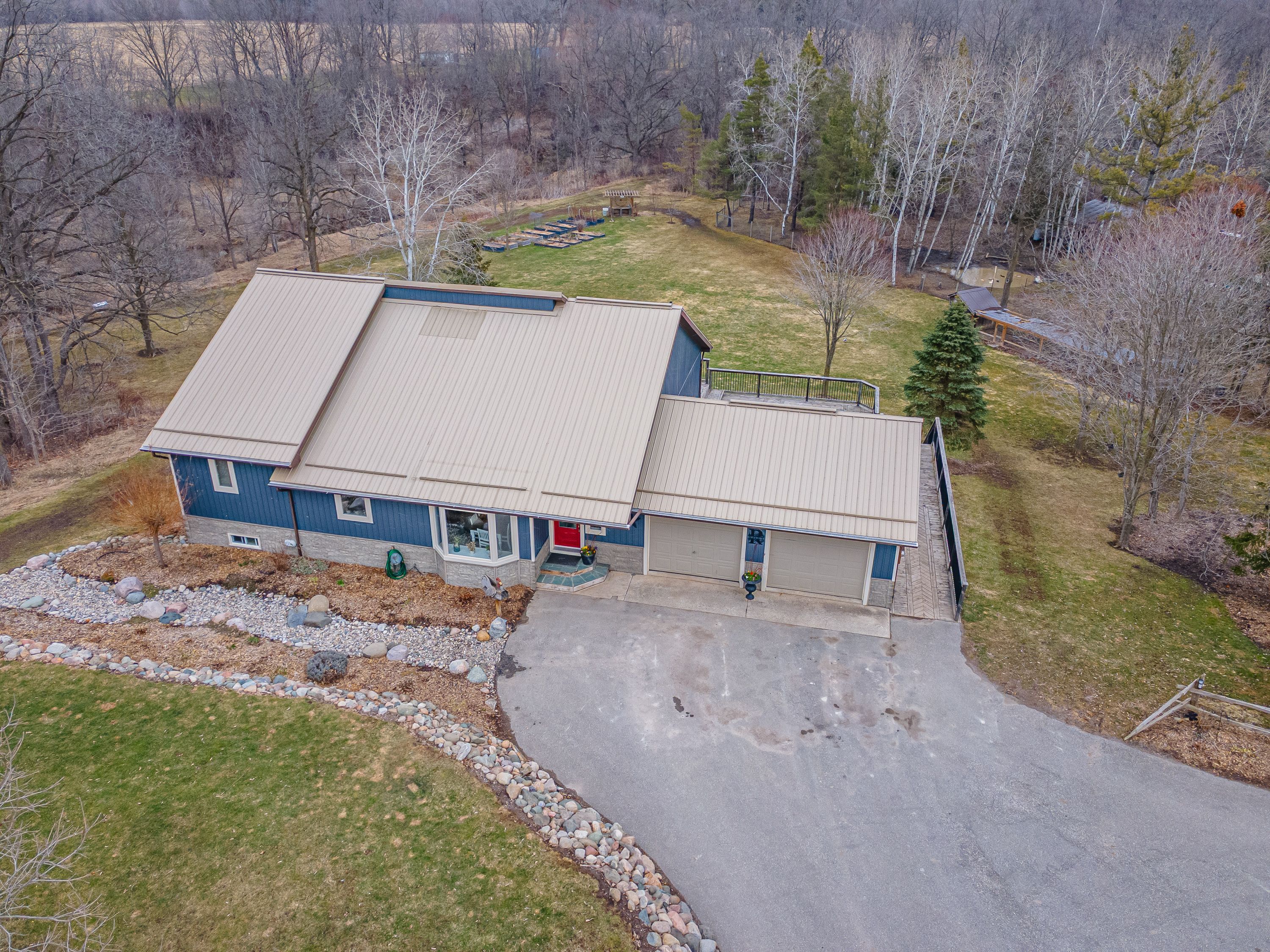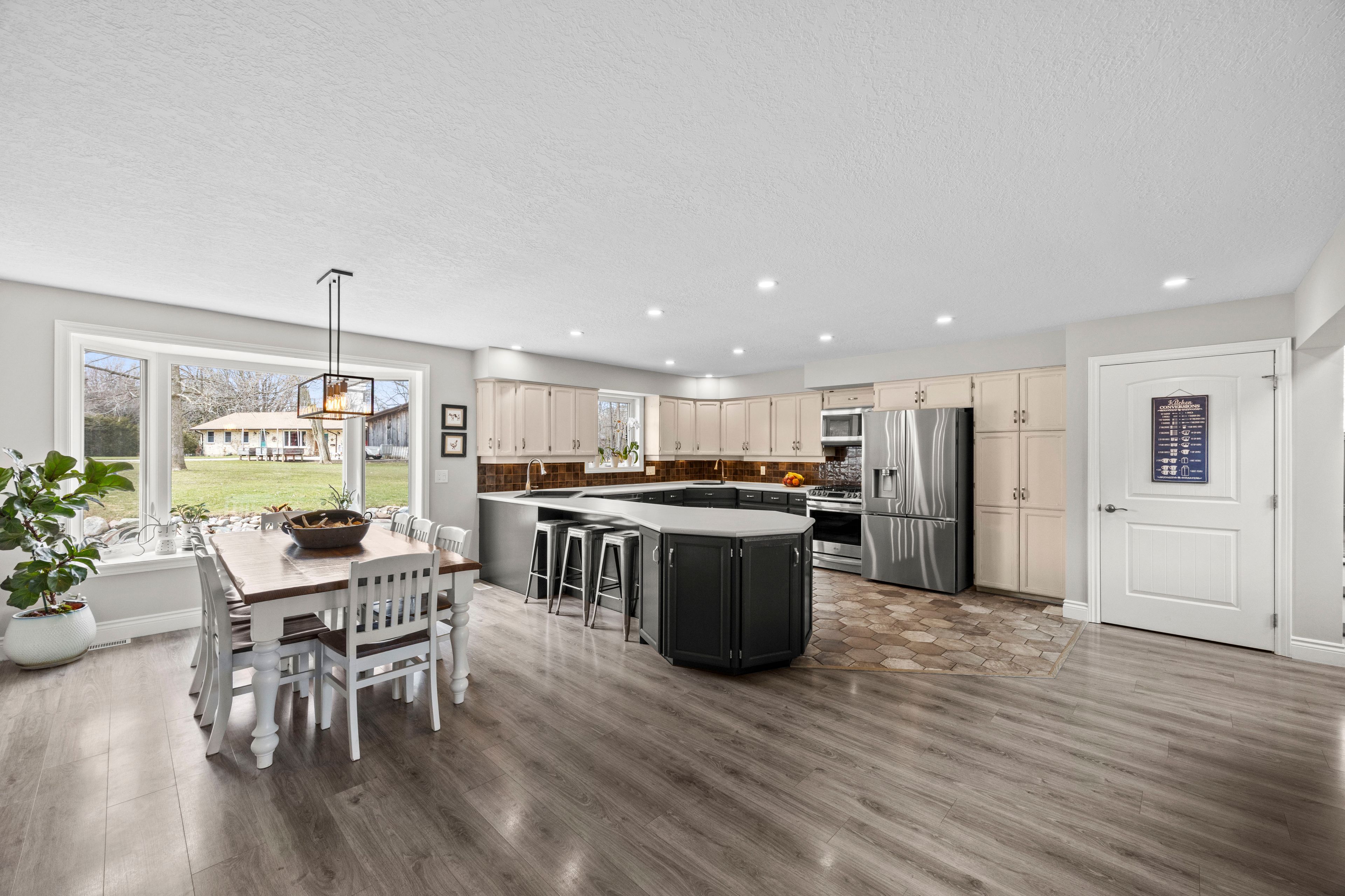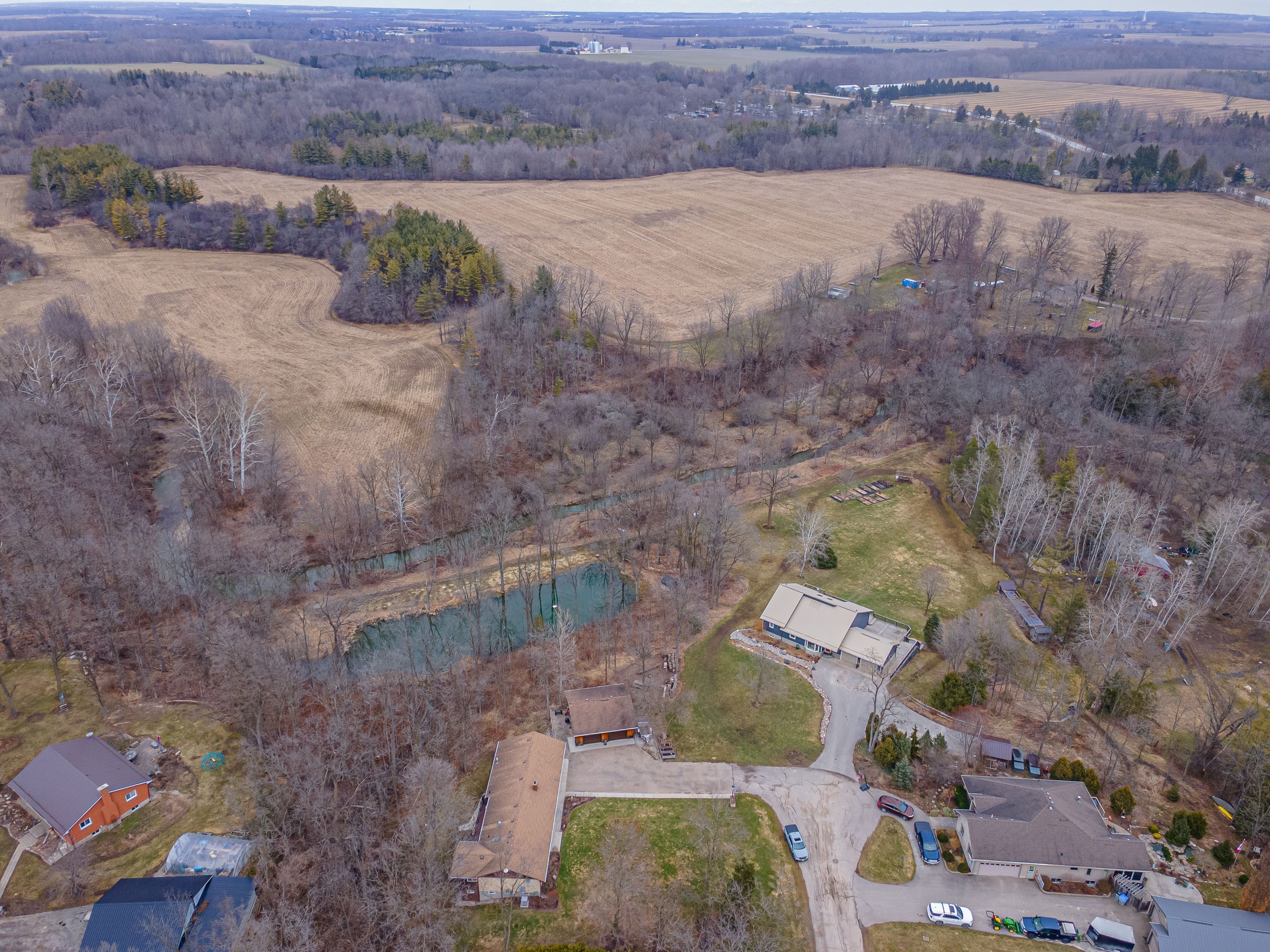 Nestled at the end of a quiet dead-end street in the charming hamlet of nairn, this private 2. 5-acre property offers exceptional peace and tranquility. Enjoy your morning coffee or an evening glass of wine on the expansive back deck or the lower-level covered patio while taking in the serene surroundings. Thoughtfully designed with 3200 sq ft of finished living space, this home features 5 spacious bedrooms, with two conveniently located on the main level and three additional bedrooms on the lower level. The primary suite is a true retreat, complete with a well-appointed 6-piece en-suite featuring a soaker tub and a generous walk-in closet. The heart of the home is an expansive open-concept kitchen, dining, and living area, ideal for both everyday living and entertaining which is enhanced by stunning views of the backyard. Skylights fill the living room with natural light, while a striking spiral staircase leads to the lower level, adding architectural elegance. Enjoy seamless indoor-outdoor living with a walkout to the upper deck from the main living area, as well as a second walkout from the lower-level rec room to the covered patio. Extensively updated in 2017, this home features many significant improvements, including most windows and doors, bathrooms, and hvac, among others. A heated 2-car garage adds comfort and convenience for year-round use. Outdoors, the beautifully landscaped grounds offer a truly unique lifestyle. A custom-built pond provides enjoyment in every season, perfect for summer swimming and winter skating, while garden boxes and chicken coops add to the property's charm. Backing onto open space and a small stream, the setting creates a private, picturesque retreat just minutes from everyday amenities. This home is walking distance to the elementary school, local park and a short 5 minute drive to ailsa craig and 20 minutes to london. This is a rare opportunity to own a one-of-a-kind home where comfort, style, and nature come together.