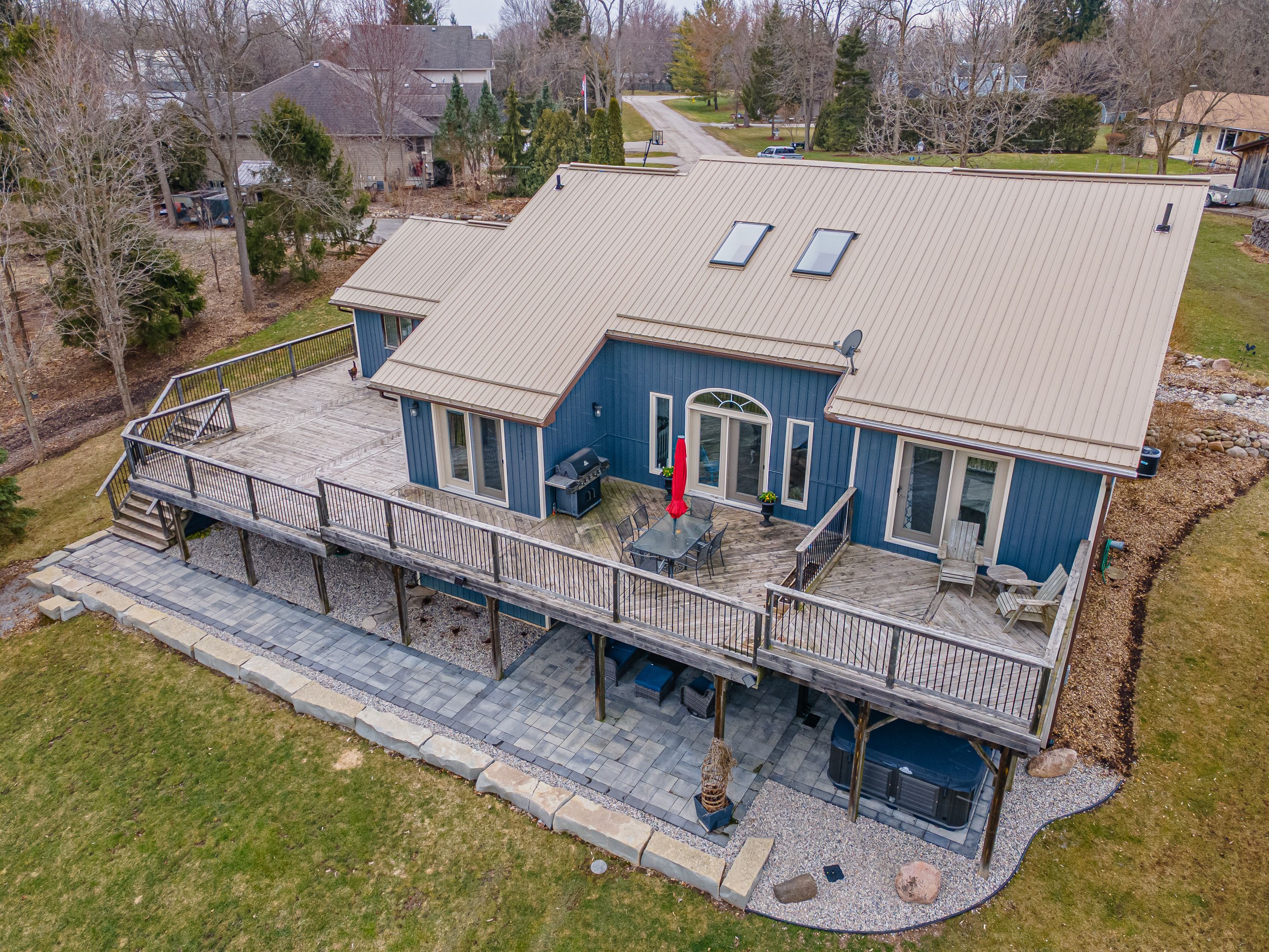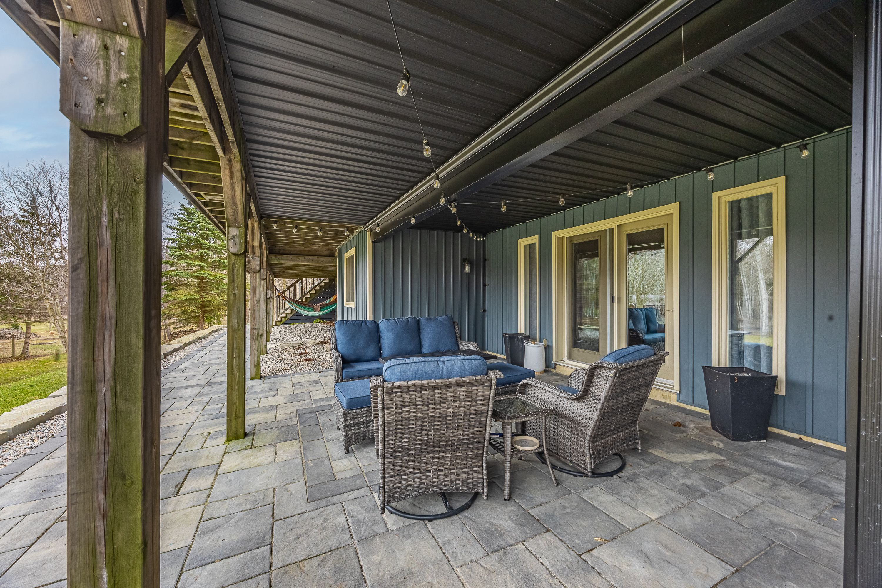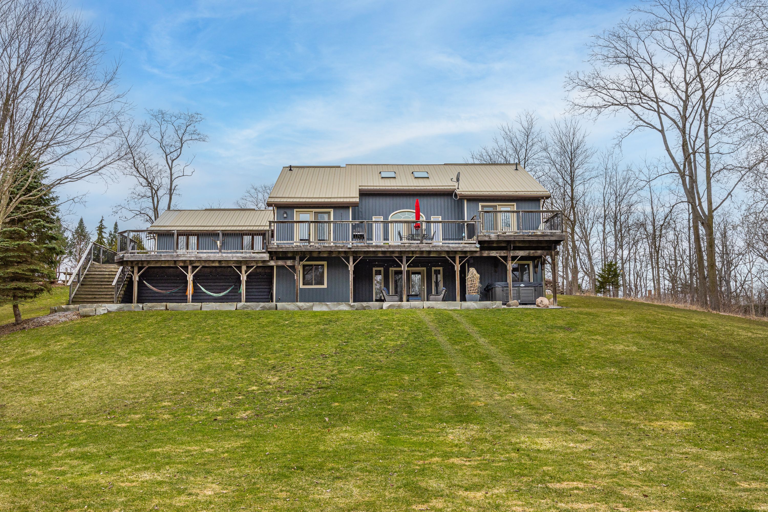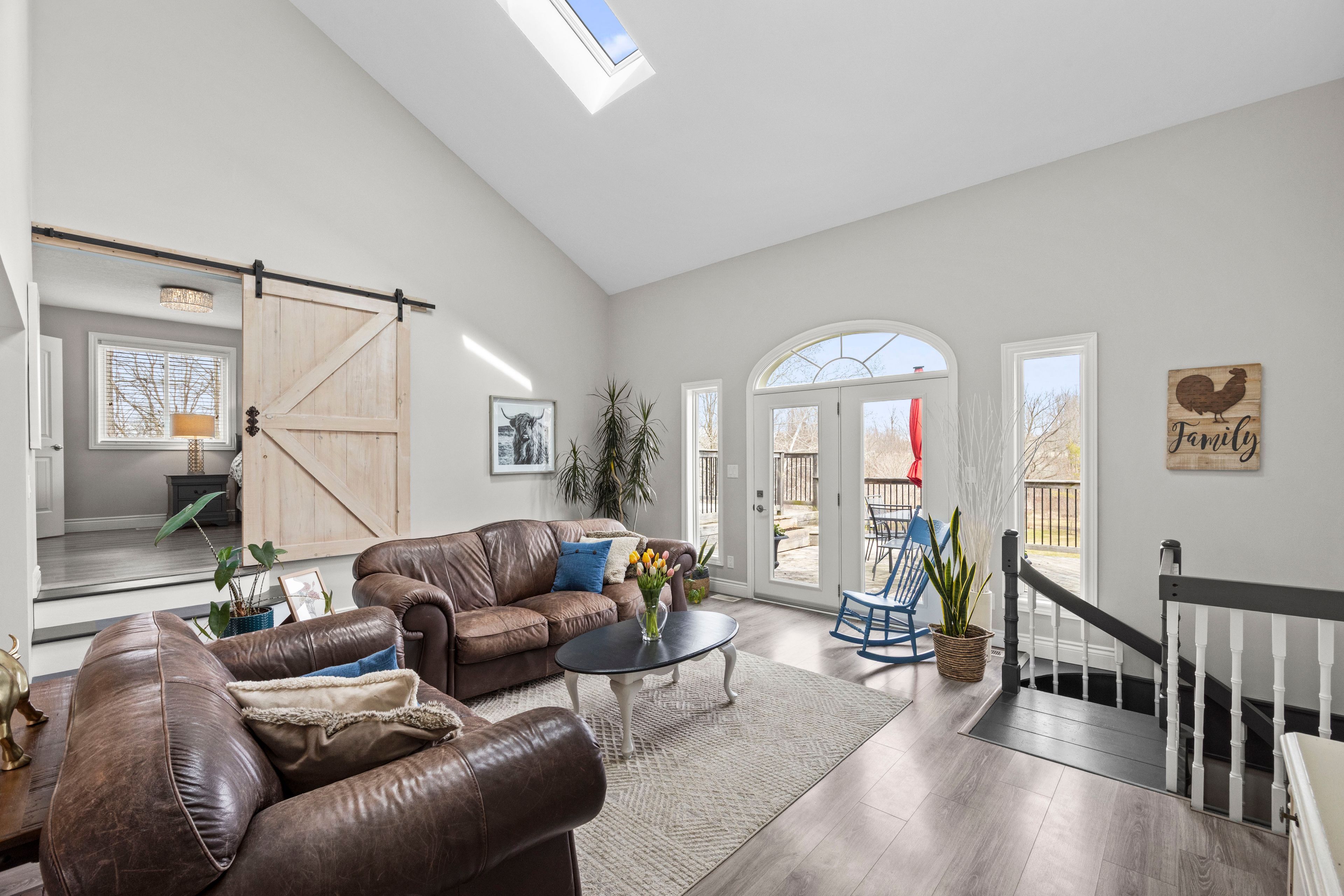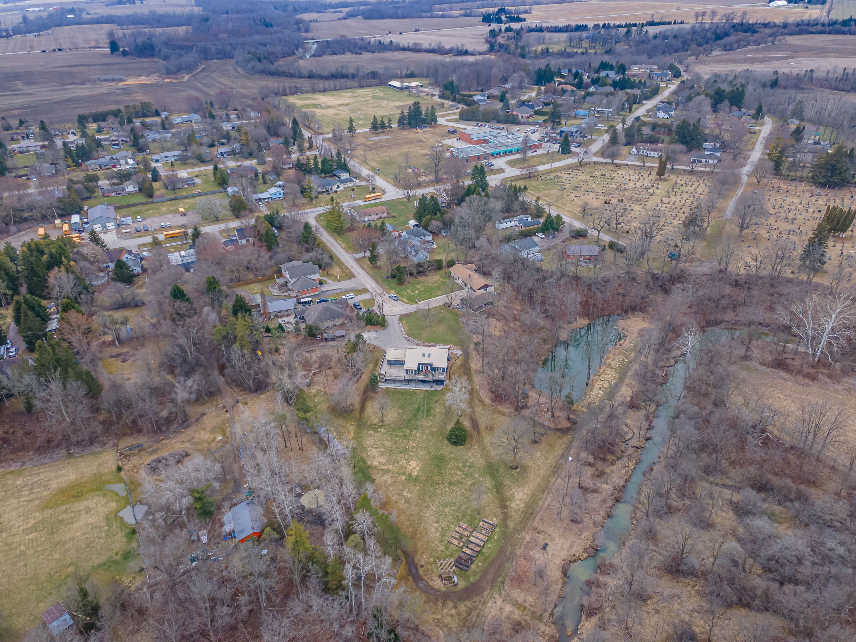 Nestled at the end of a quiet dead-end street in the charming hamlet of nairn, this private 2. 5-acre property offers exceptional peace and tranquility. Enjoy your morning coffee or an evening glass of wine on the expansive back deck or the lower-level covered patio while taking in the serene surroundings. Thoughtfully designed with 3200 sq ft of finished living space, this home features 5 spacious bedrooms, with two conveniently located on the main level and three additional bedrooms on the lower level. The primary suite is a true retreat, complete with a well-appointed 6-piece en-suite featuring a soaker tub and a generous walk-in closet. The heart of the home is an expansive open-concept kitchen, dining, and living area, ideal for both everyday living and entertaining which is enhanced by stunning views of the backyard. Skylights fill the living room with natural light, while a striking spiral staircase leads to the lower level, adding architectural elegance. Enjoy seamless indoor-outdoor living with a walkout to the upper deck from the main living area, as well as a second walkout from the lower-level rec room to the covered patio. Extensively updated in 2017, this home features many significant improvements, including most windows and doors, bathrooms, and hvac, among others. A heated 2-car garage adds comfort and convenience for year-round use. Outdoors, the beautifully landscaped grounds offer a truly unique lifestyle. A custom-built pond provides enjoyment in every season, perfect for summer swimming and winter skating, while garden boxes and chicken coops add to the property's charm. Backing onto open space and a small stream, the setting creates a private, picturesque retreat just minutes from everyday amenities. This home is walking distance to the elementary school, local park and a short 5 minute drive to ailsa craig and 20 minutes to london. This is a rare opportunity to own a one-of-a-kind home where comfort, style, and nature come together.