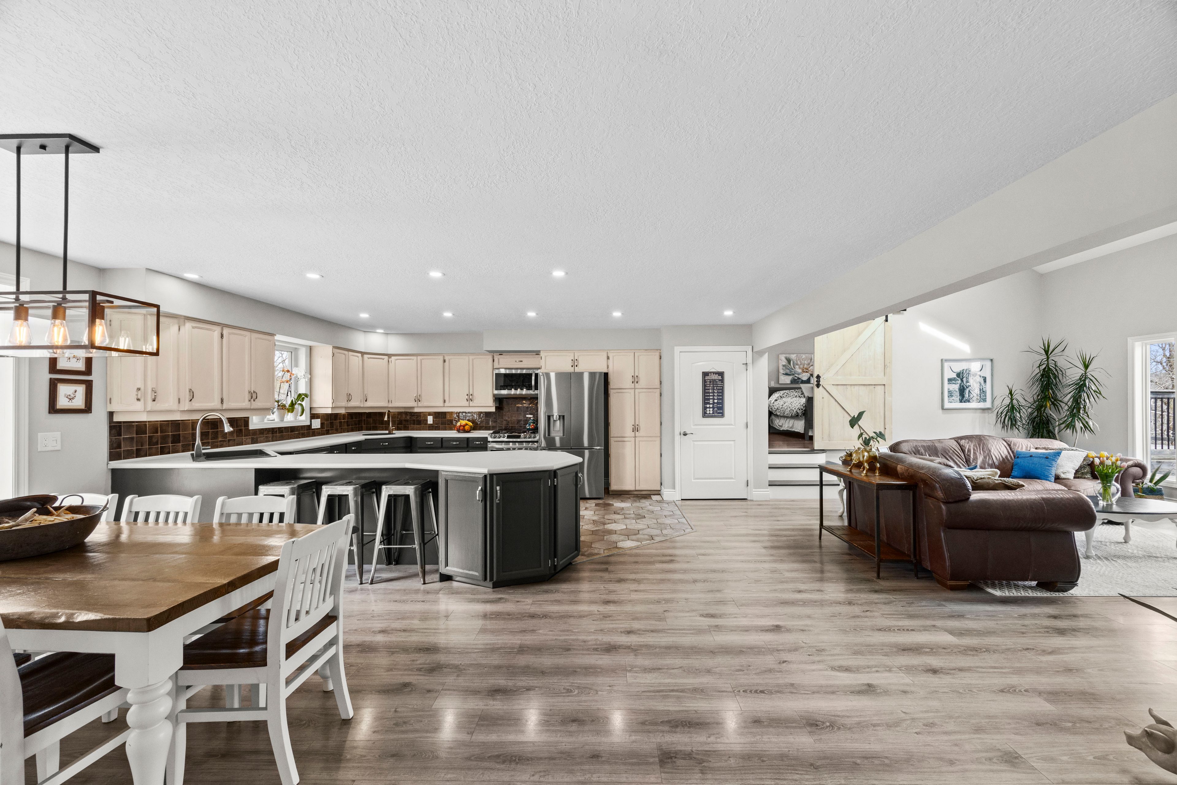 • Expansive open-concept kitchen and living area with beautiful backyard views.