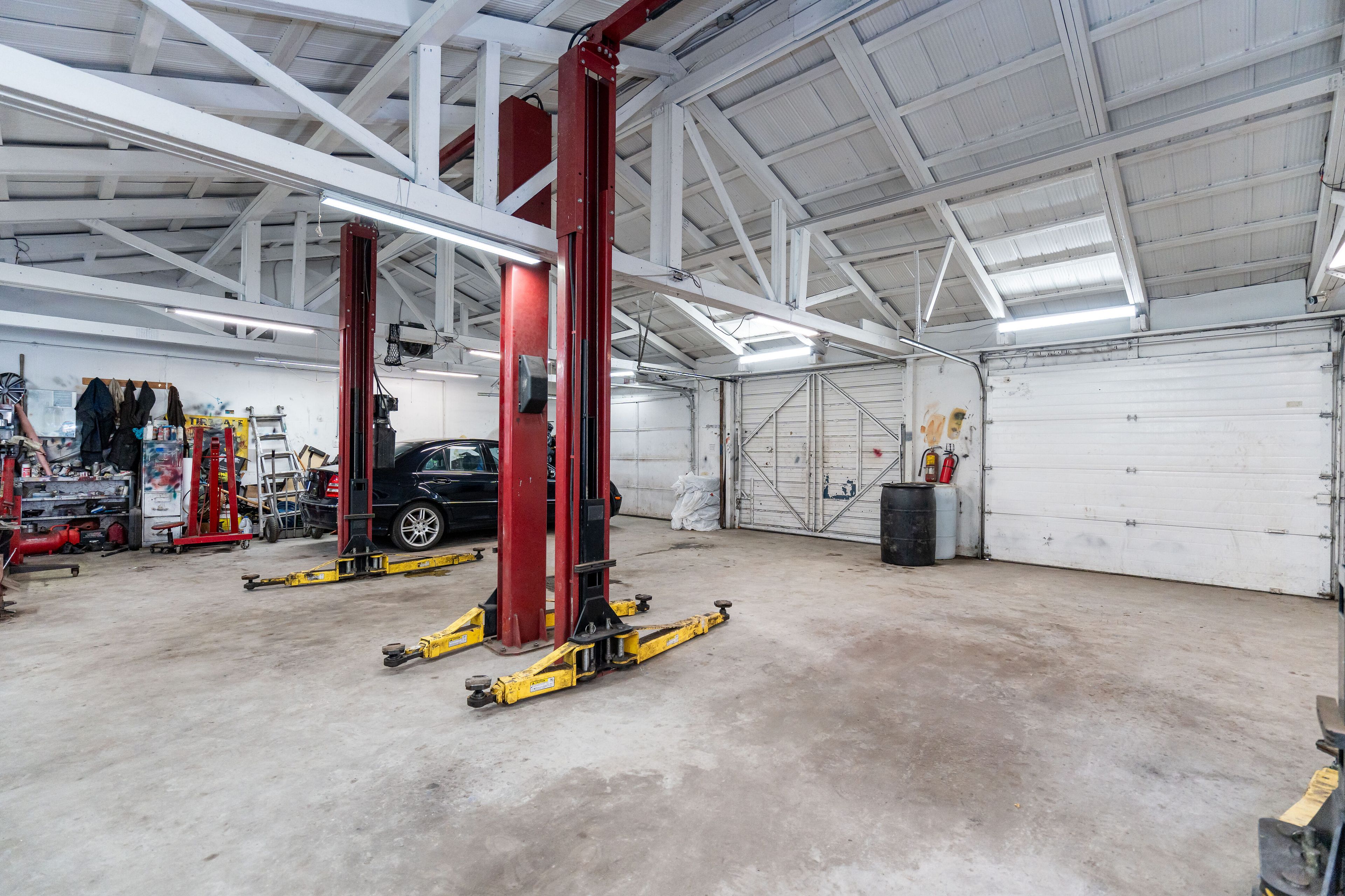• Existing automotive dealership with three drive-in garages and car lifts.