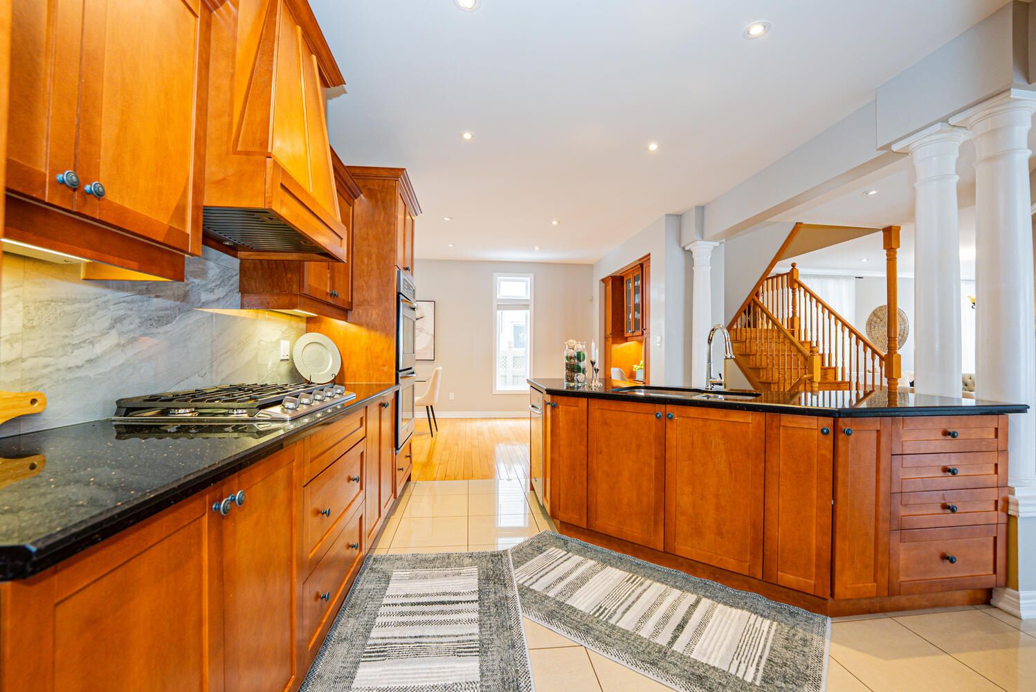 • Gourmet kitchen with large island and stainless steel appliances for cooking.