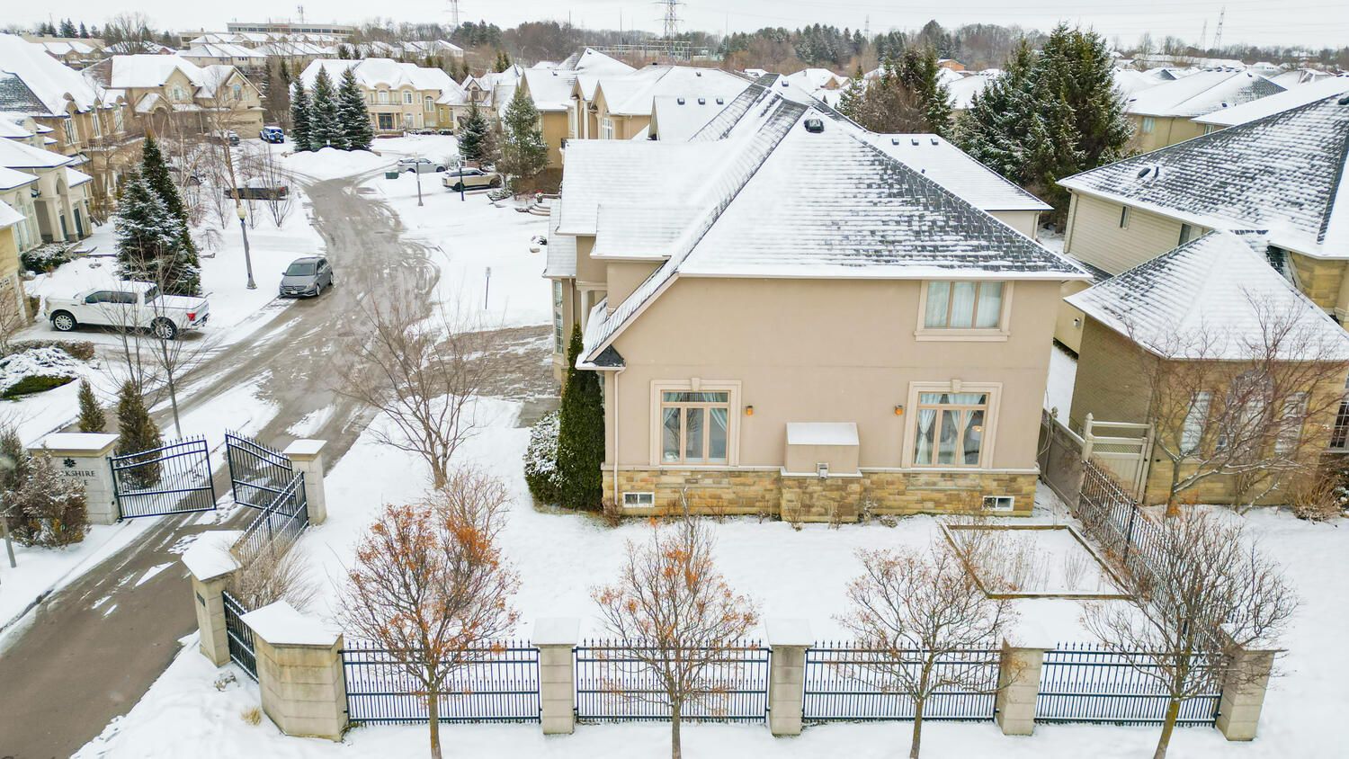 Welcome to 4 berkshire place, a spectacular custom landmart-built family home situated on a premium corner lot on one of meadowlands' most exclusive gated cul-de-sacs. This stately residence offers exceptional privacy, security, and curb appeal with its elegant royal stucco and stone exterior finishes. An impressive grand foyer with a dramatic double-height ceiling sets the tone for the luxury found throughout, while tons of large windows throughout the home fill the space with natural light. The main floor features expansive principal rooms including a separate living room, family room, formal dining room, and a private office with high ceilings and crown moulding-perfect for both everyday living and upscale entertaining. The gourmet kitchen boasts extensive cabinetry, a large working island, stainless steel appliances, and double patio doors leading to the backyard. Hardwood flooring flows throughout, complemented by a beautiful fireplace . Upstairs offers four spacious bedrooms. Three bedrooms feature private ensuites, while the fourth is serviced by a separate full washroom just outside the room. Two bedrooms include their own private office or study space within the room, and all bedrooms offer walk-in closets. The luxurious primary suite features a spa-inspired 5-piece ensuite with dual sinks and a custom-designed walk-in closet with built-in cabinetry. The fully finished basement includes two additional bedrooms and a full washroom, providing excellent space for extended family or guests, along with a separate laundry area. The home also offers two separate laundry areas for added convenience. Set on an impressive 112-foot-wide lot, the exterior is complete with professional stonework, an automatic irrigation system, covered concrete patio with bbq setup, gazebo, huge side yards, and a spacious driveway. Offering close to 5,000 sq. Ft. Of total living space, this exceptional home delivers luxury, space, and functionality in a highly sought-after location.