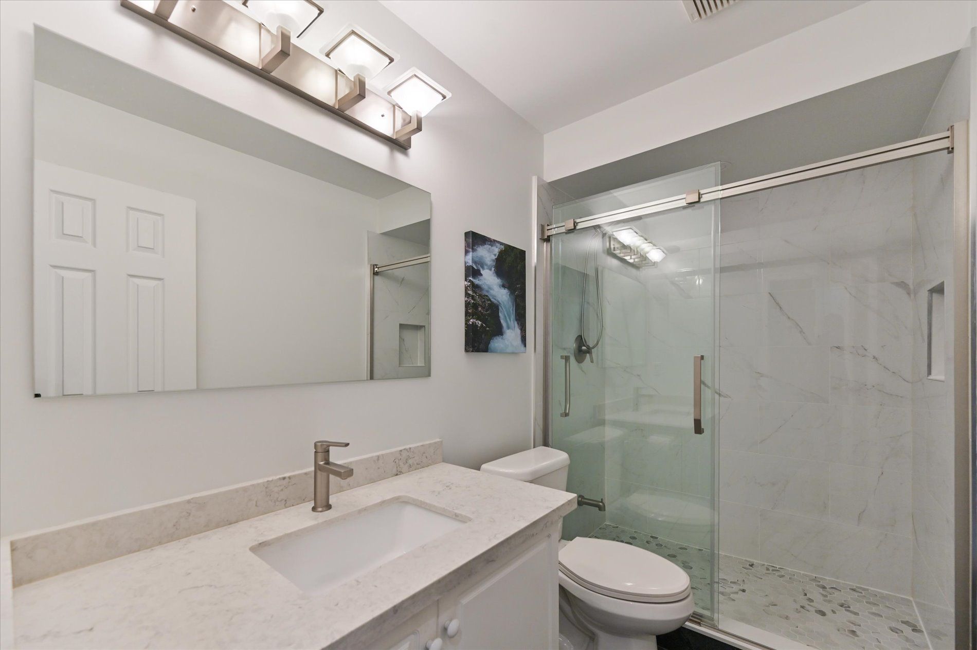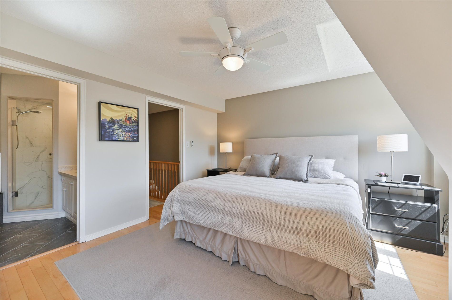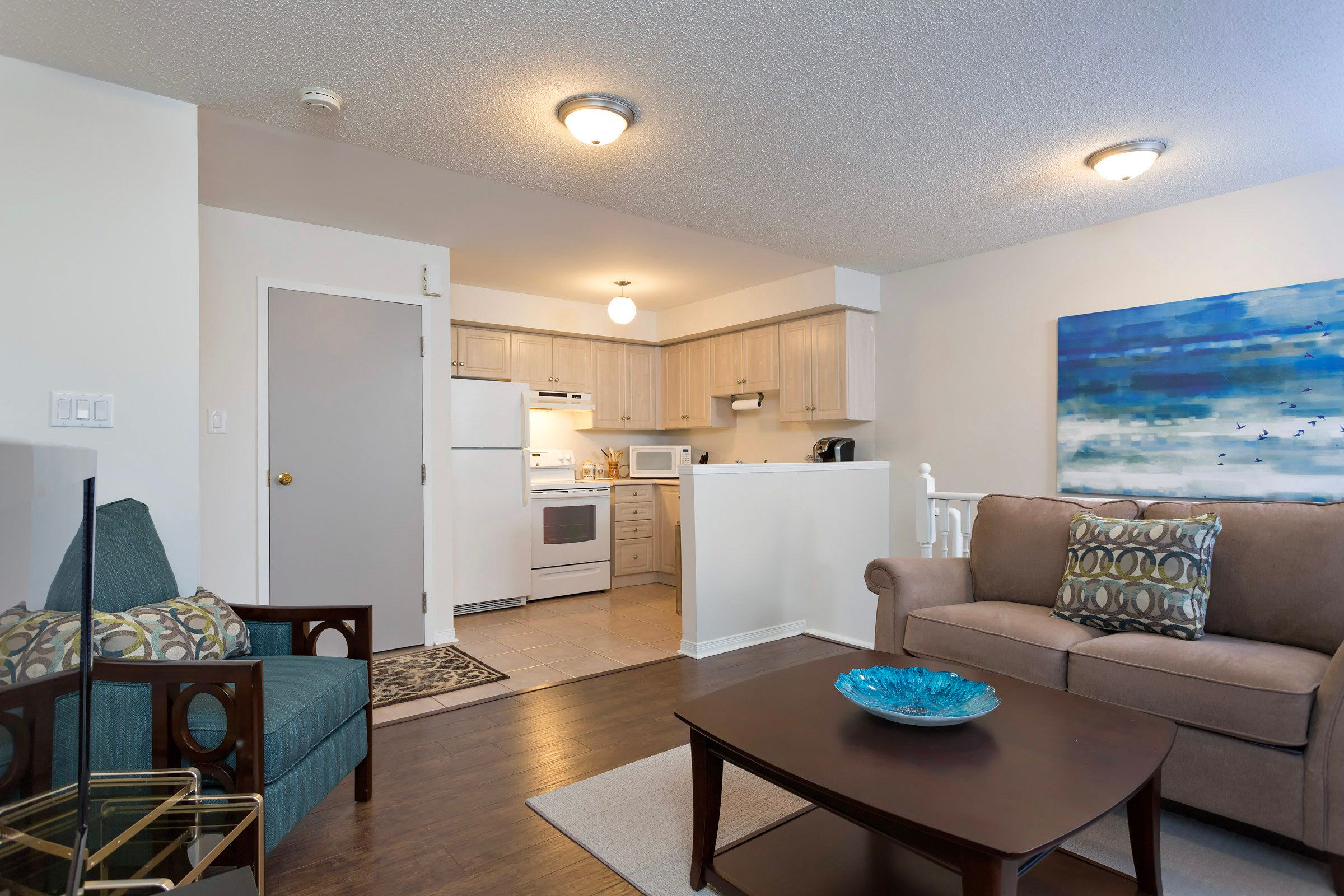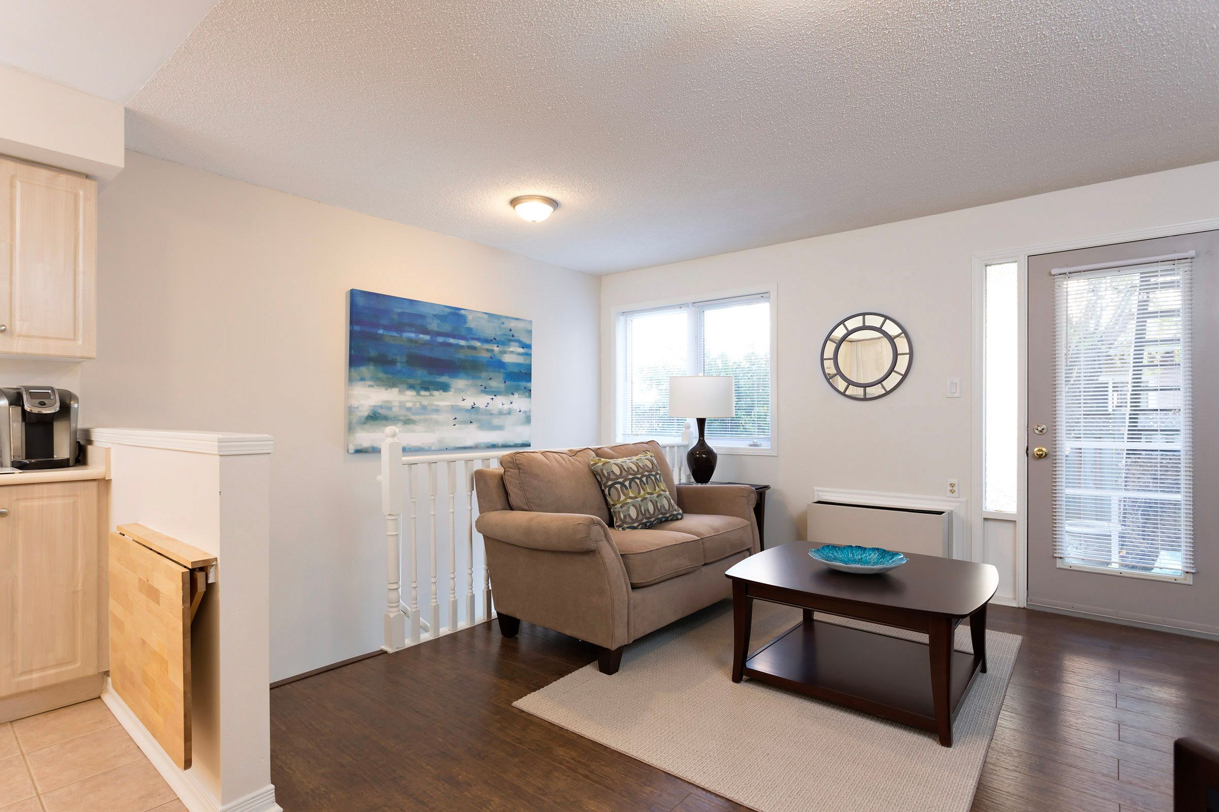 • Bright open-concept kitchen with stainless steel appliances and deck access.