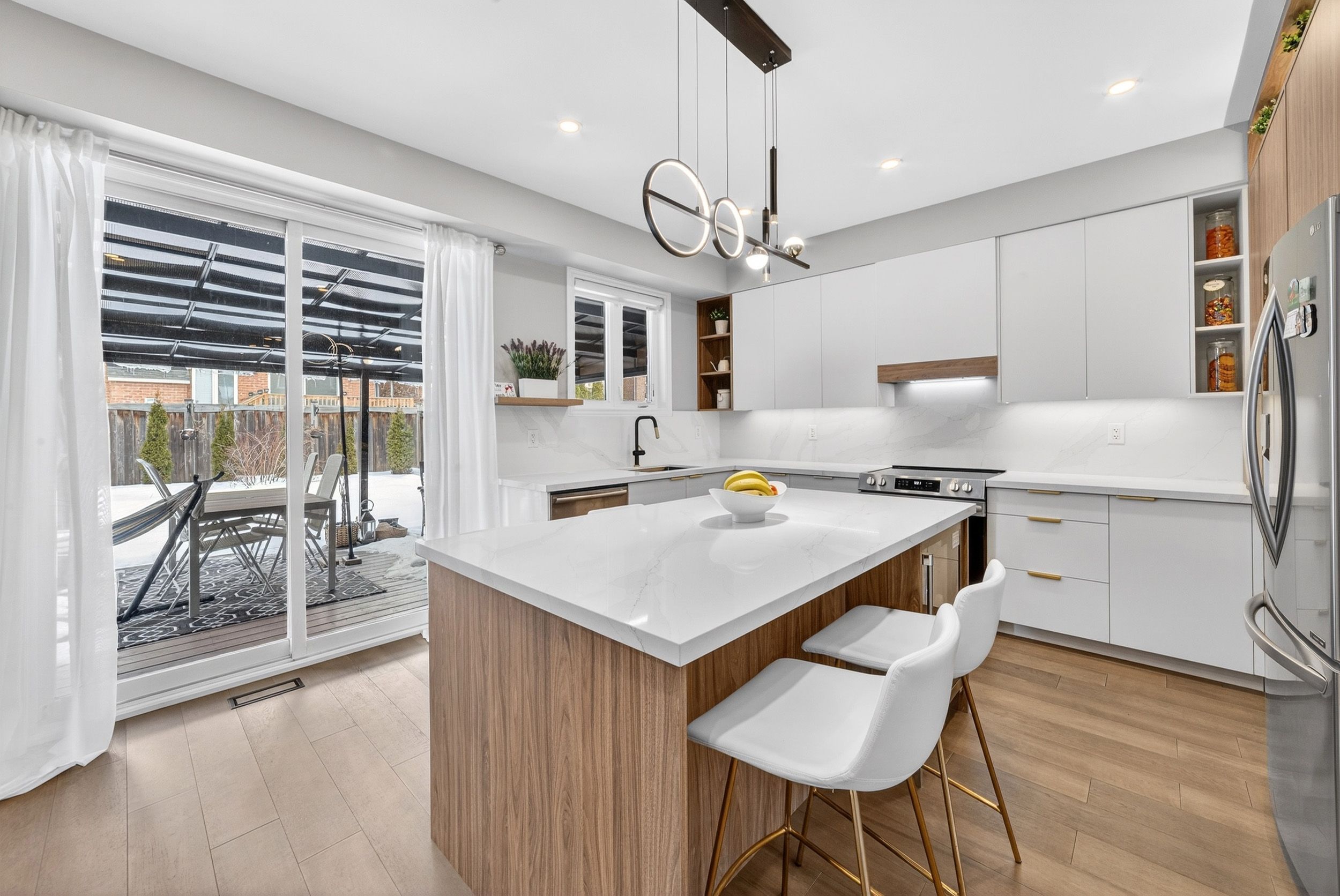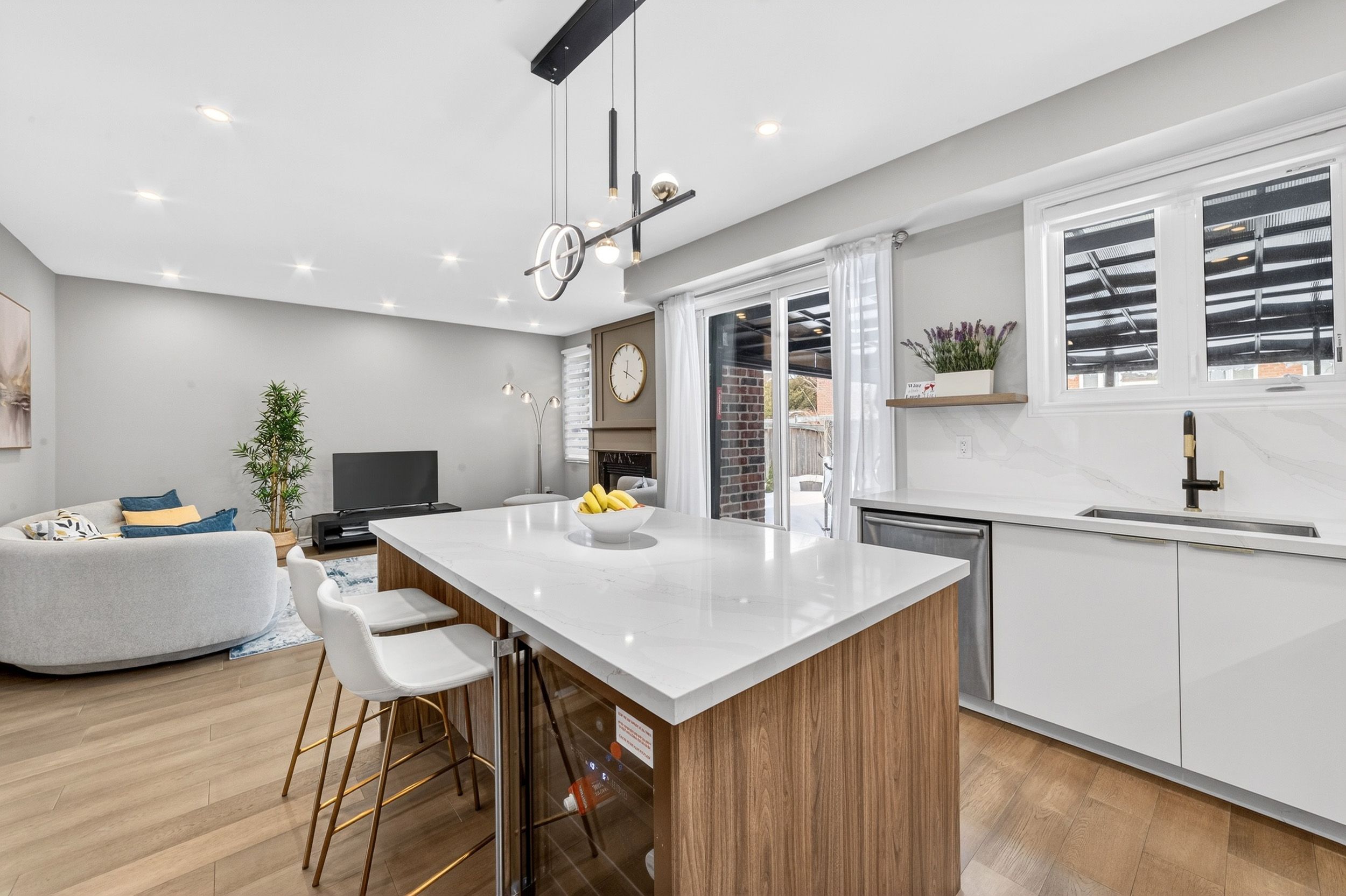 • Fully renovated kitchen with modern appliances and stone countertops.
