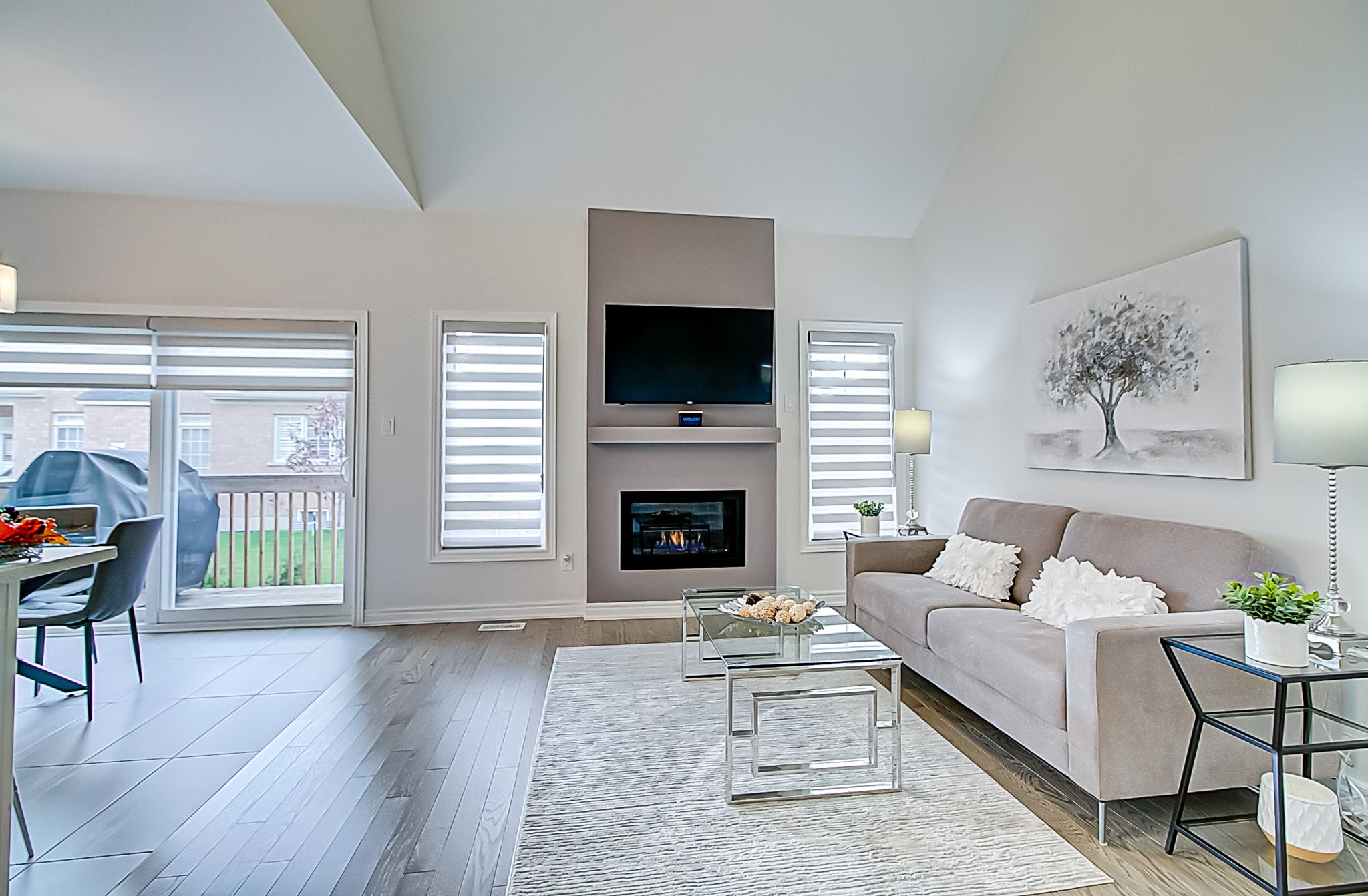 • Spacious open concept design featuring vaulted ceilings and a gas fireplace.