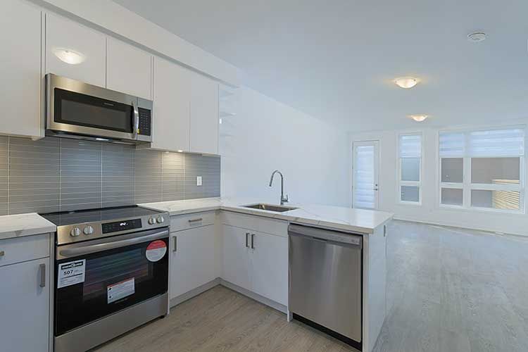 • Upscale kitchen with quartz countertops and stainless steel appliances.