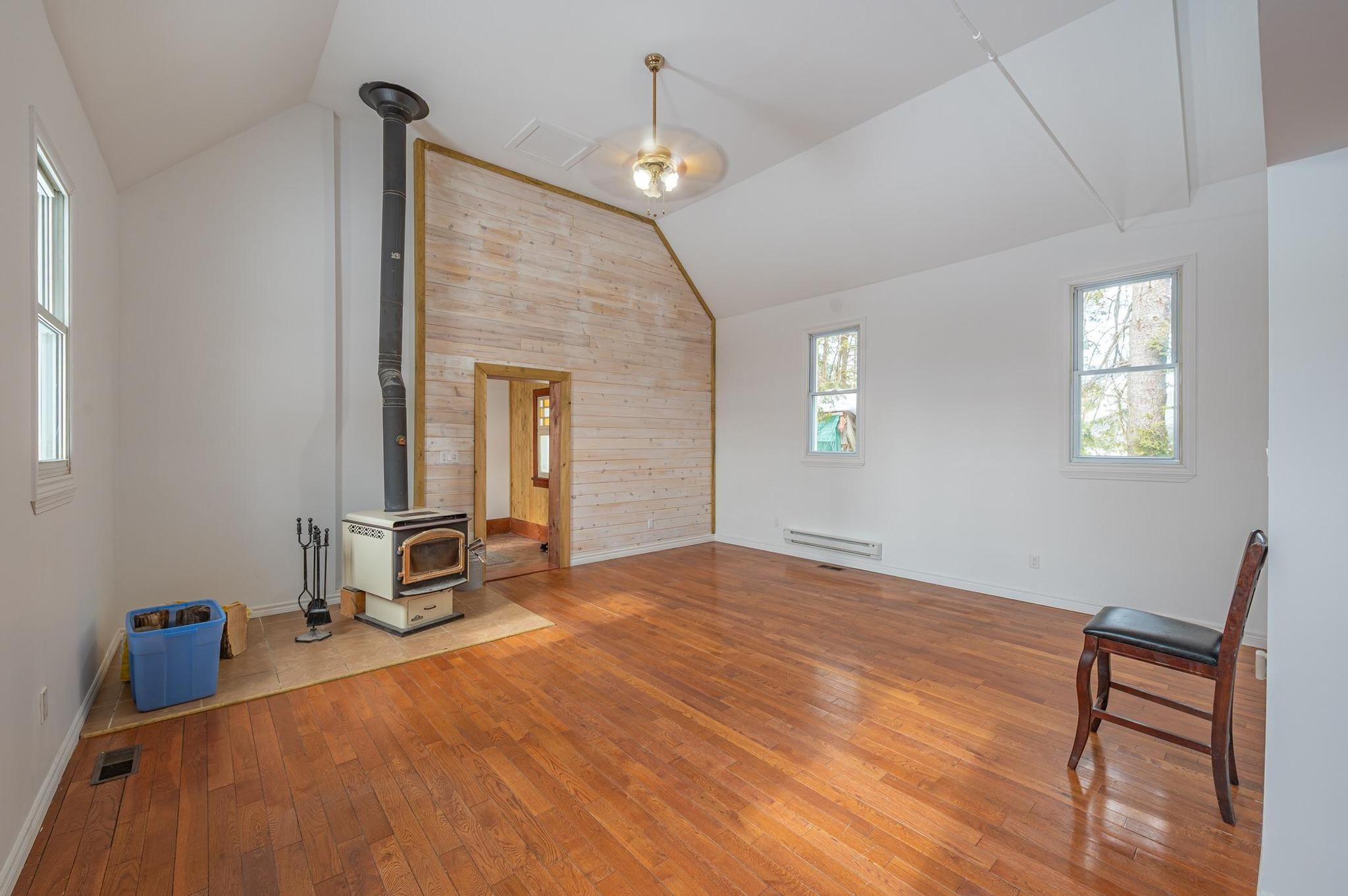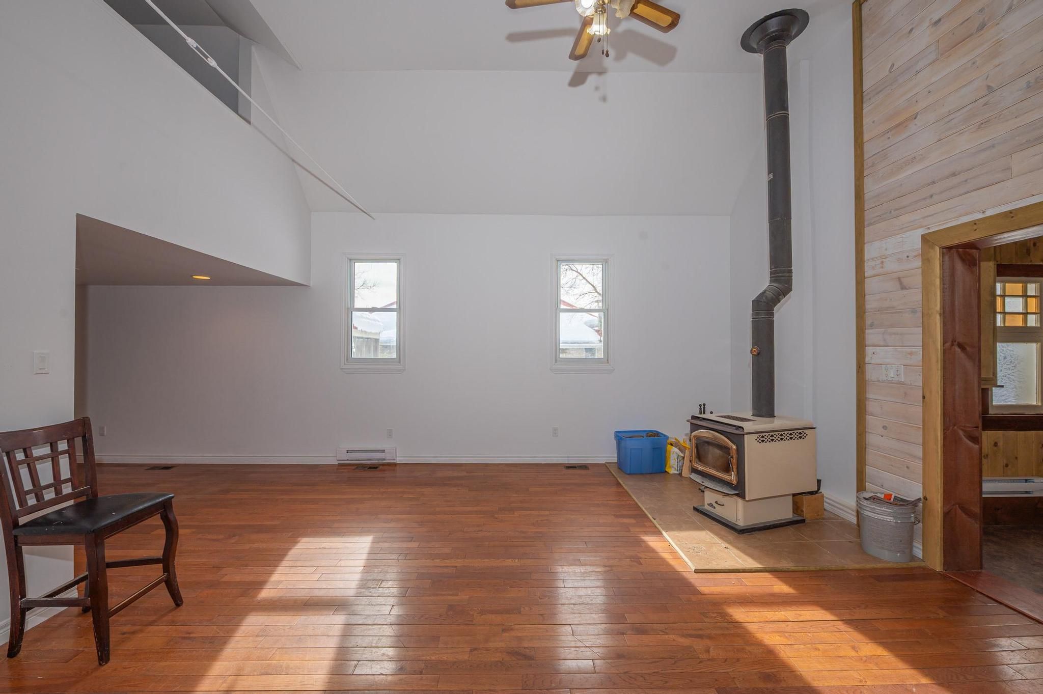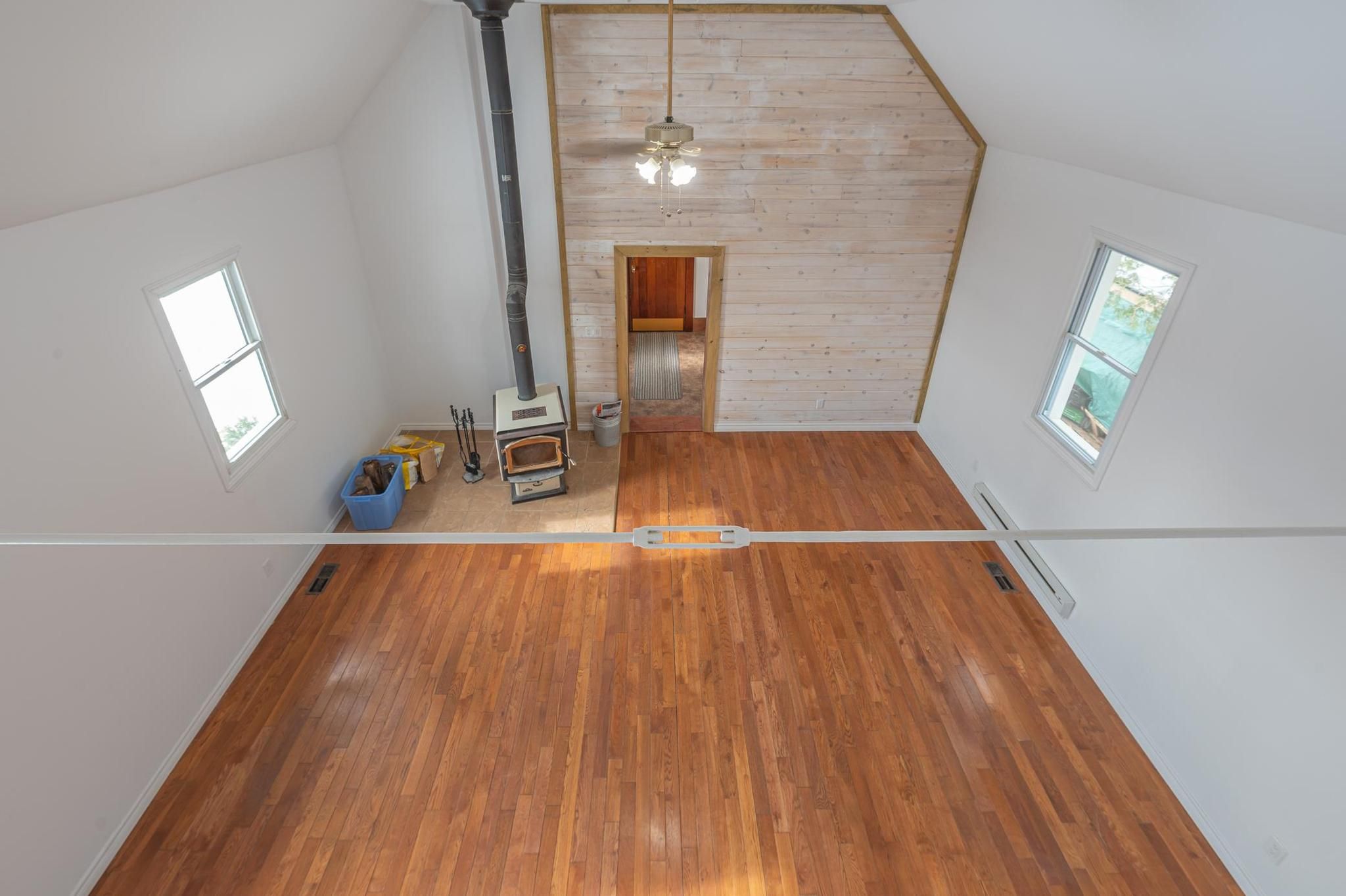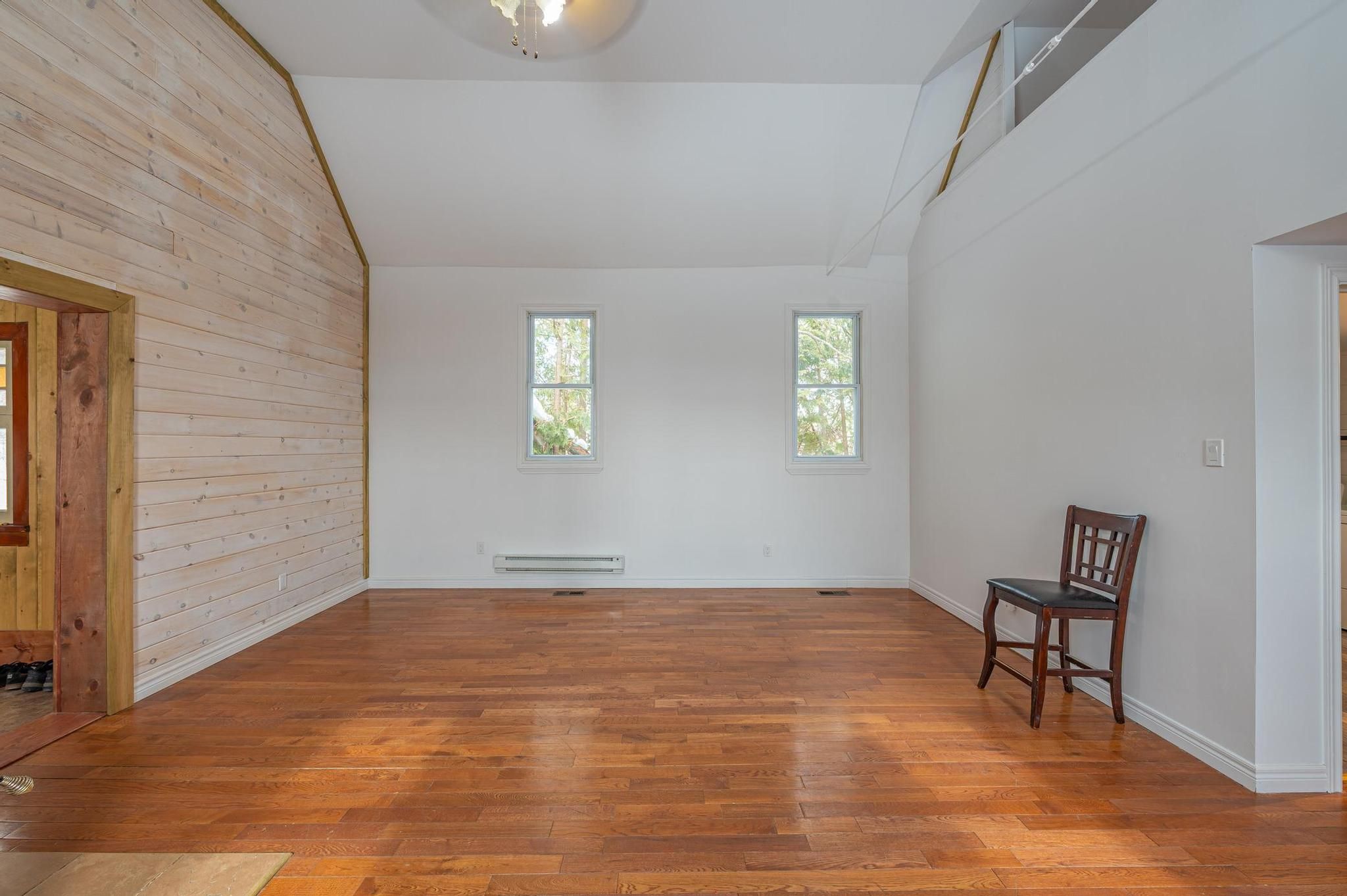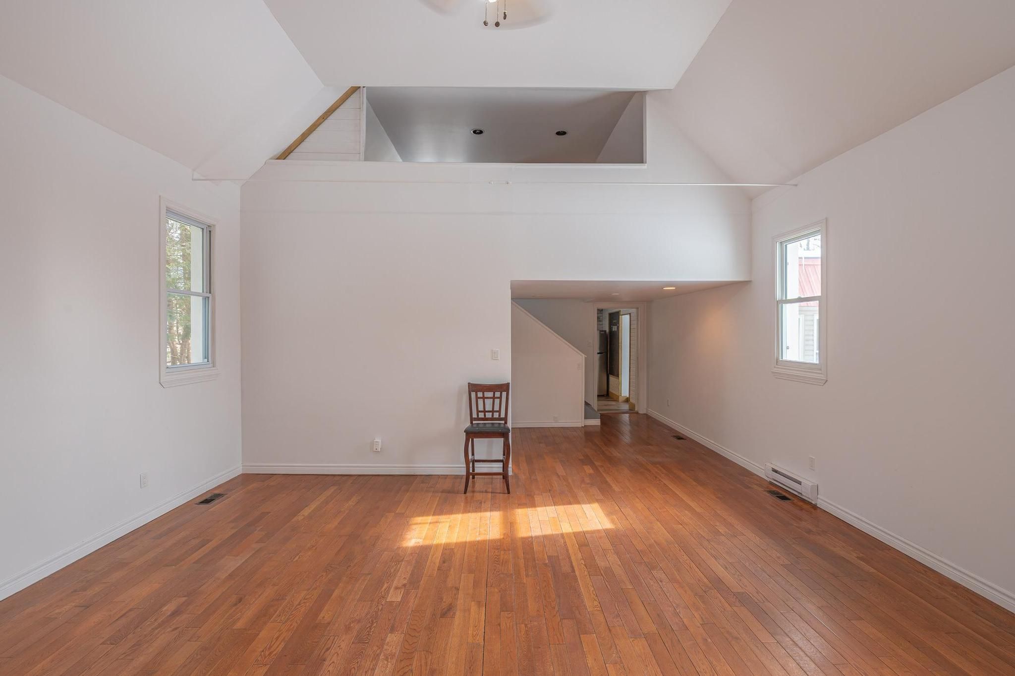 • Open living space with cathedral ceilings and hardwood flooring.