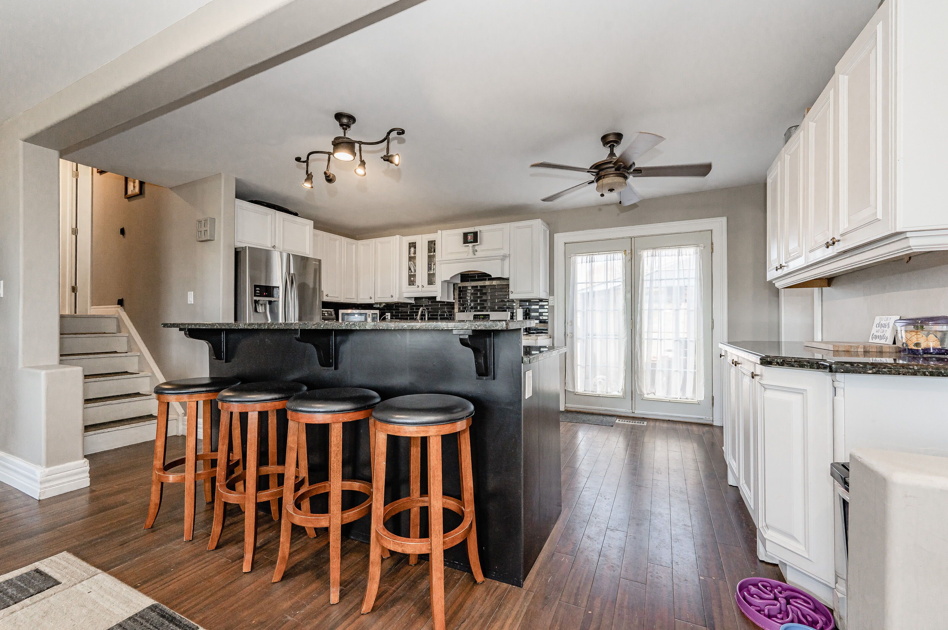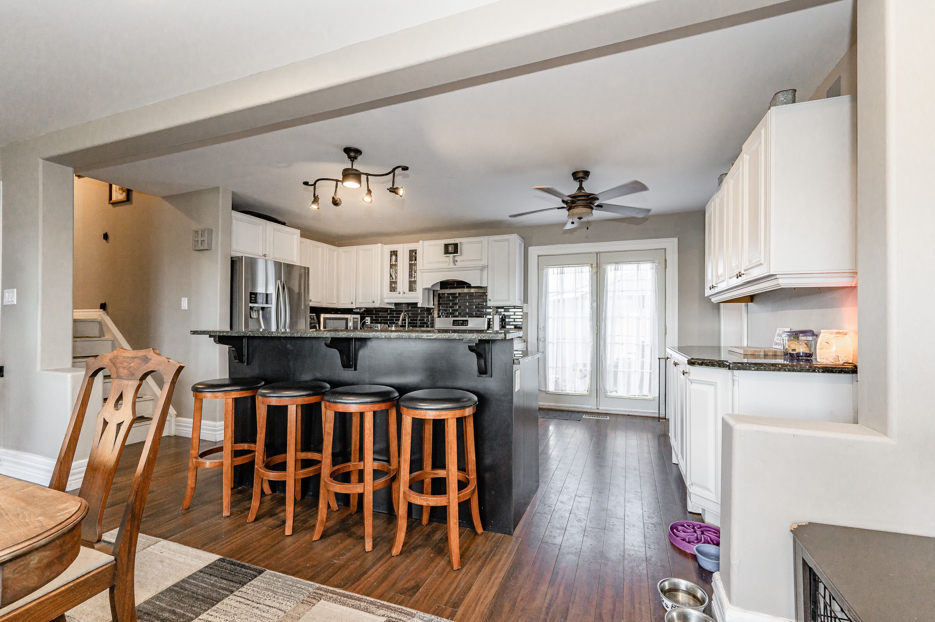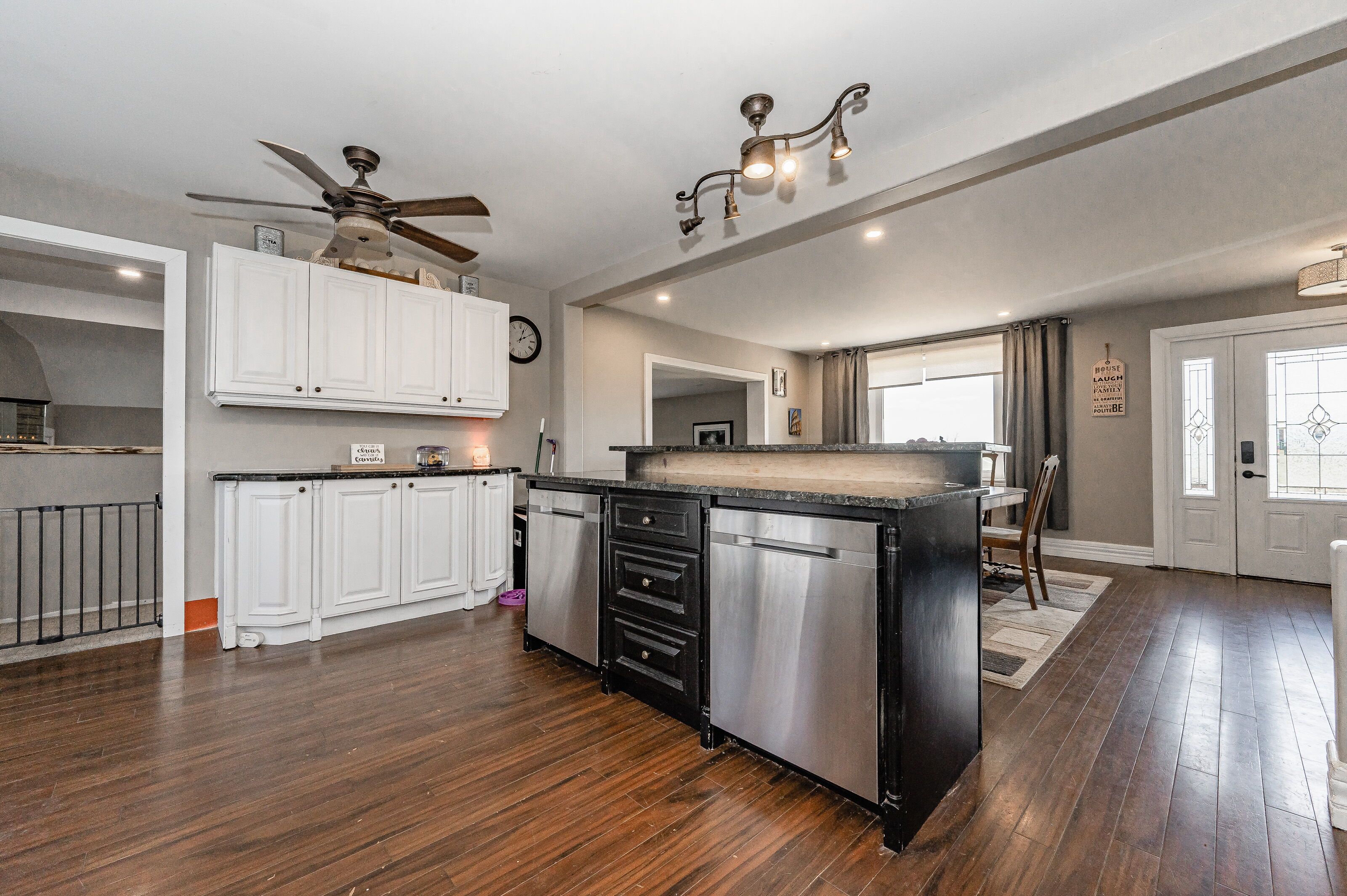 • Open concept kitchen and dining area with a functional granite island.
