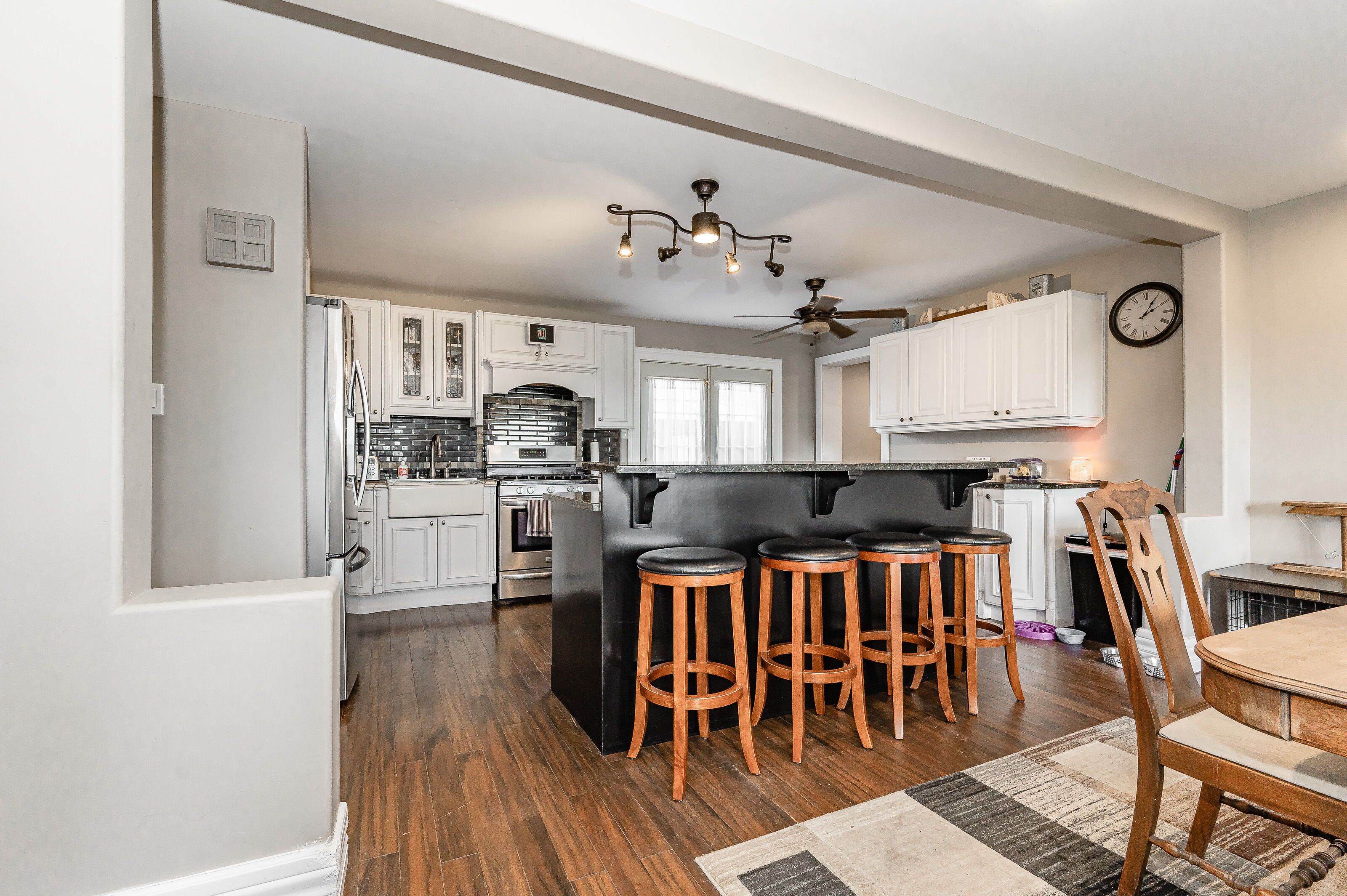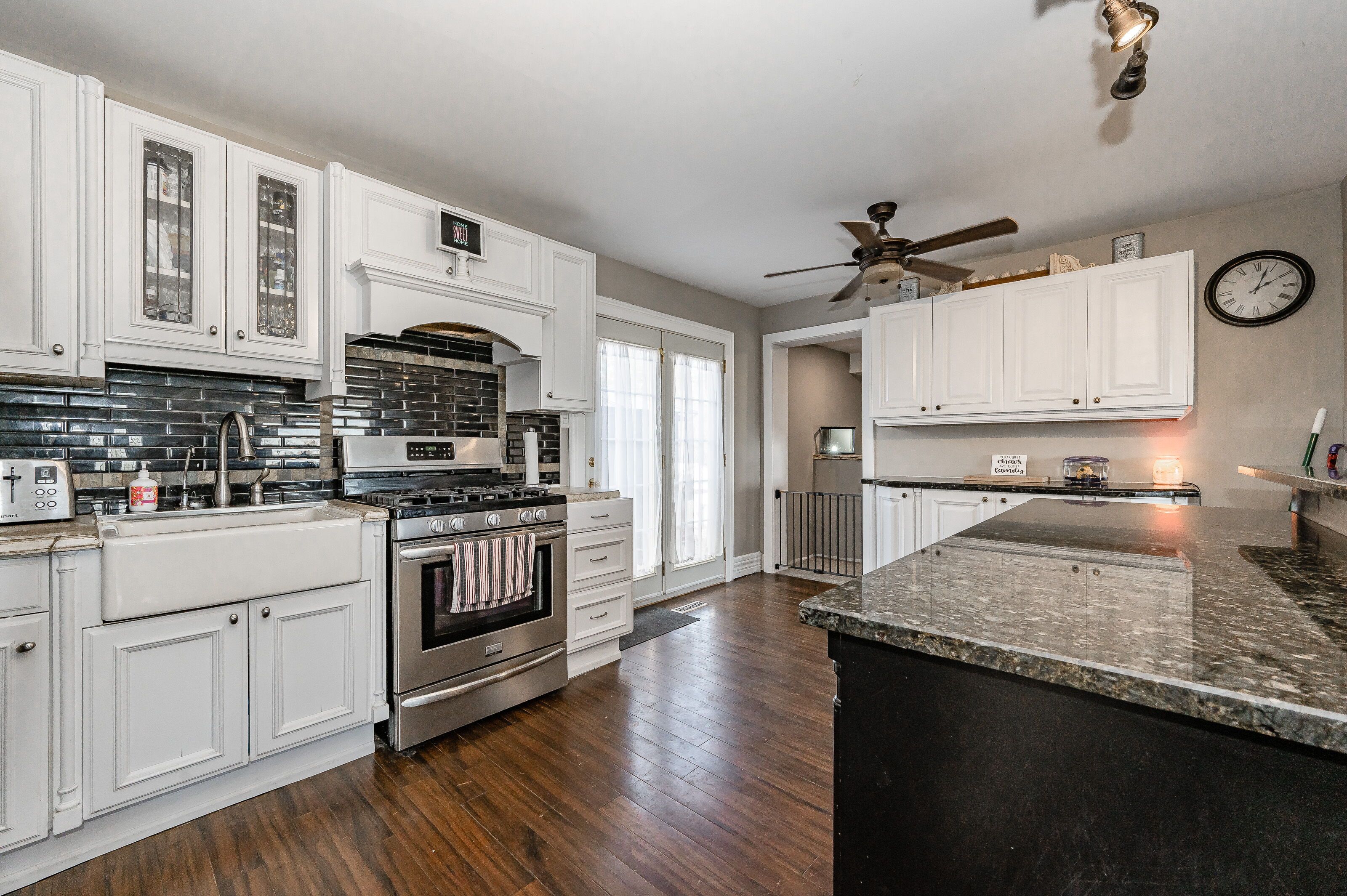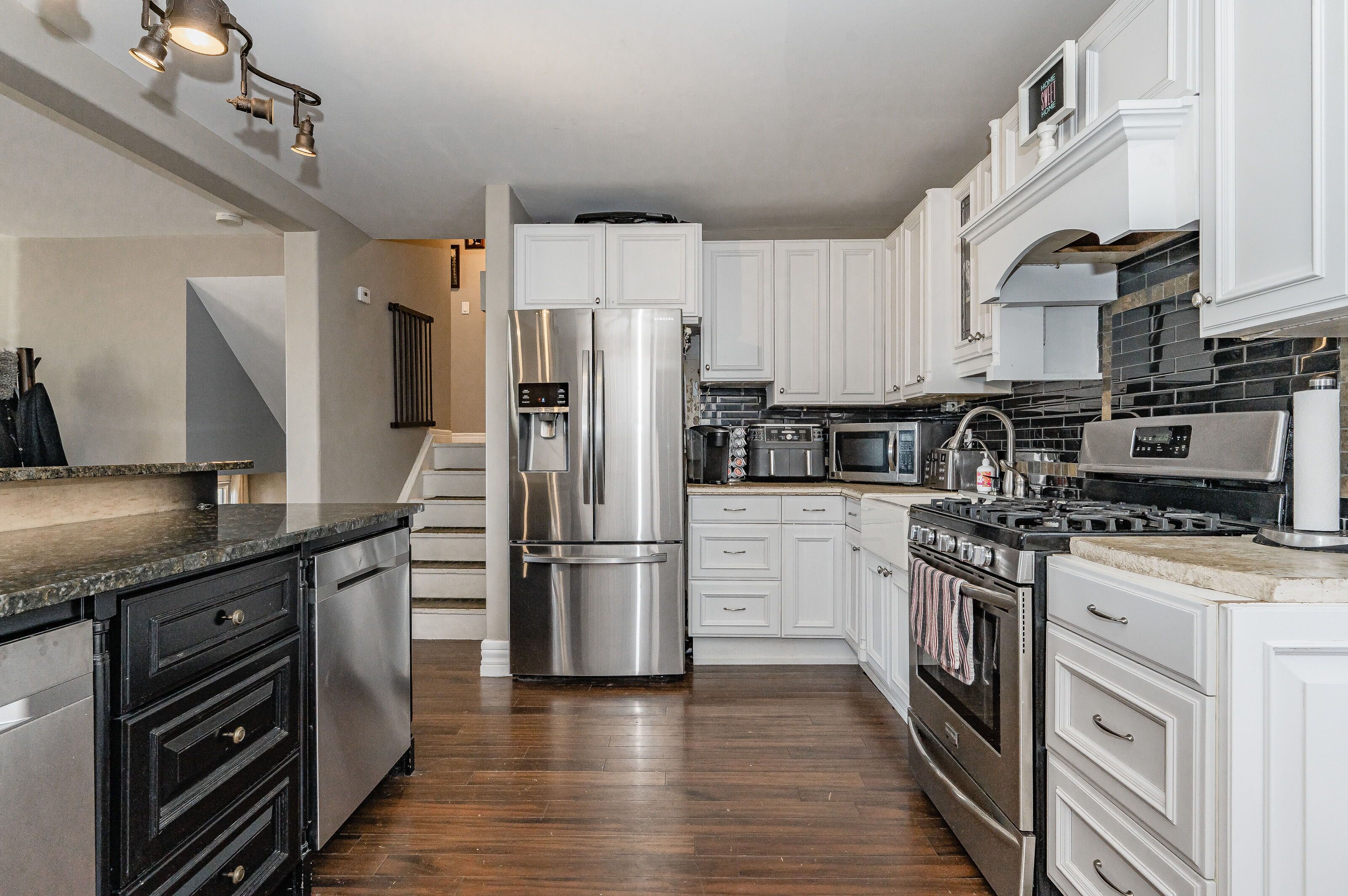 • Open concept kitchen and dining area with a functional granite island.