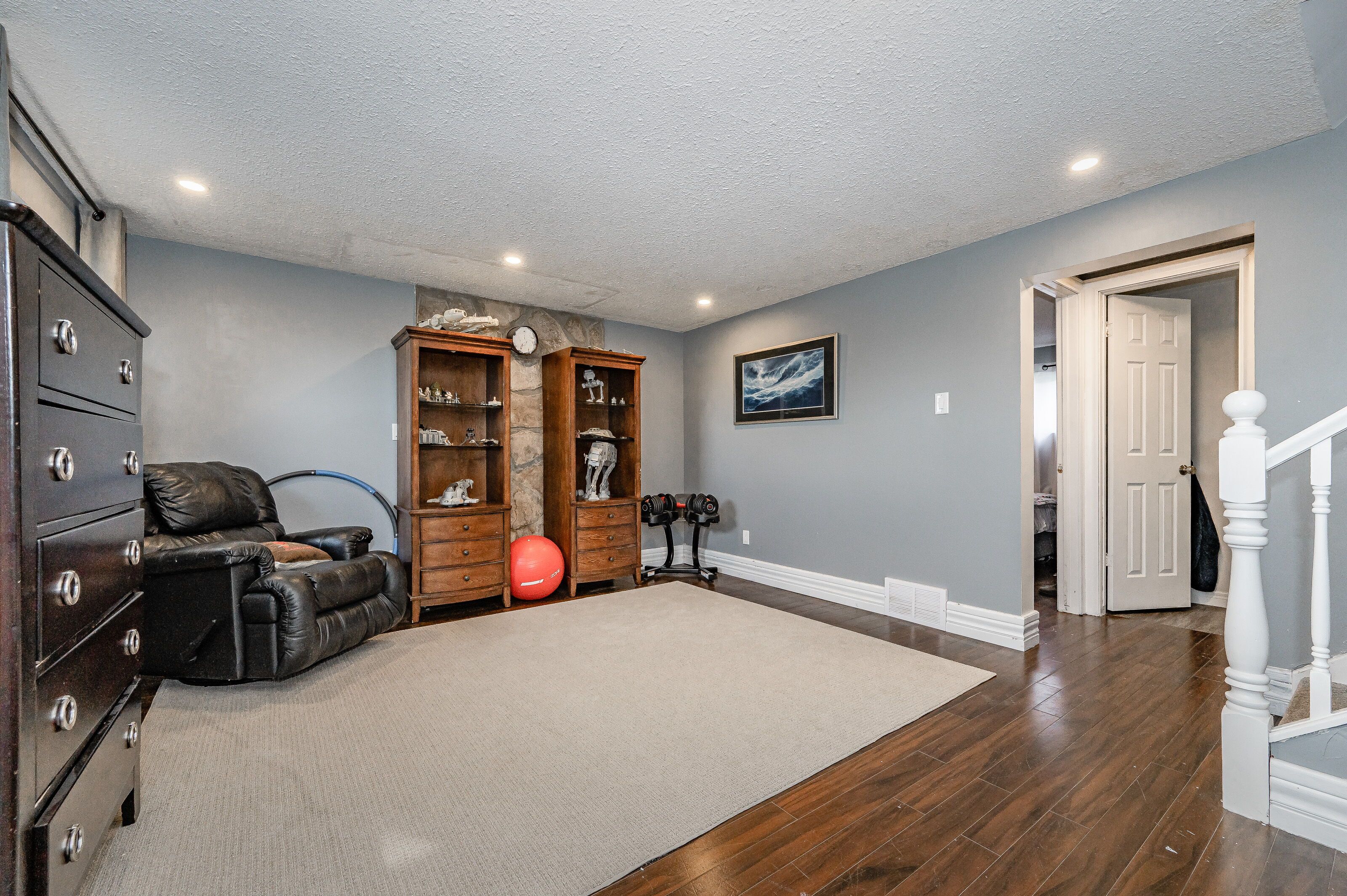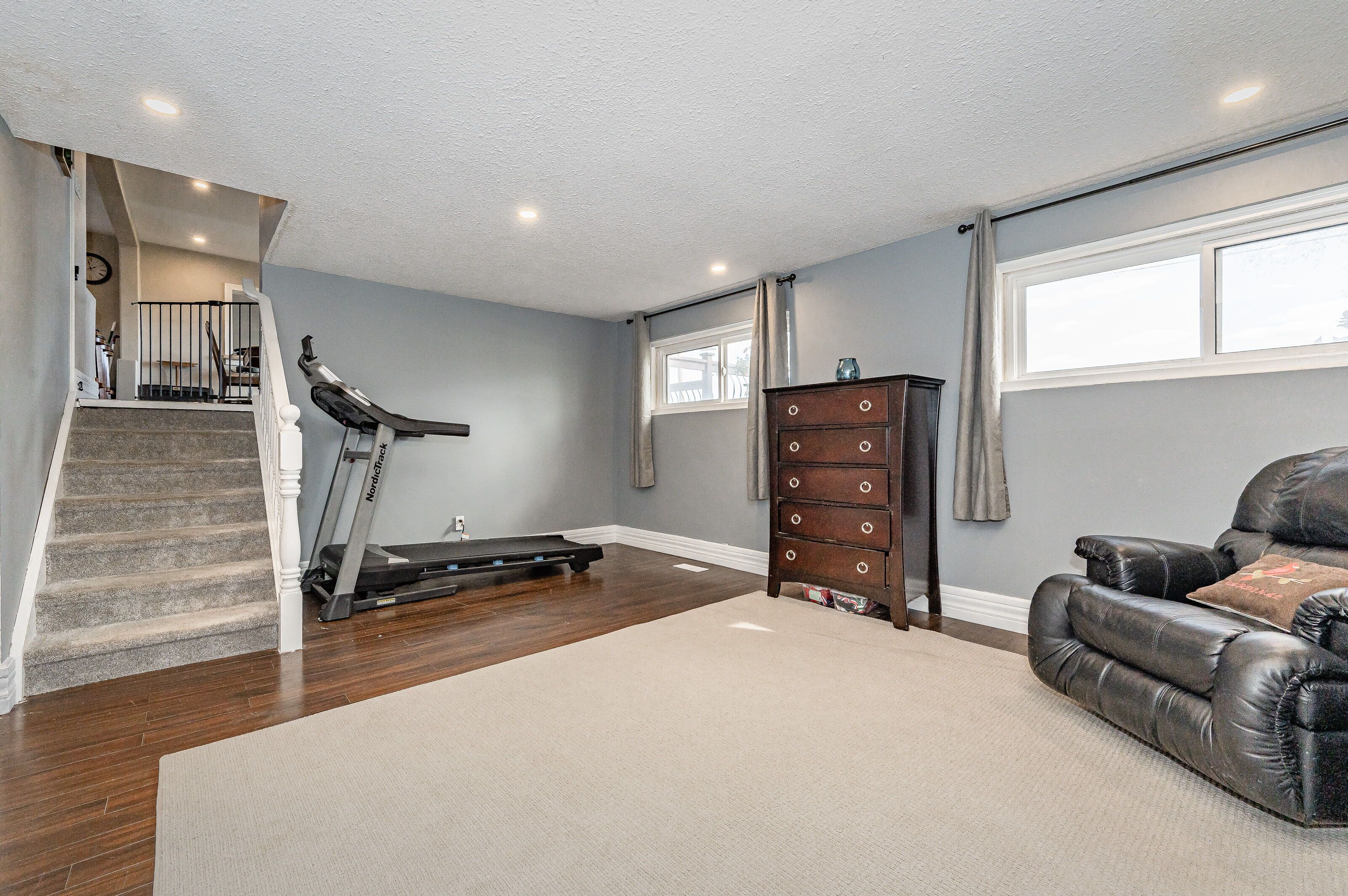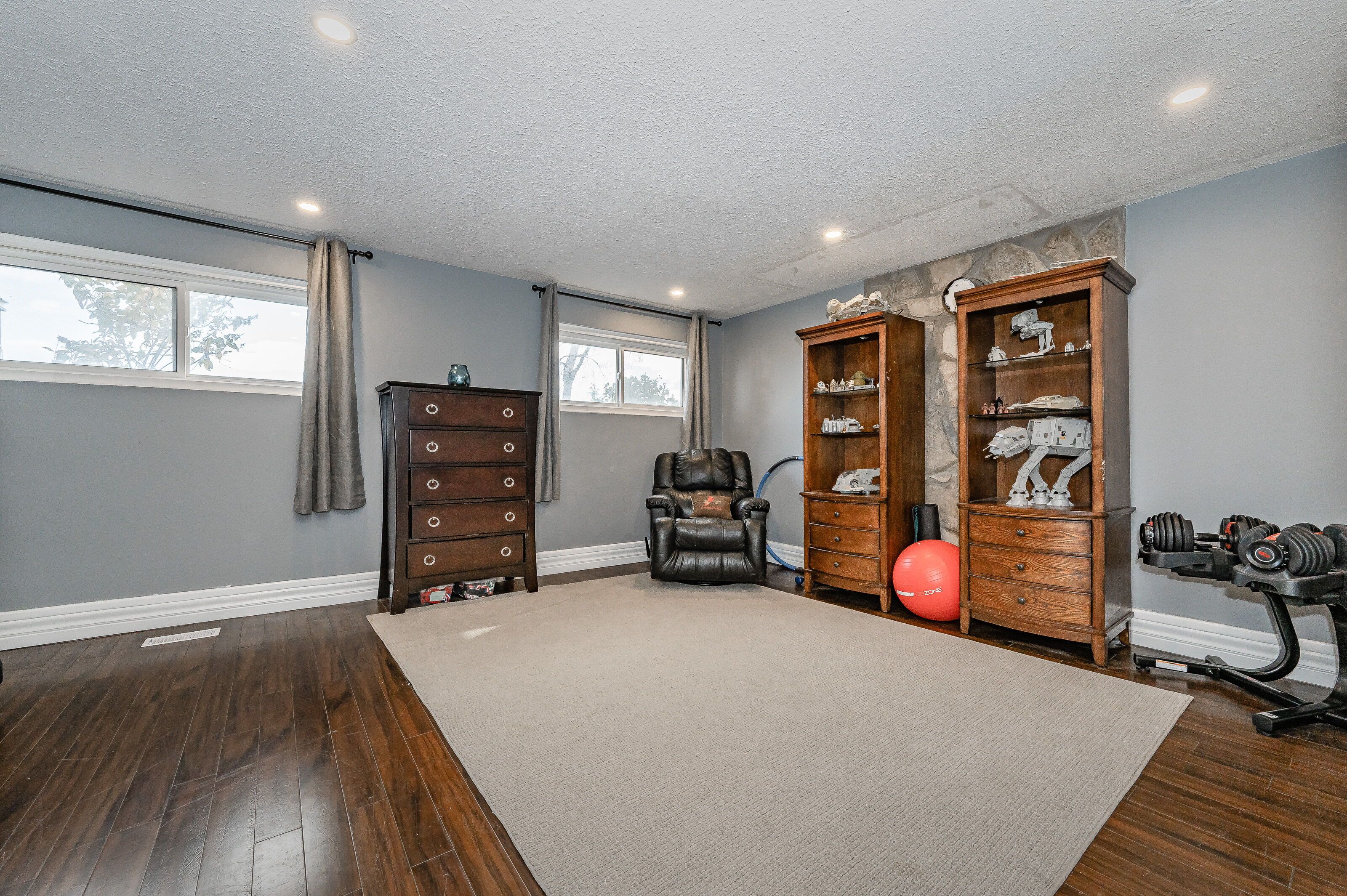 • Bright lower family room featuring bay windows, perfect for relaxation.