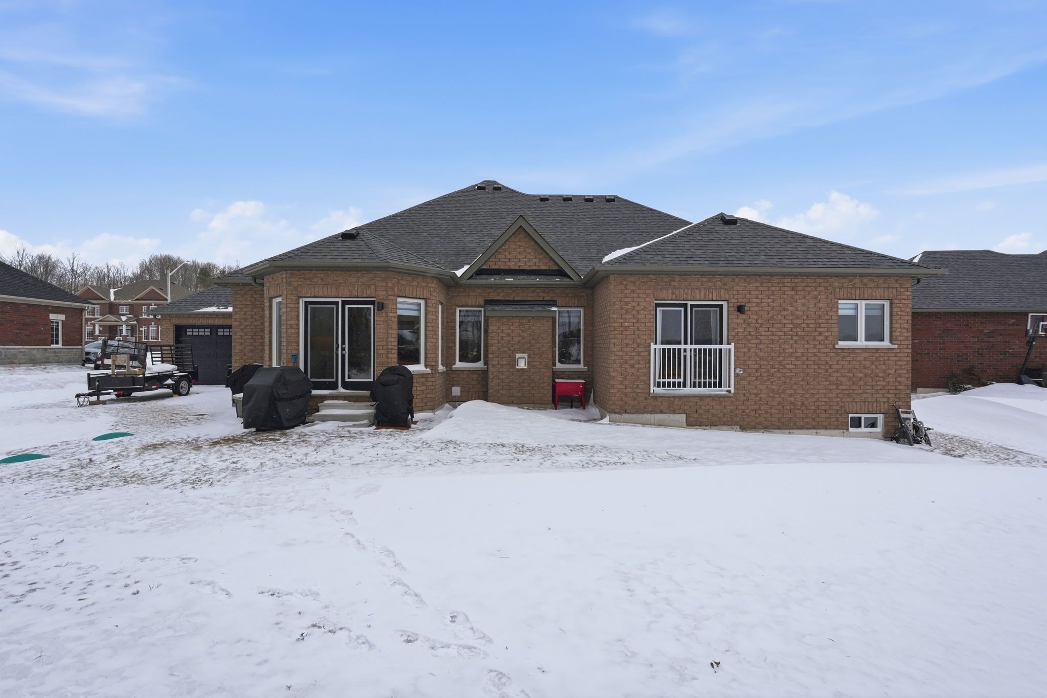 Helping you achieve your dreams in this beautiful bungalow in sought-after sugarbush! Nestled among mature trees, this property offers the perfect blend of privacy, recreation, and nature -ideal for an active outdoor lifestyle. This well-designed 2,107 sq ft home features 3 bedrooms and 3 bathrooms. The inviting great room boasts soaring cathedral ceilings, creating a bright, open space perfect for relaxing or entertaining. The kitchen offers ample counter space, a large island with breakfast bar, and a breakfast area with french doors to the outdoors, while a second set in the primary bedroom provides direct backyard access. The primary suite includes a walk-in closet and 5-piece ensuite. Two additional bedrooms share a 4-piece bath, plus a convenient 2-piece powder room for guests. An oversized 3-car garage with a rare drive-through rear door provides easy backyard access-perfect for recreational storage or outdoor living. Enjoy year-round activities just minutes away at horseshoe valley resort, or explore the trails of copeland forest. Nearby lake simcoe offers boating, beaches, and waterfront dining, while orillia and barrie's shopping, dining, schools, and commuter routes are a short drive away. Experience the best of country living with modern convenience in this exceptional home.