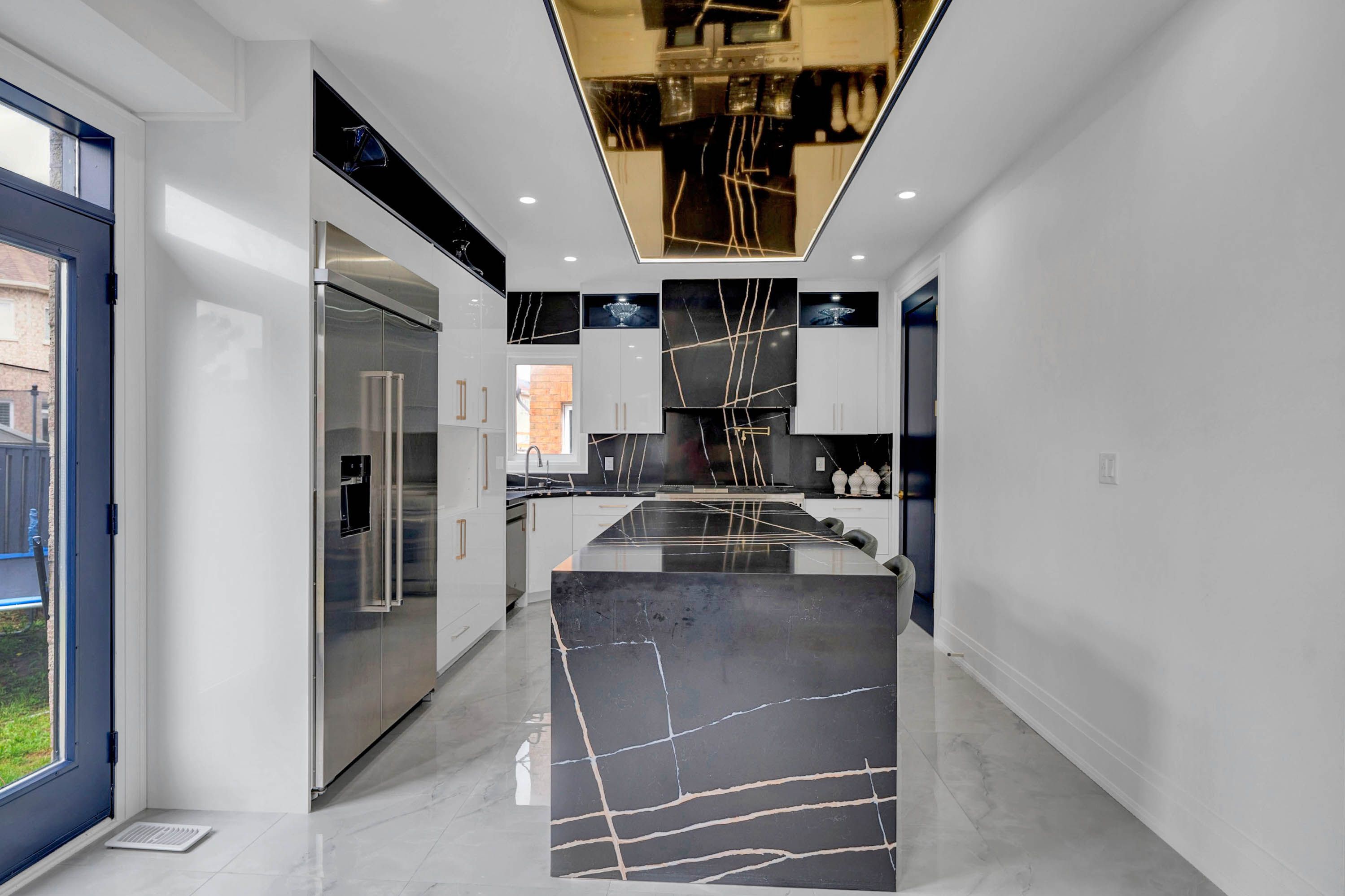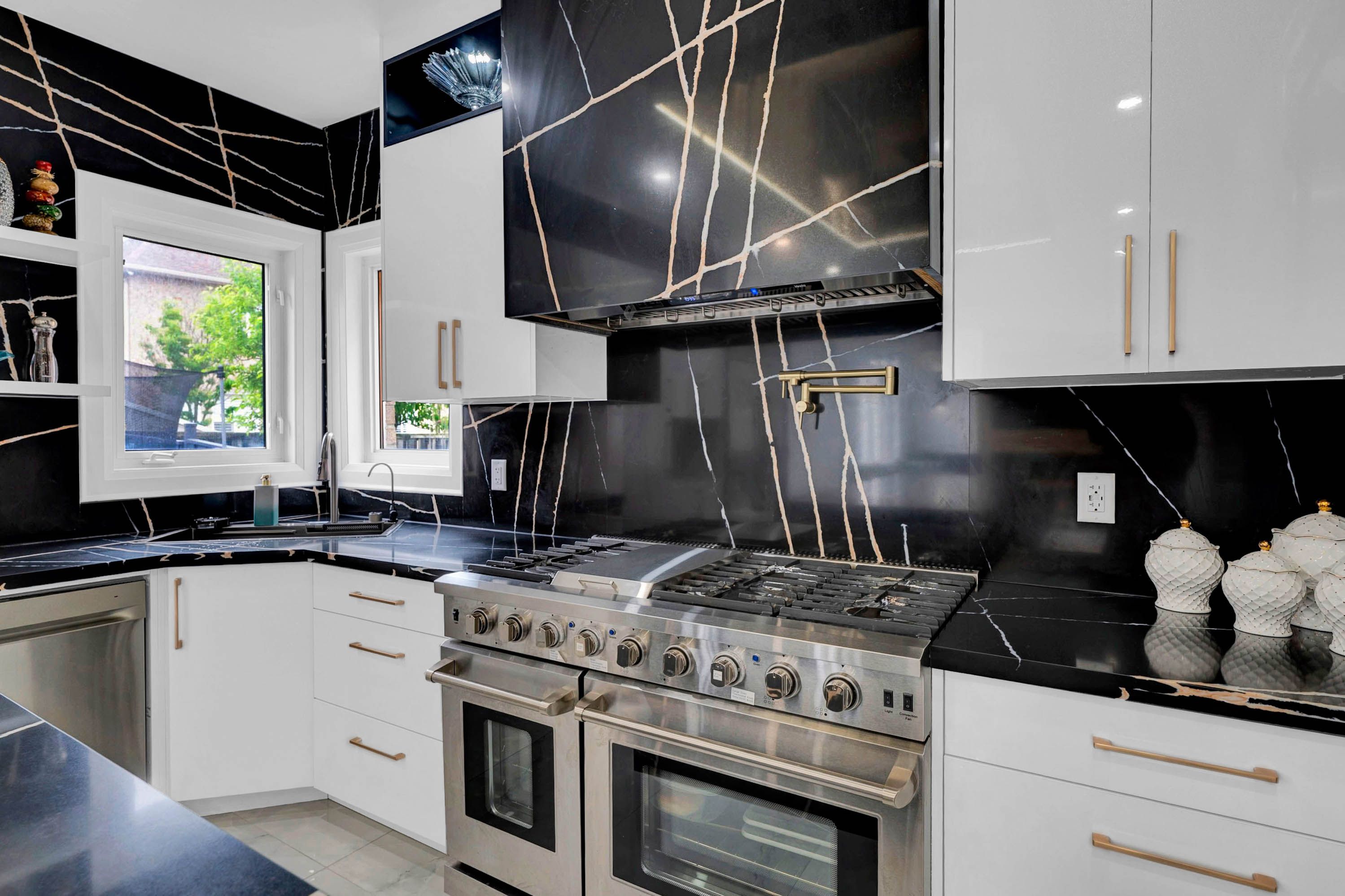 • Custom kitchen features quartz countertops and stainless steel appliances.
