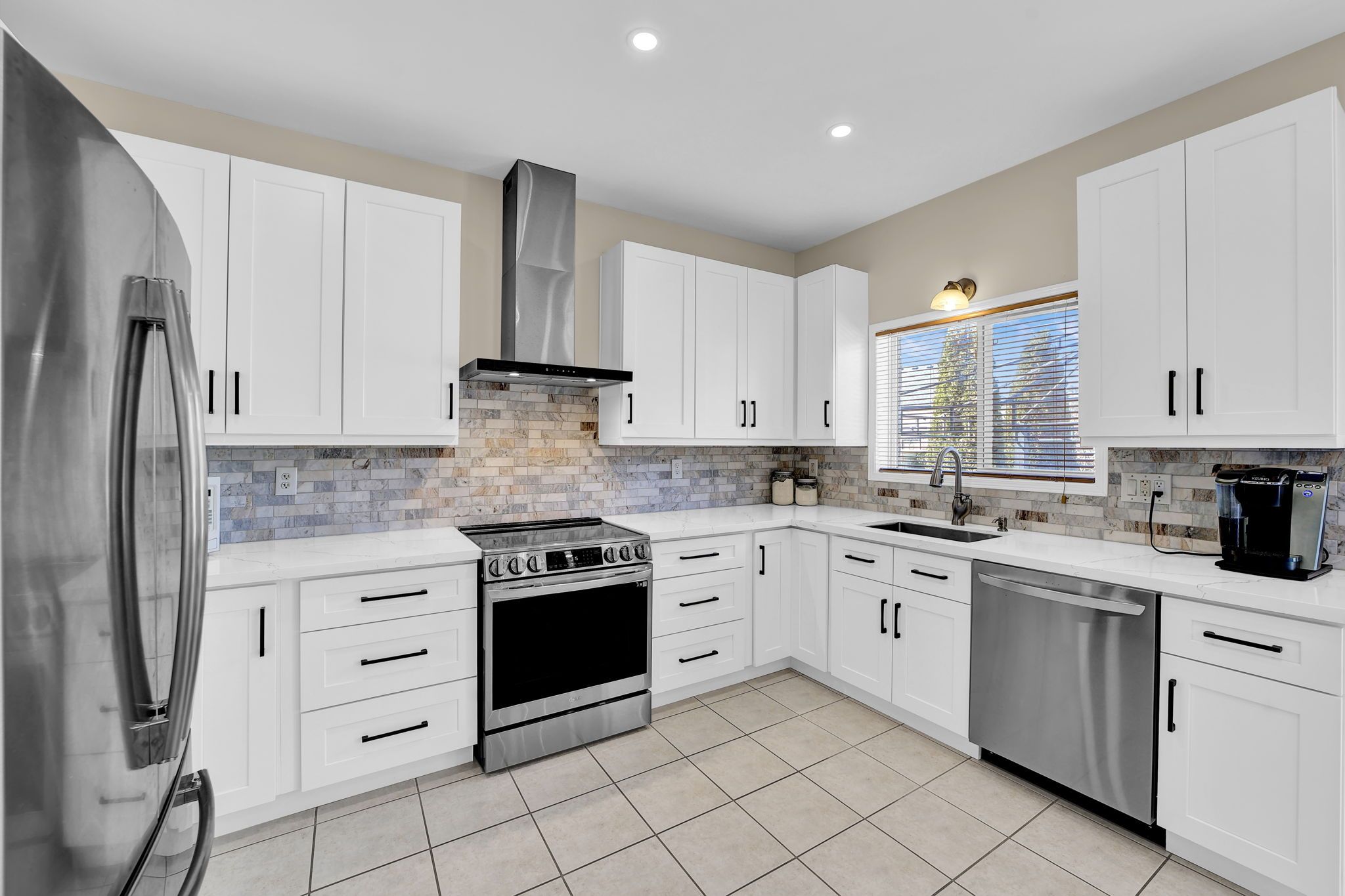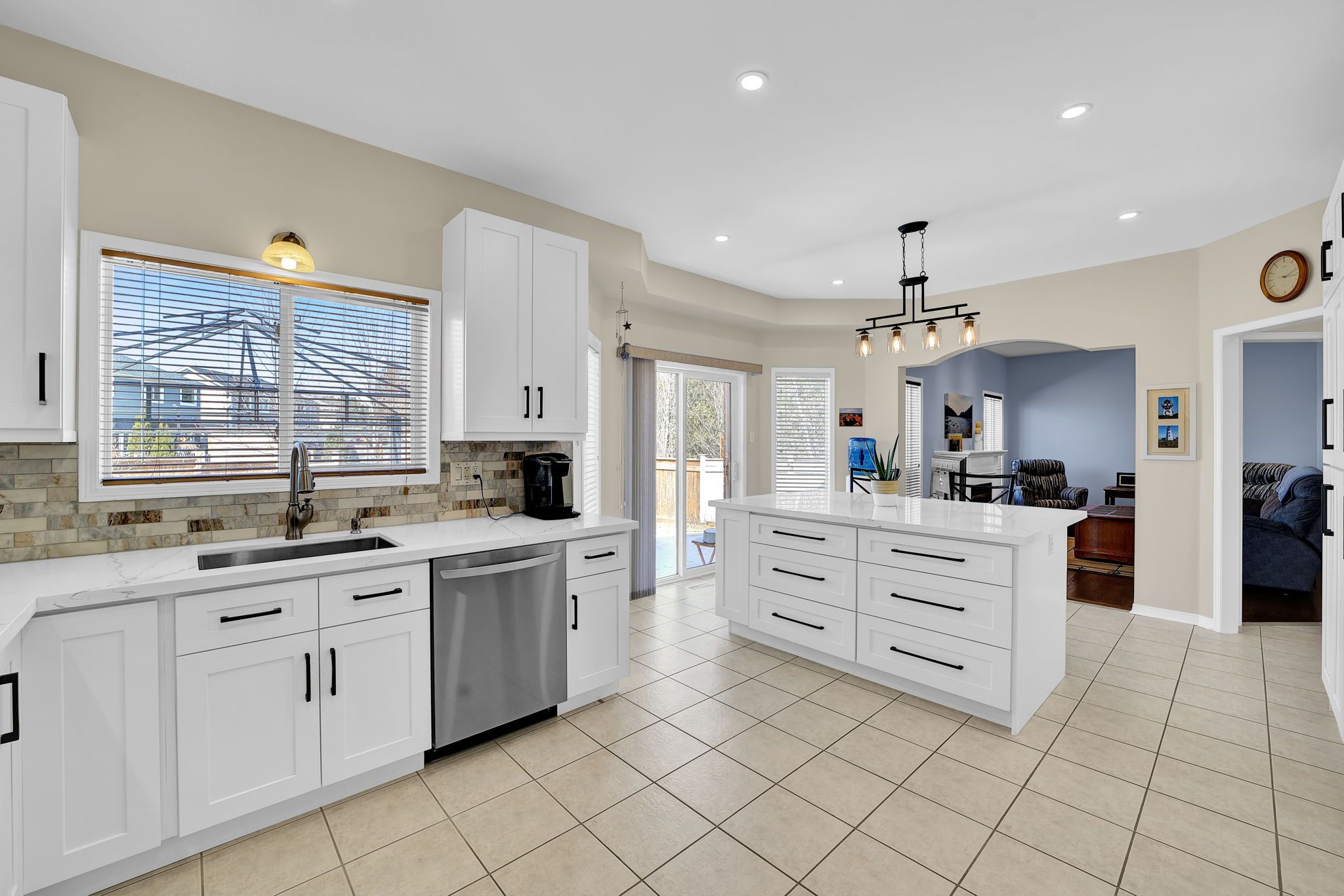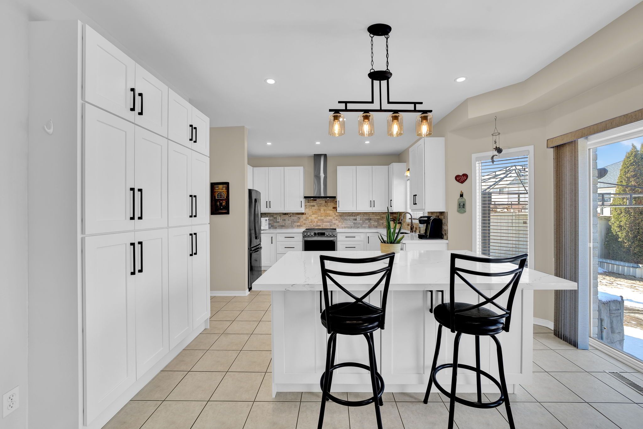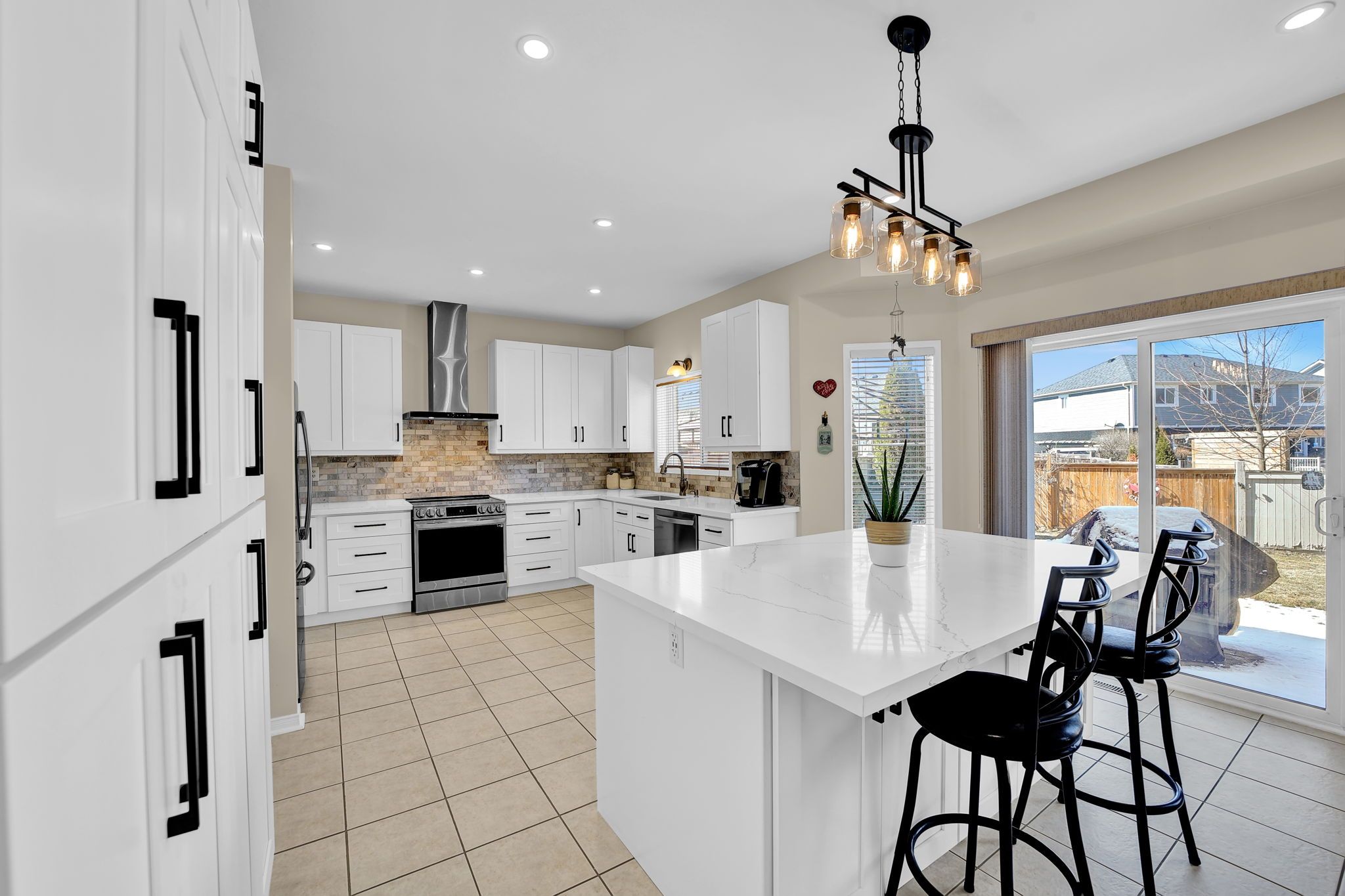 • Renovated eat-in kitchen with quartz counters and new appliances.