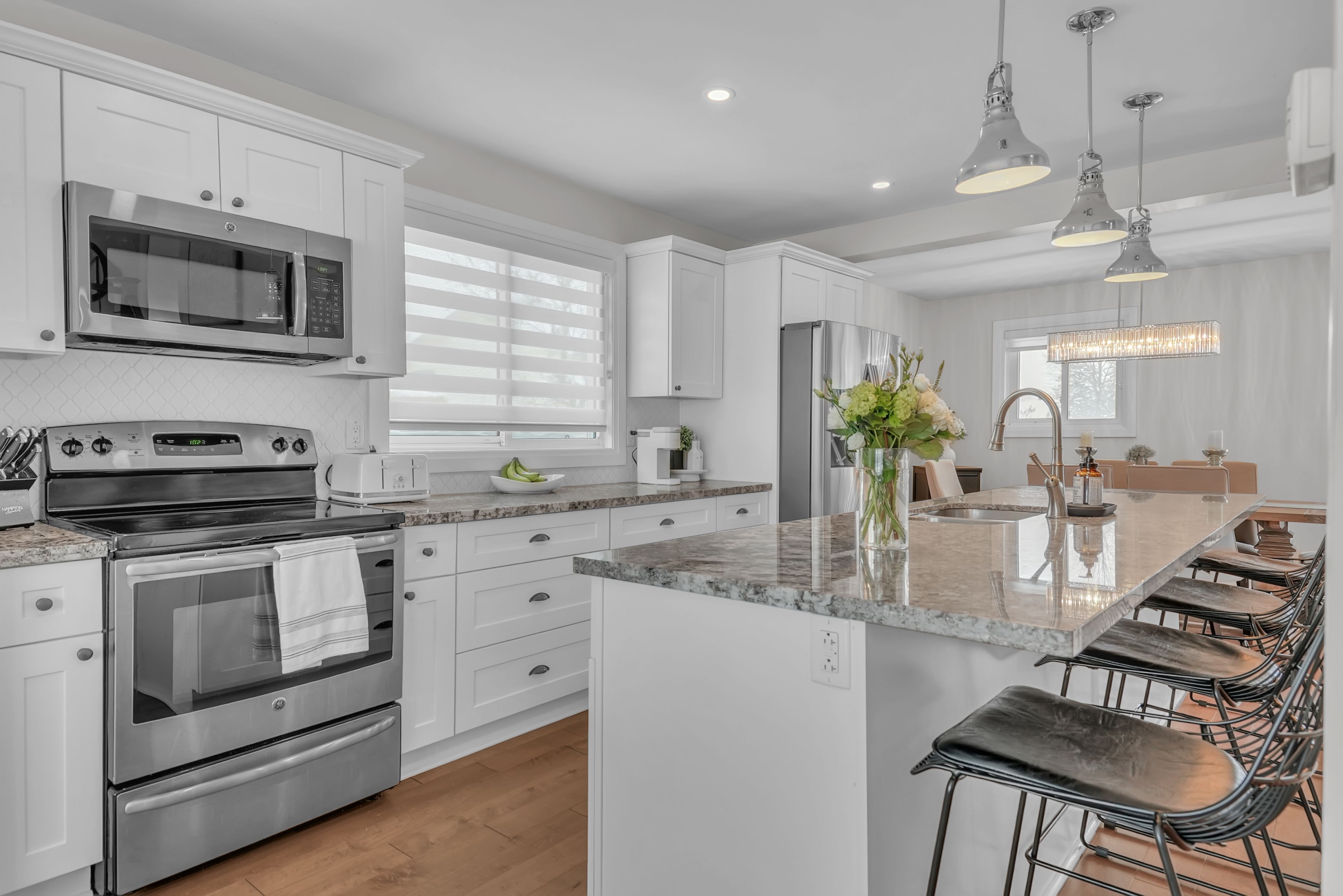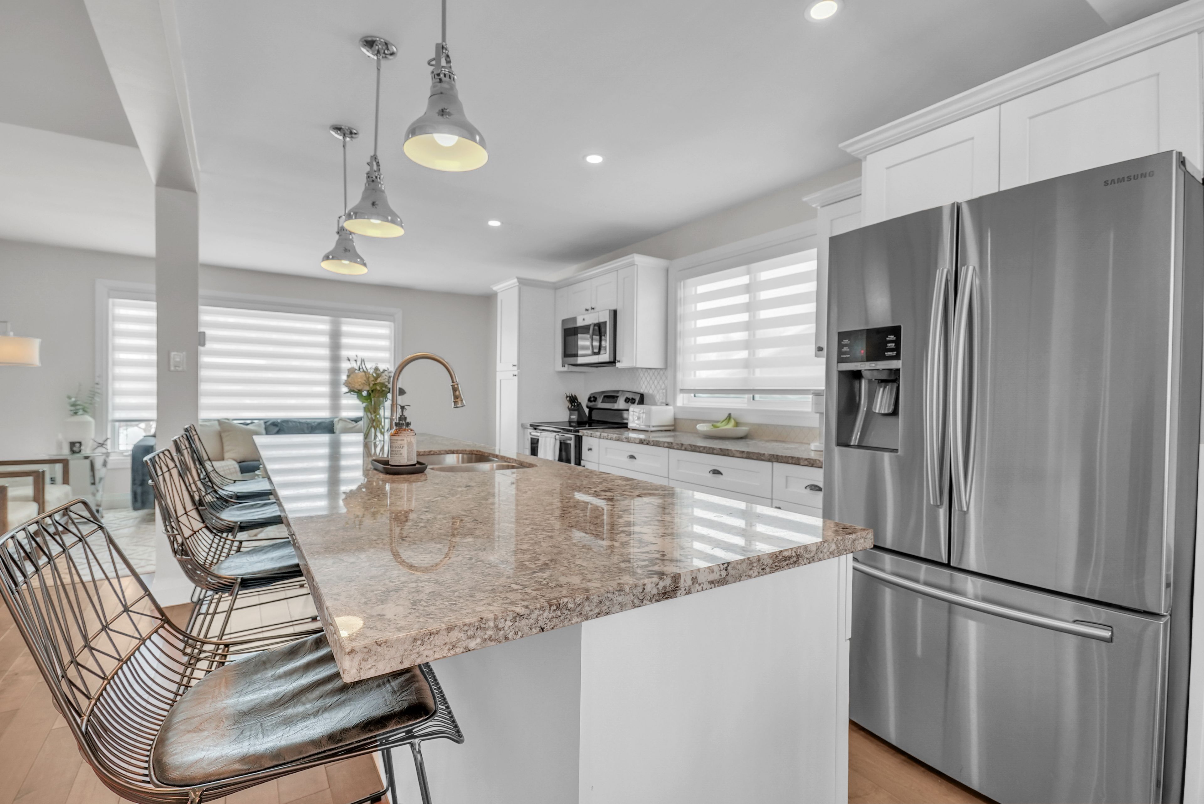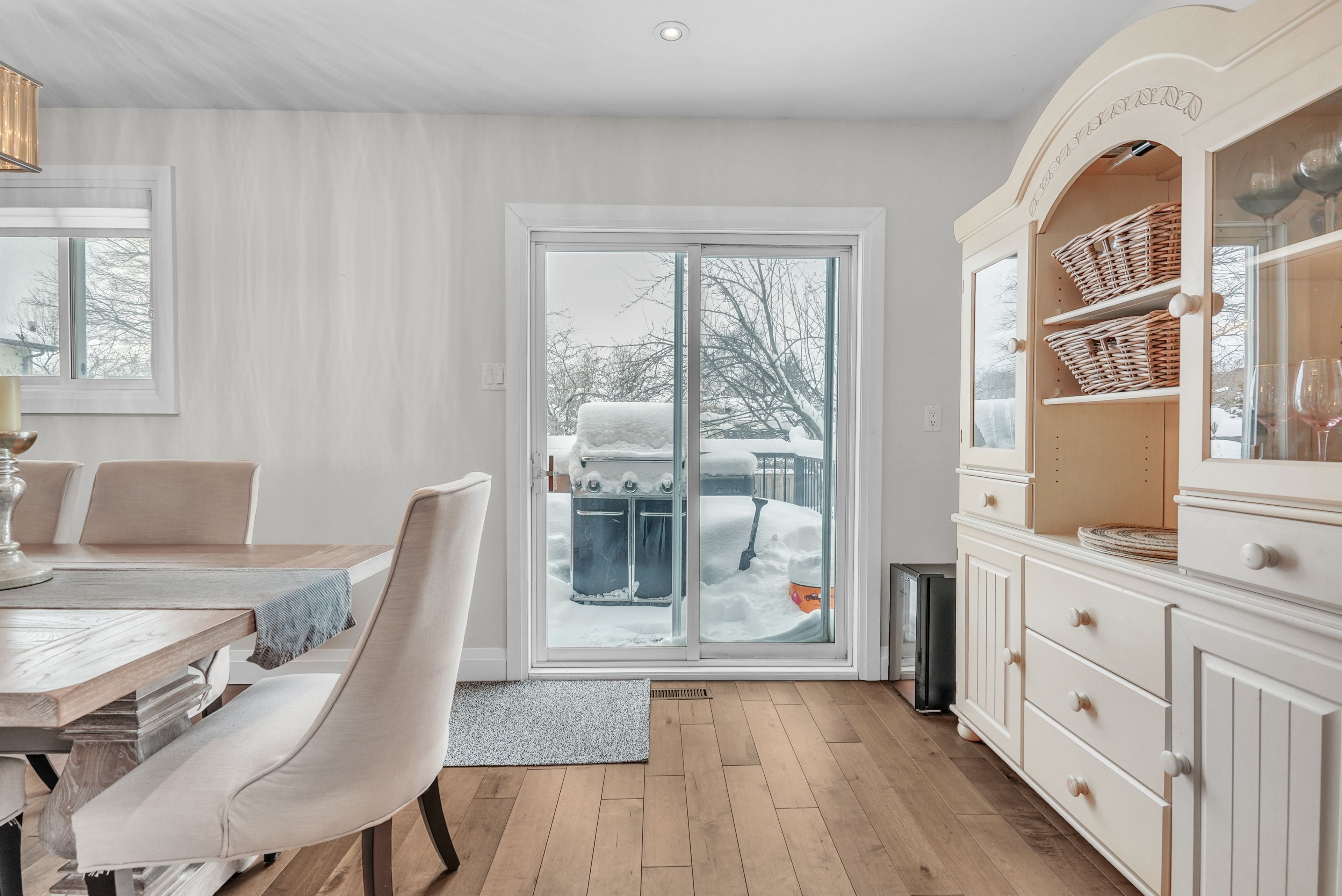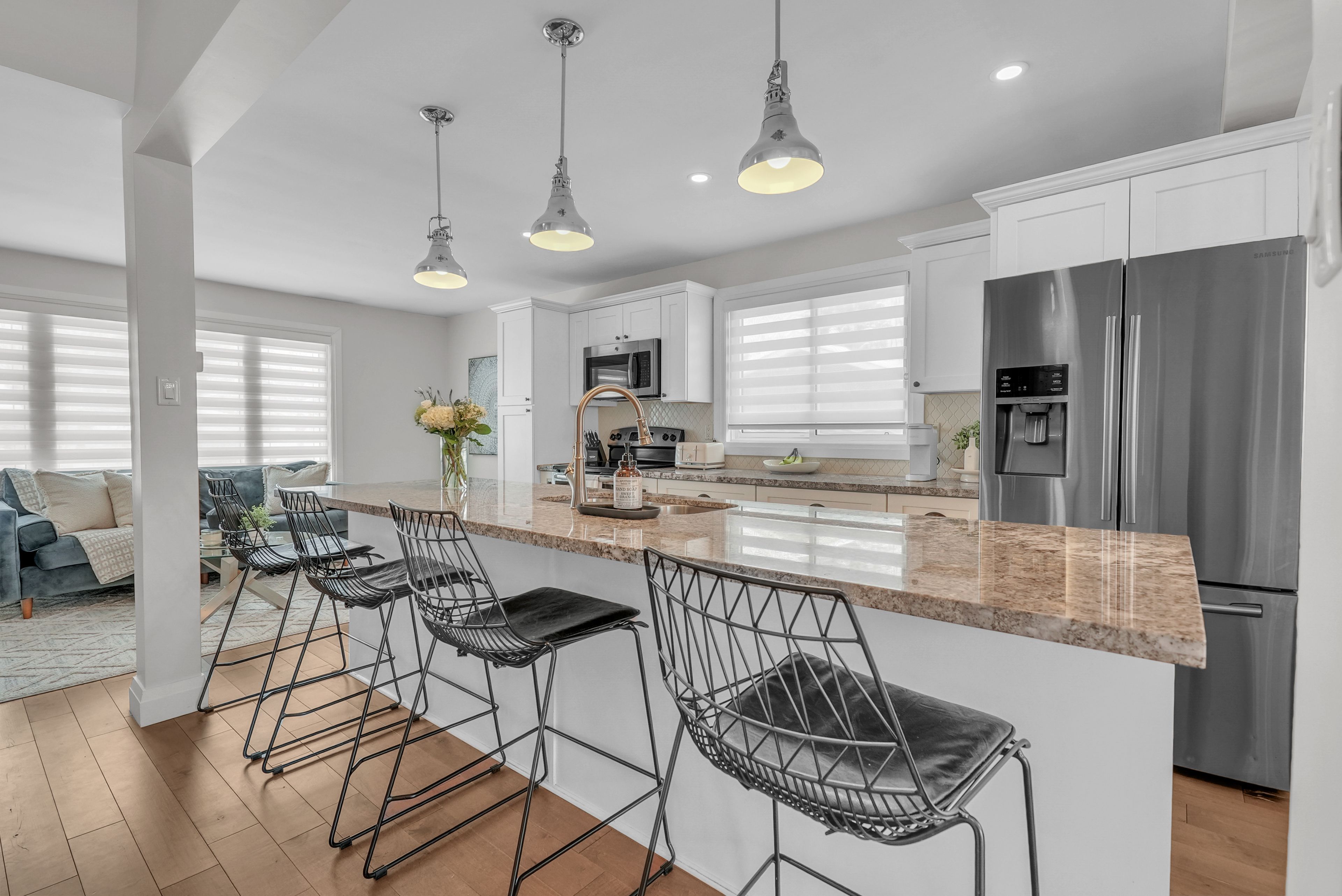 Welcome to 4 grand place, located in the highly sought after allandale heights neighbourhood in southeast barrie, this beautifully renovated four level side split sits in a family friendly community known for mature tree lined streets, parks, excellent schools, and easy access to trails and recreational spaces. Fully updated from top to bottom, the home features hardwood flooring, zebra blinds, custom wrought iron railings, recessed lighting, and large windows that fill the interior with natural light. The main floor family room is highlighted by a stunning stone gas fireplace, creating a warm and inviting space for gatherings, as well as terrace doors leading to the backyard. The custom kitchen offers hardwood floors, a large island with casual seating, soft close cabinetry with pull out storage and pots and pans drawers, pendant lighting, and recessed lighting, flowing into the dining area with walk out access to the rear deck overlooking a private, fully fenced yard with mature trees, perfect for entertaining or relaxing. The upper level includes a spacious landing ideal for a home office, den, or cozy reading nook. The fully finished basement provides a large recreation room, and a stylish three piece bathroom, with the potential to create a fourth bedroom thanks to a bright above grade window and existing closet space. Additional highlights include abundant storage, functional layout, superior maintenance, inside entry to garage, existing wiring to install hot tub, quality materials and craftsmanship, and attention to detail throughout. Ideally located near shopping, public transit, recreation centres, trails, places of worship, and barrie's waterfront and beaches, this home offers comfort, style, and versatility in one of the city's most desirable and quiet neighbourhoods, combining modern living with a private outdoor retreat. Come and take a look today!