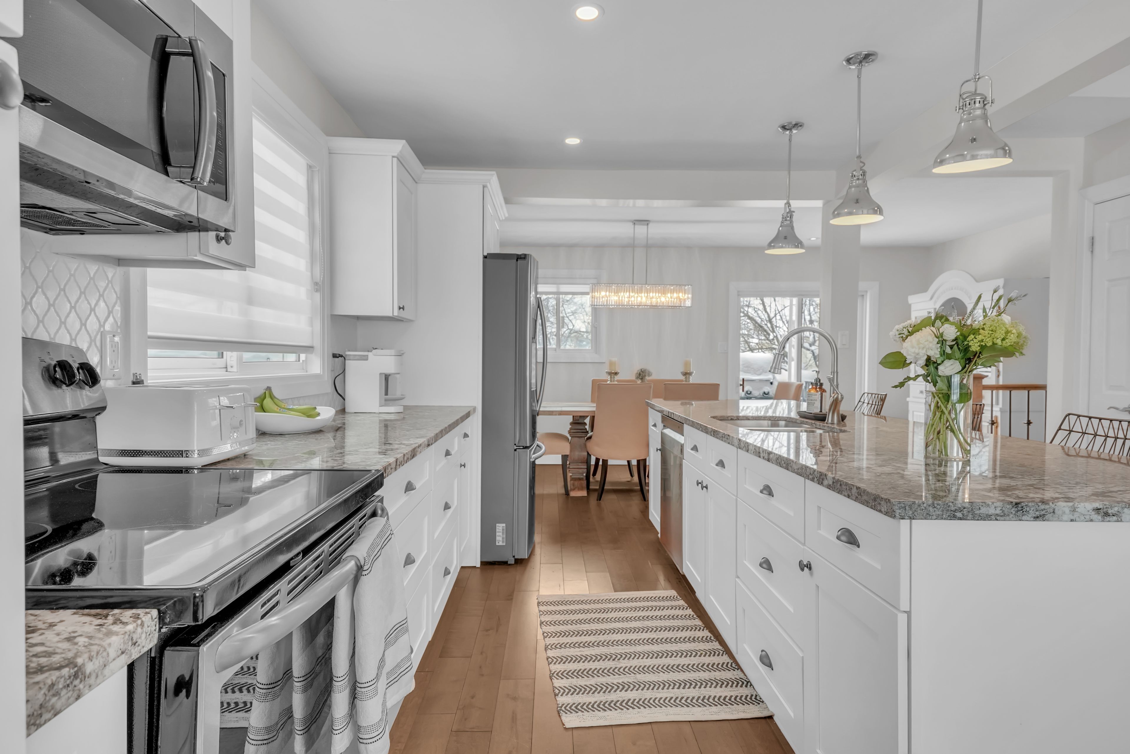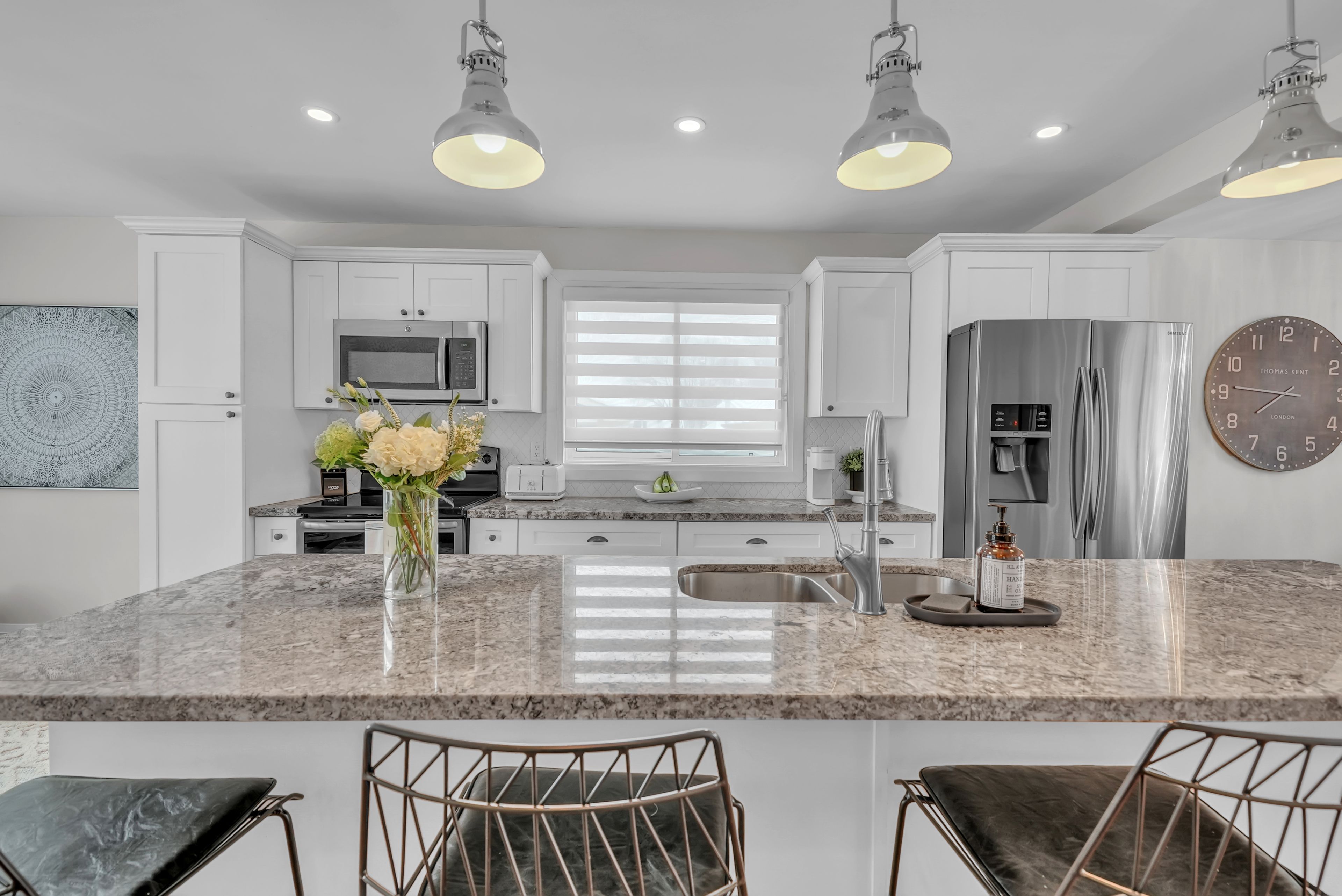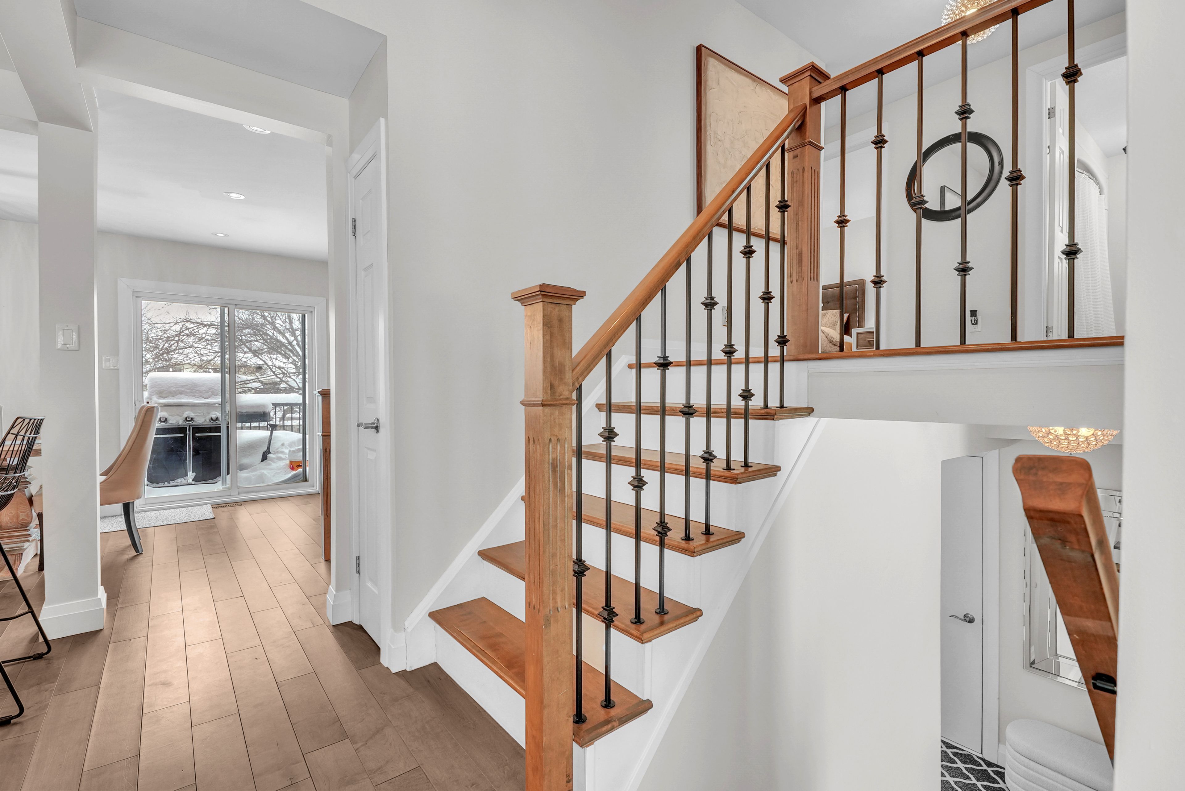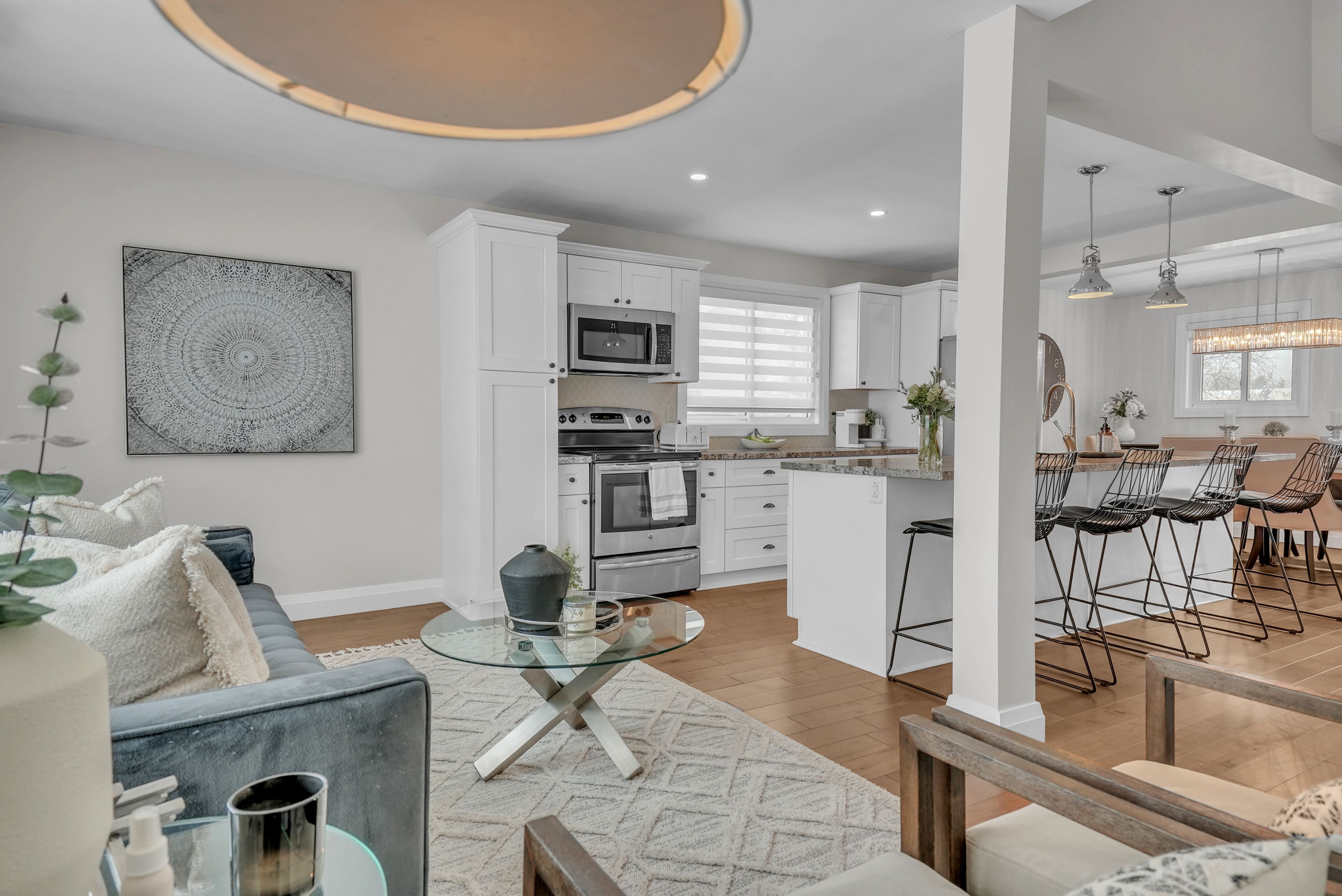 Welcome to 4 grand place, located in the highly sought after allandale heights neighbourhood in southeast barrie, this beautifully renovated four level side split sits in a family friendly community known for mature tree lined streets, parks, excellent schools, and easy access to trails and recreational spaces. Fully updated from top to bottom, the home features hardwood flooring, zebra blinds, custom wrought iron railings, recessed lighting, and large windows that fill the interior with natural light. The main floor family room is highlighted by a stunning stone gas fireplace, creating a warm and inviting space for gatherings, as well as terrace doors leading to the backyard. The custom kitchen offers hardwood floors, a large island with casual seating, soft close cabinetry with pull out storage and pots and pans drawers, pendant lighting, and recessed lighting, flowing into the dining area with walk out access to the rear deck overlooking a private, fully fenced yard with mature trees, perfect for entertaining or relaxing. The upper level includes a spacious landing ideal for a home office, den, or cozy reading nook. The fully finished basement provides a large recreation room, and a stylish three piece bathroom, with the potential to create a fourth bedroom thanks to a bright above grade window and existing closet space. Additional highlights include abundant storage, functional layout, superior maintenance, inside entry to garage, existing wiring to install hot tub, quality materials and craftsmanship, and attention to detail throughout. Ideally located near shopping, public transit, recreation centres, trails, places of worship, and barrie's waterfront and beaches, this home offers comfort, style, and versatility in one of the city's most desirable and quiet neighbourhoods, combining modern living with a private outdoor retreat. Come and take a look today!