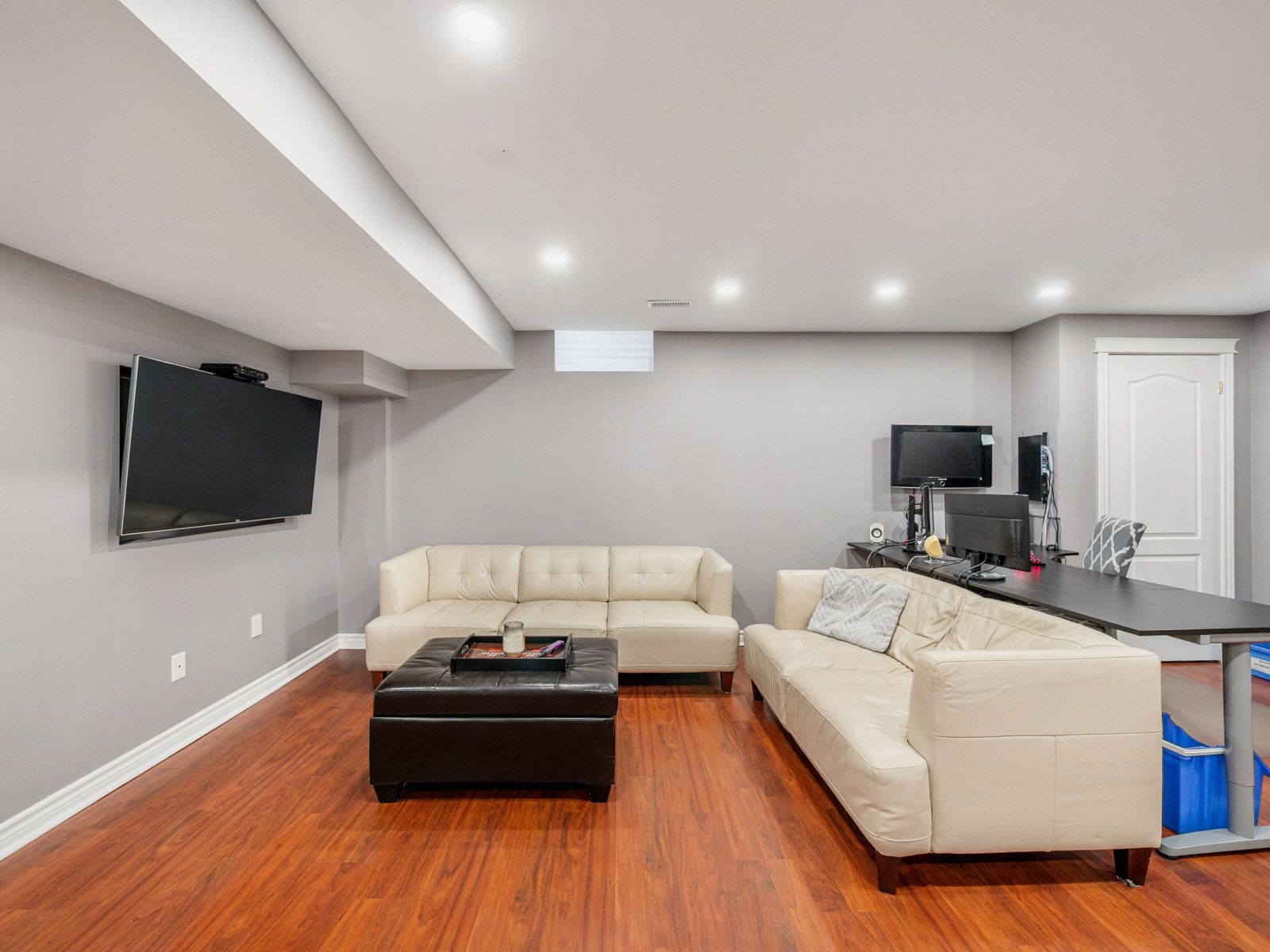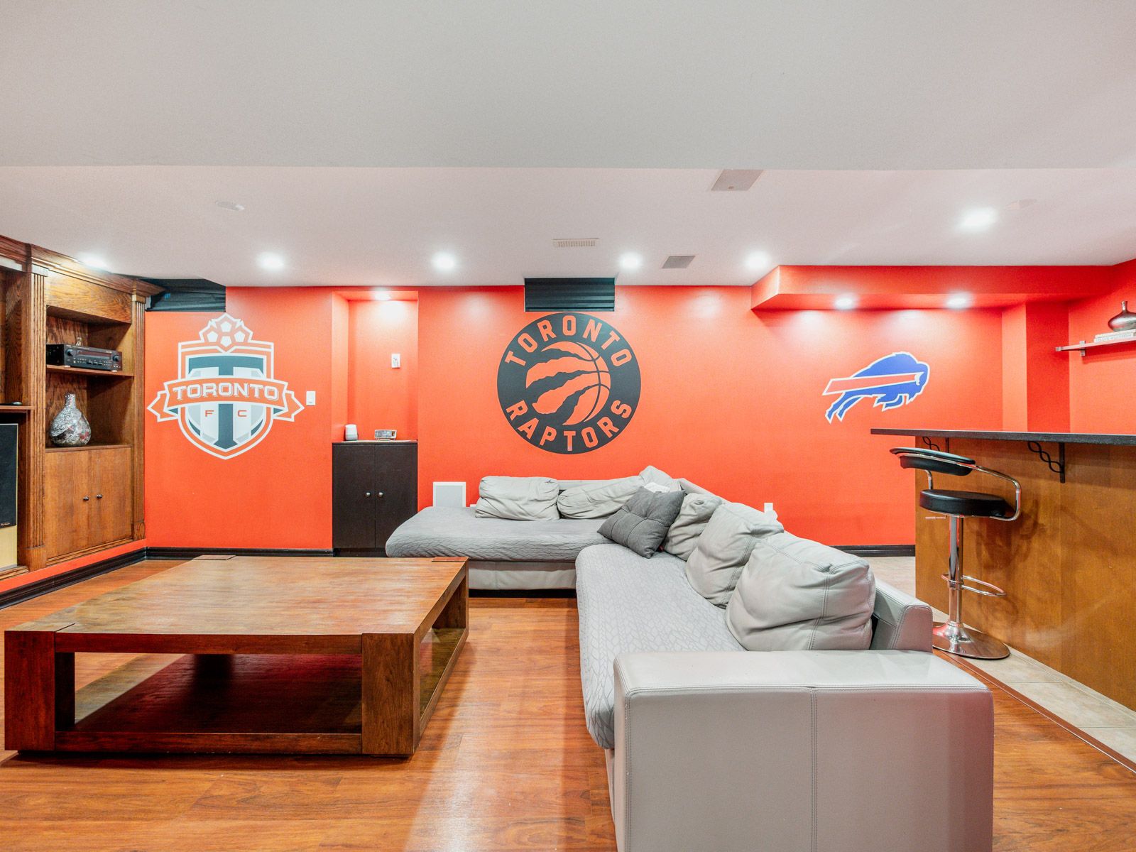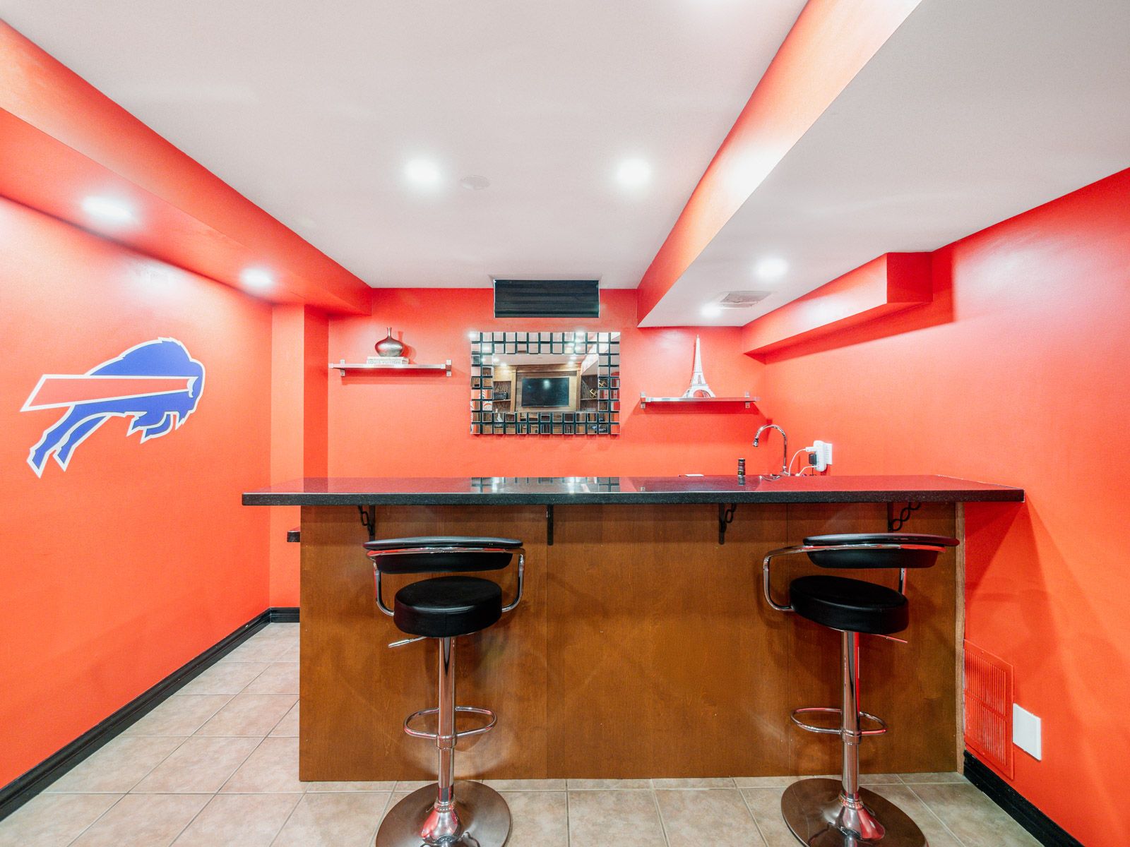 • Finished basement with rec area, built-in bar, and ample storage space.