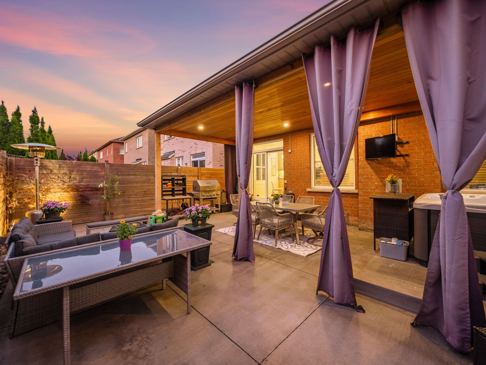• Private backyard with stamped concrete, pergola, and hot tub for relaxation.