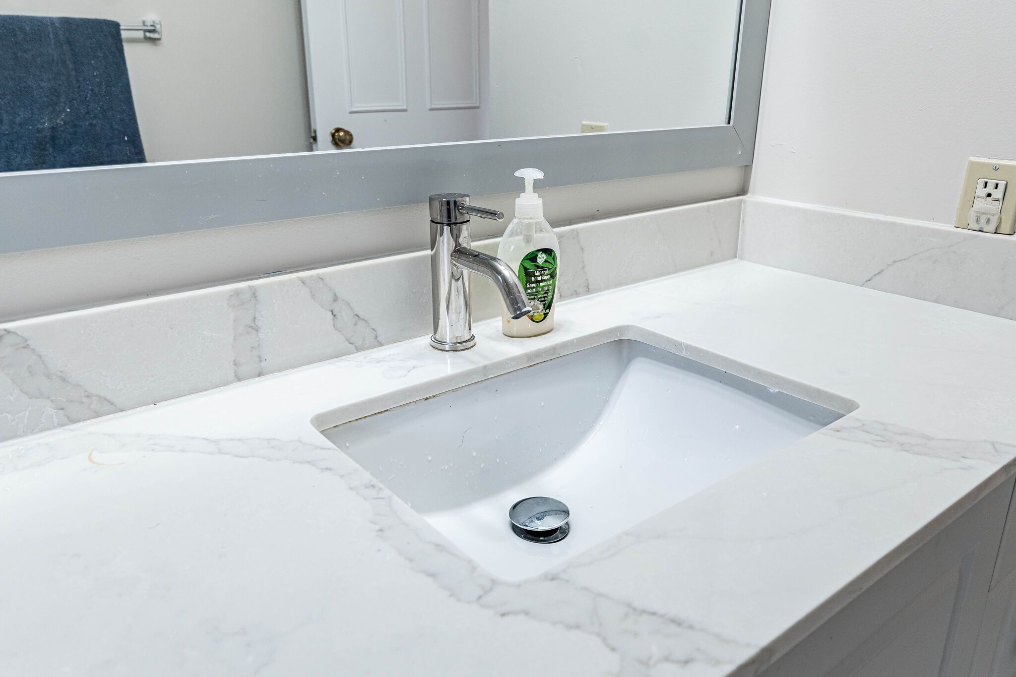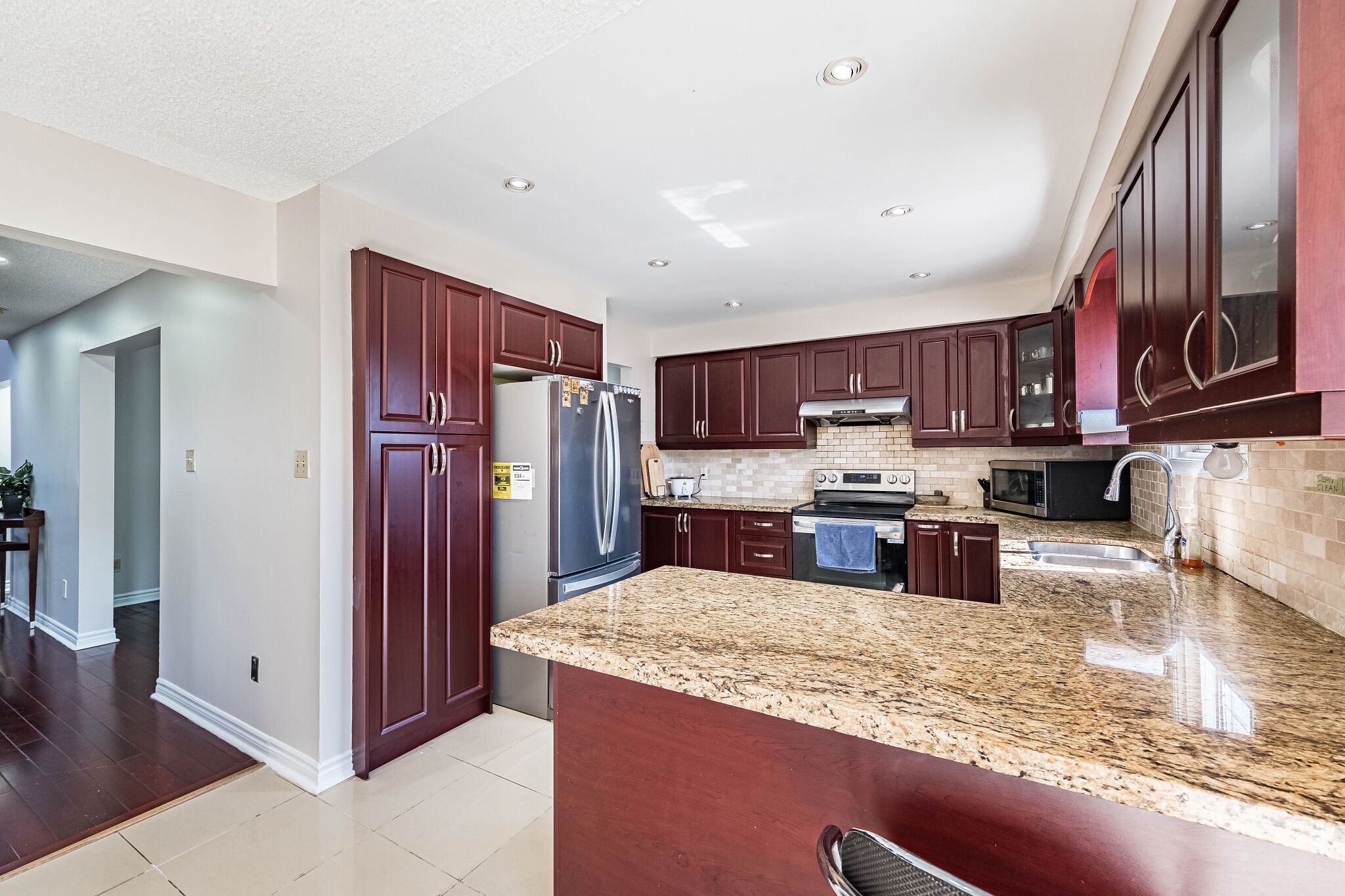 • Modern kitchen with granite countertops and stainless steel appliances.