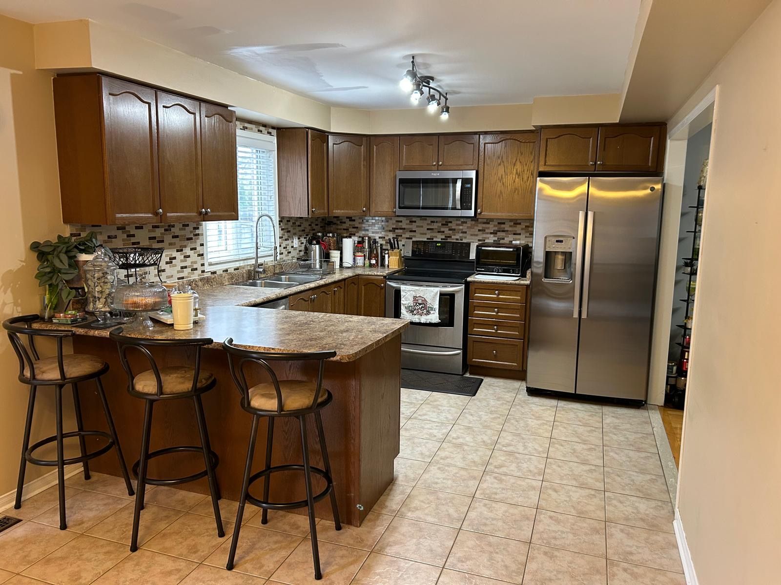 • Functional kitchen with stainless steel appliances and breakfast seating for six.