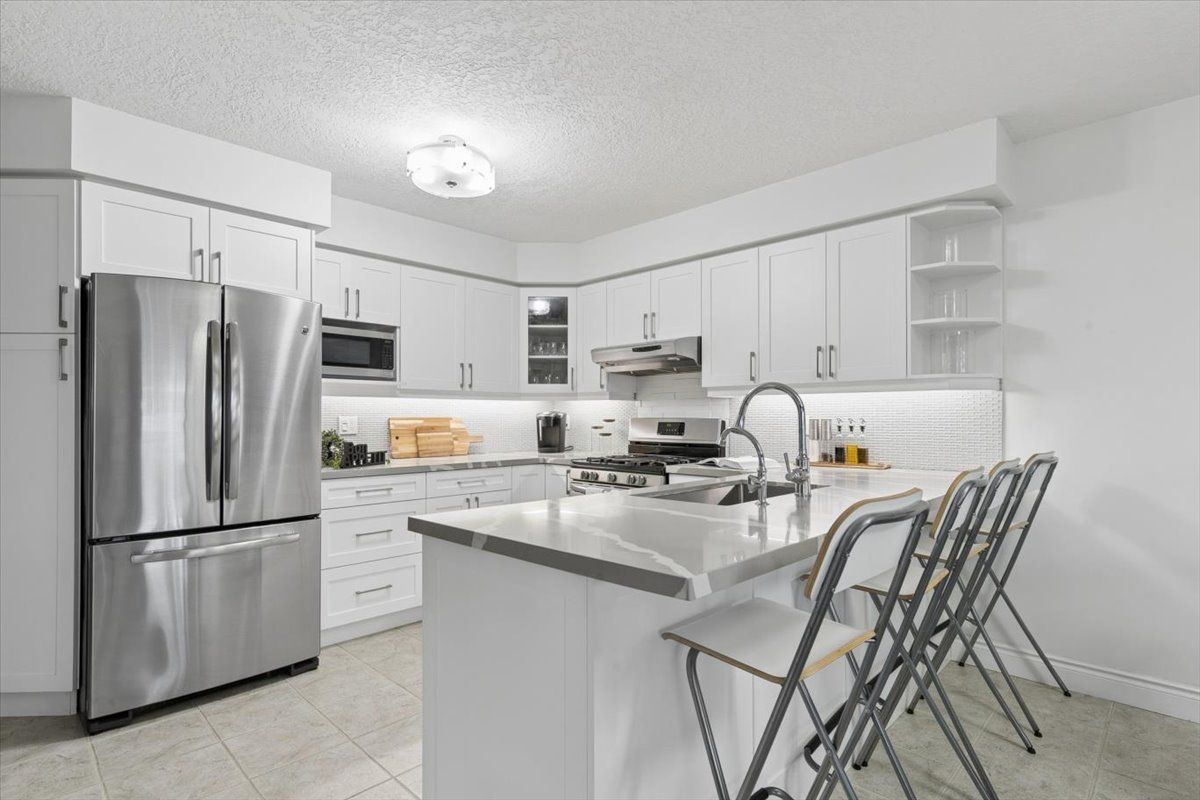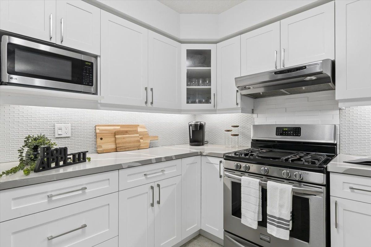 • Stylish kitchen with white cabinetry, quartz countertops, and breakfast bar.
