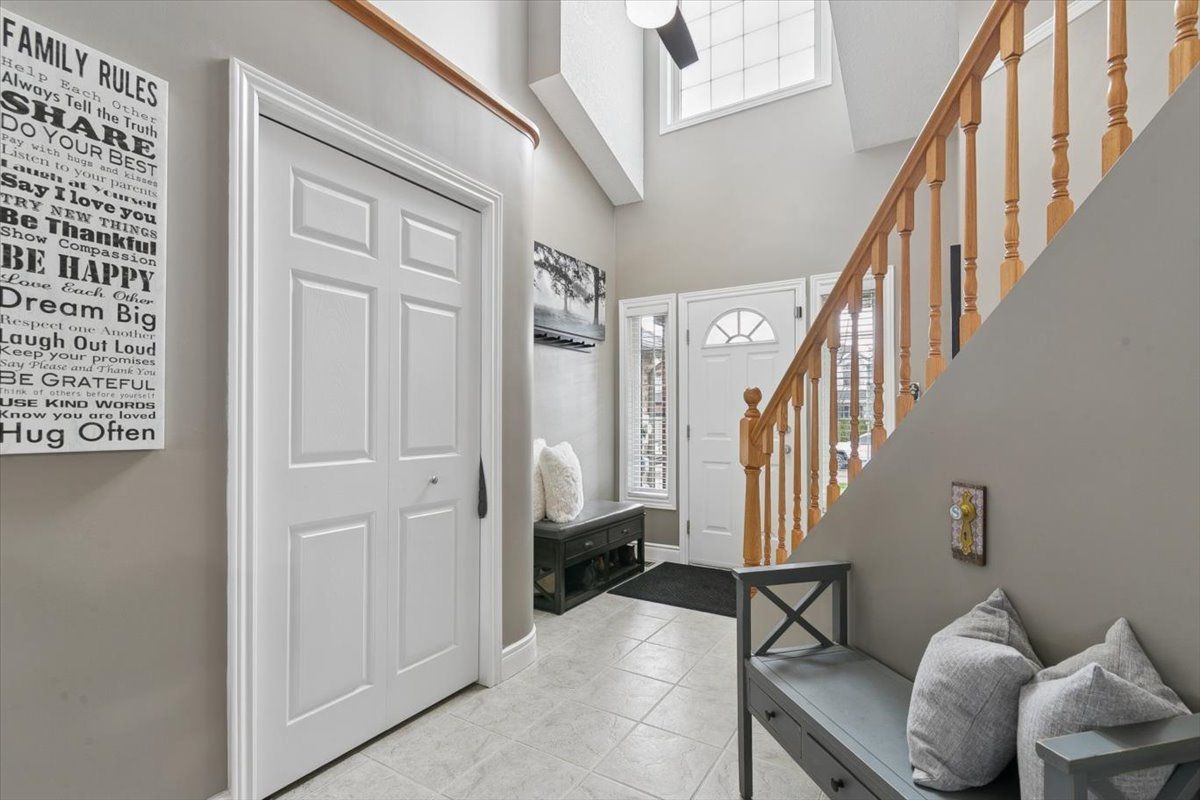• Open concept design with high ceilings and rich wood flooring.