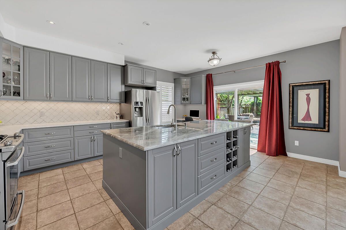 • Renovated gourmet kitchen features a large island and modern appliances.