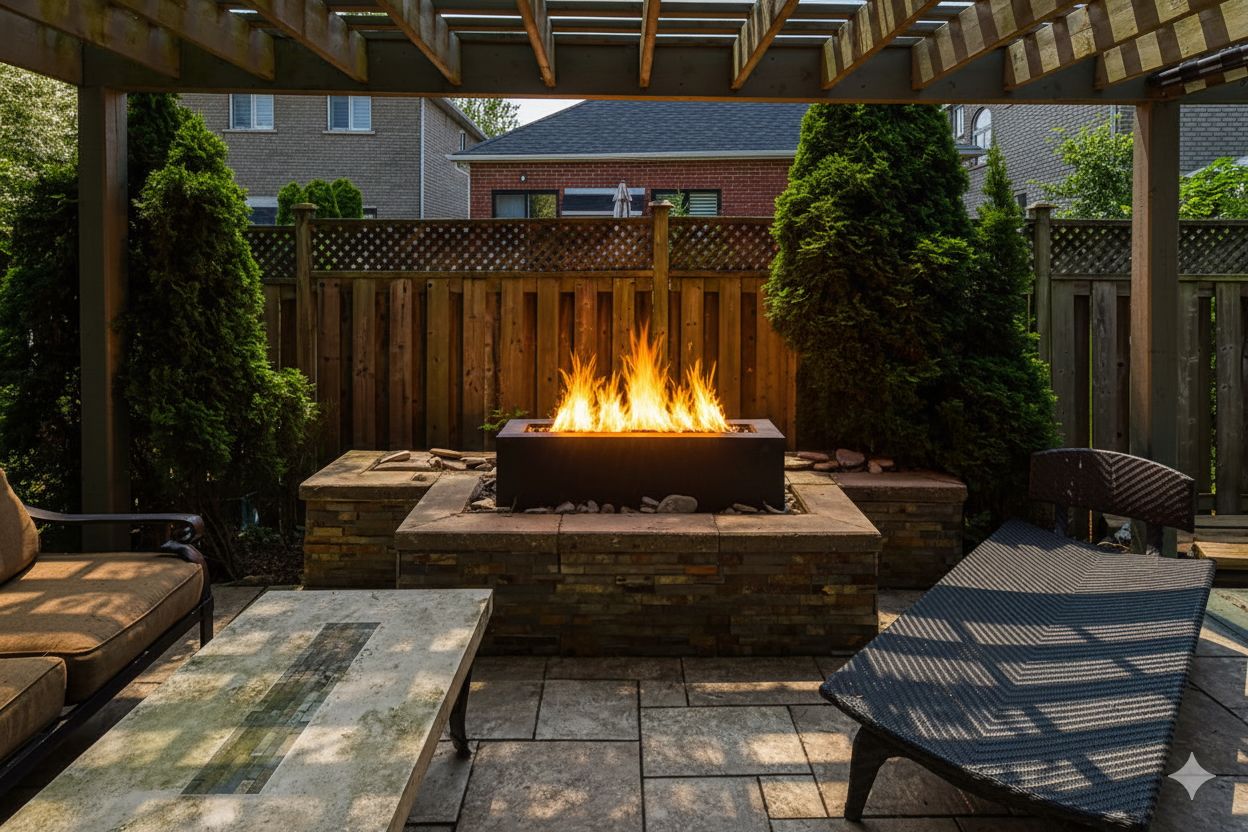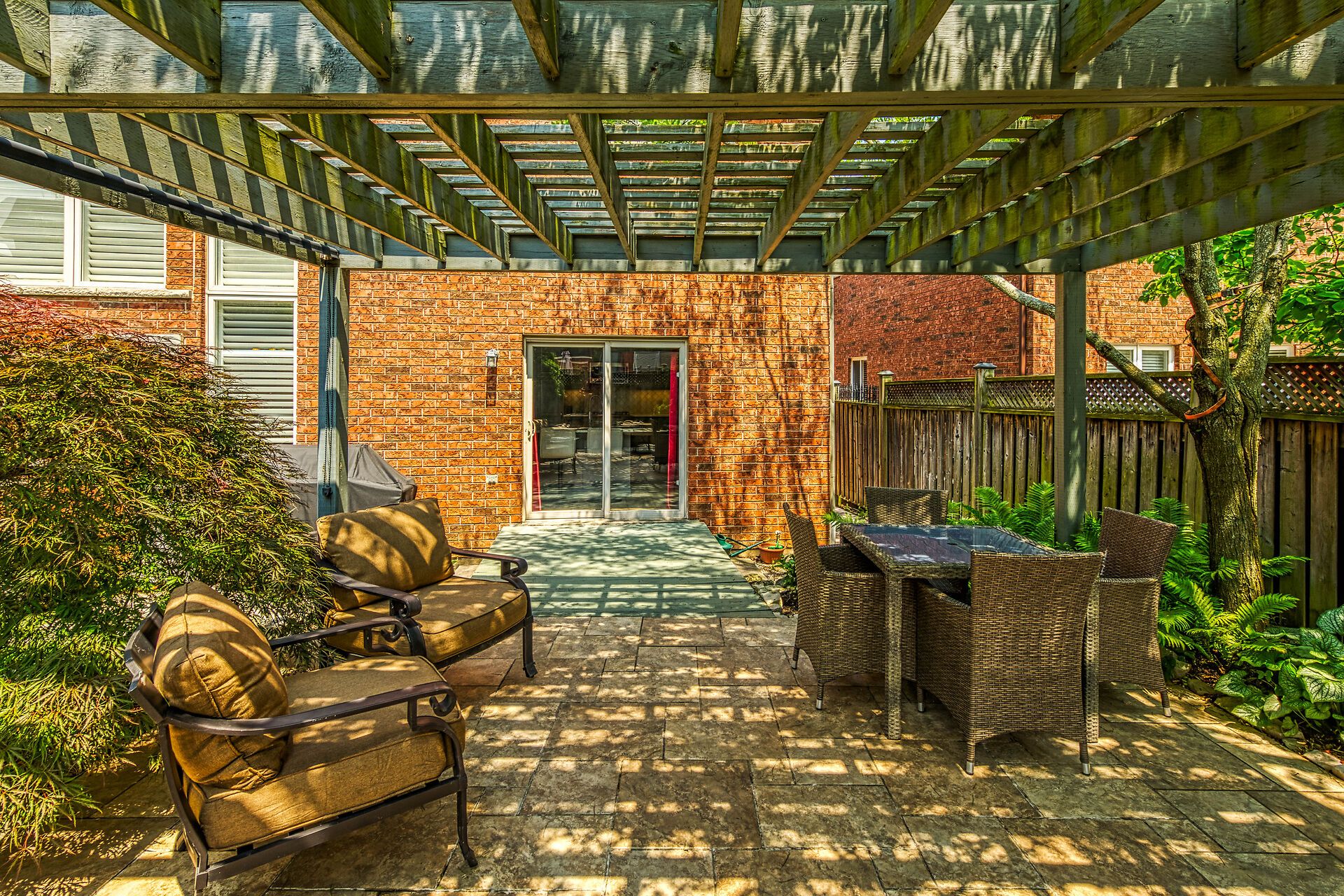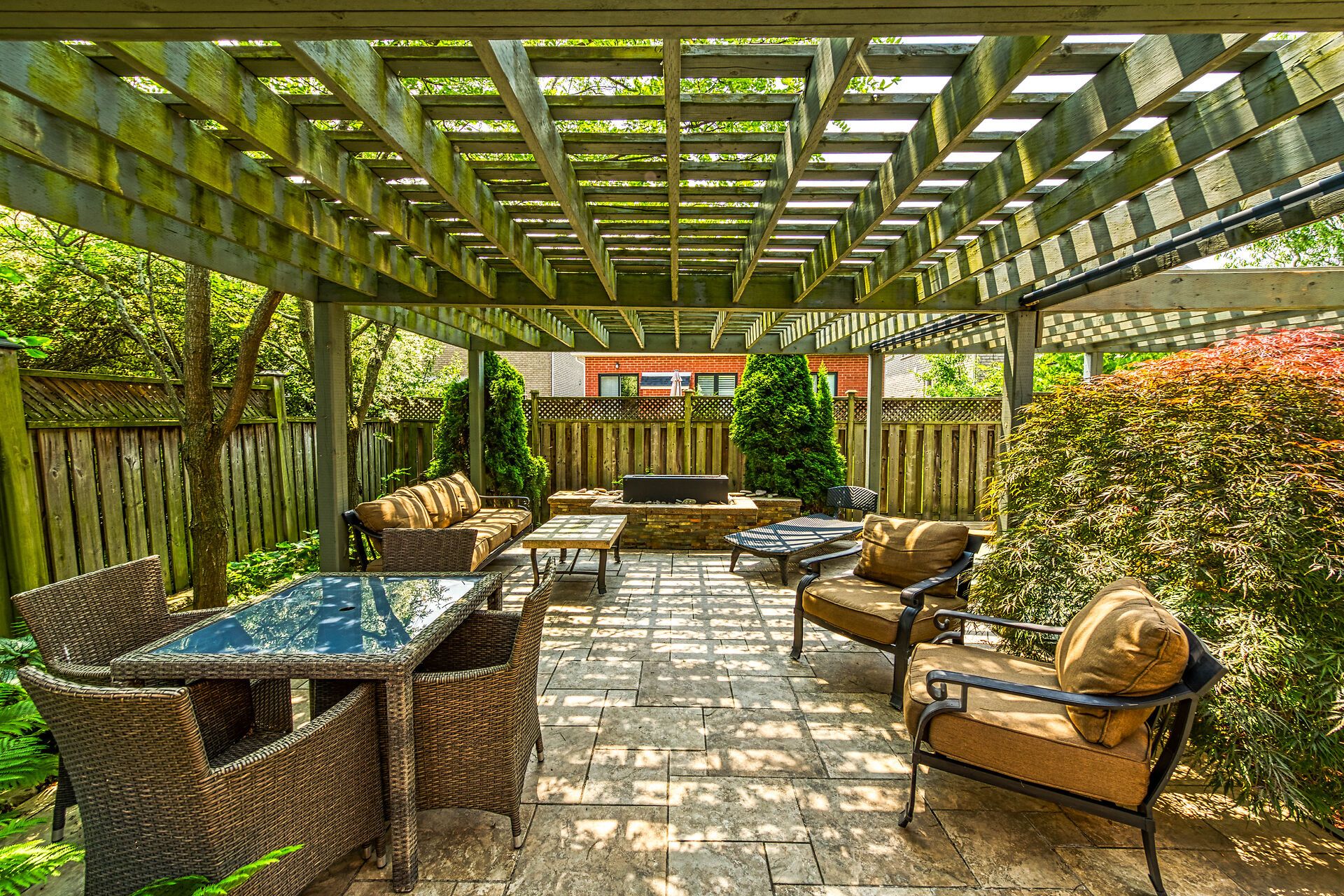 • Private yard with outdoor fireplace, gazebo, and vegetable garden.