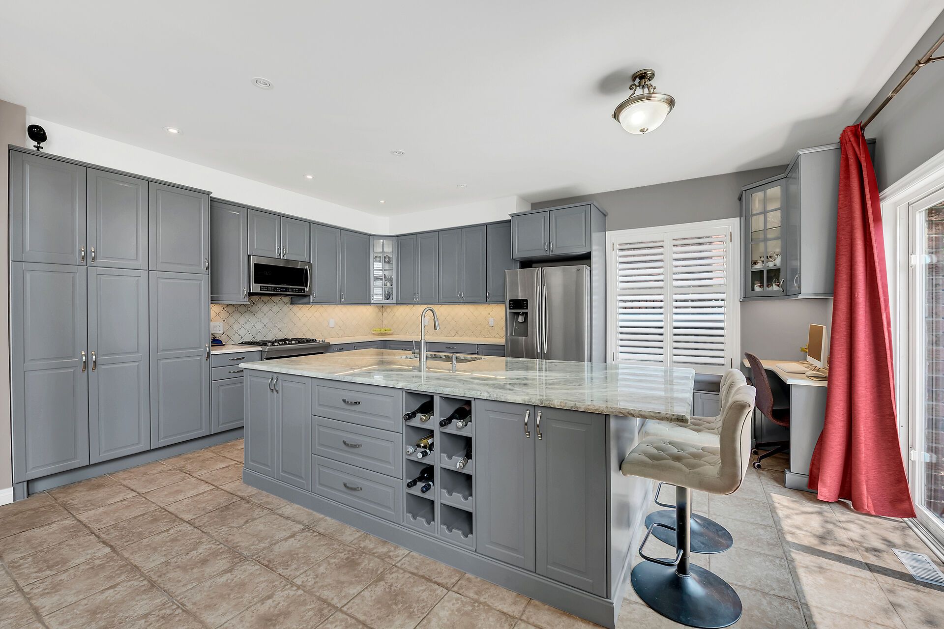 • Renovated gourmet kitchen with large island and modern appliances.