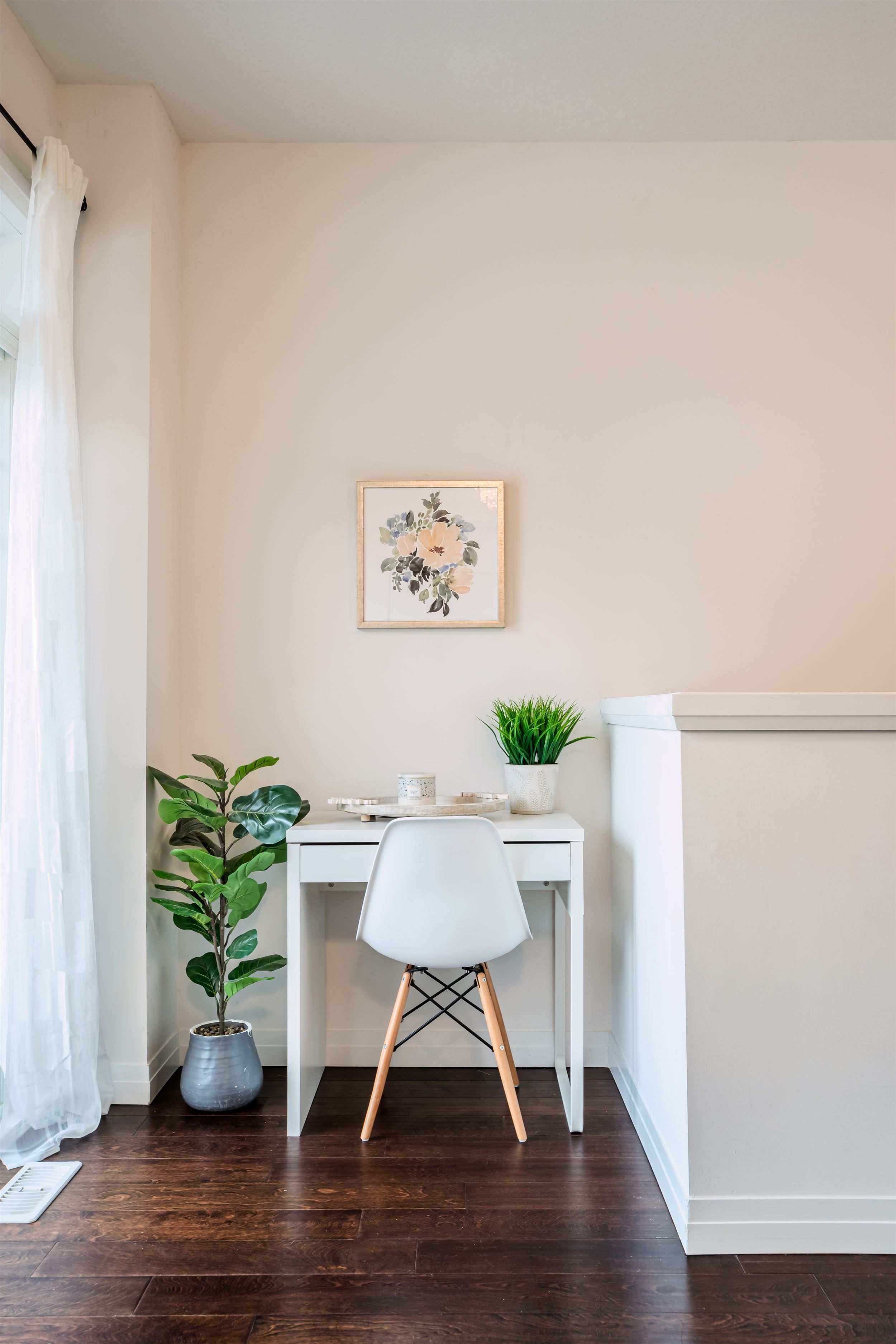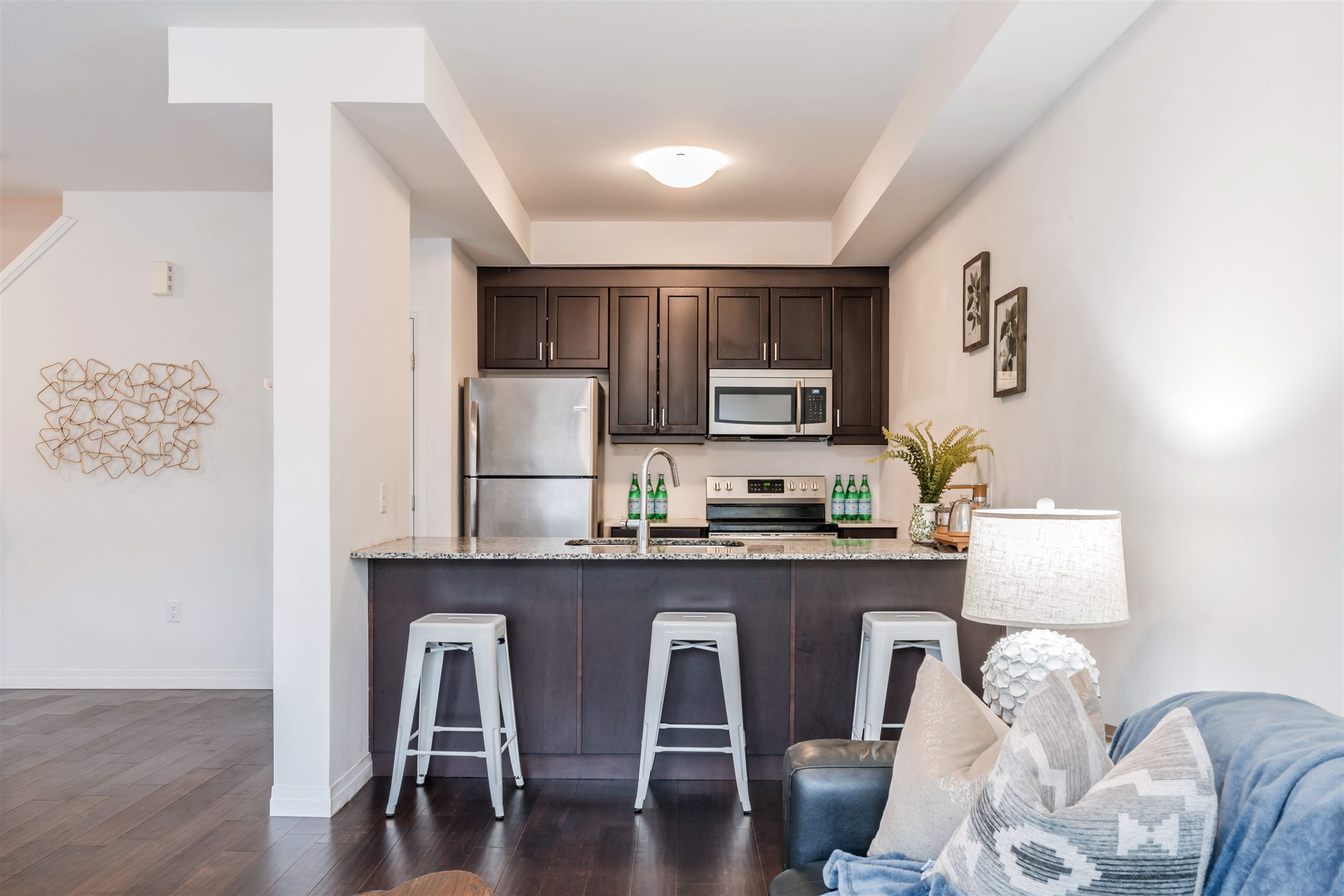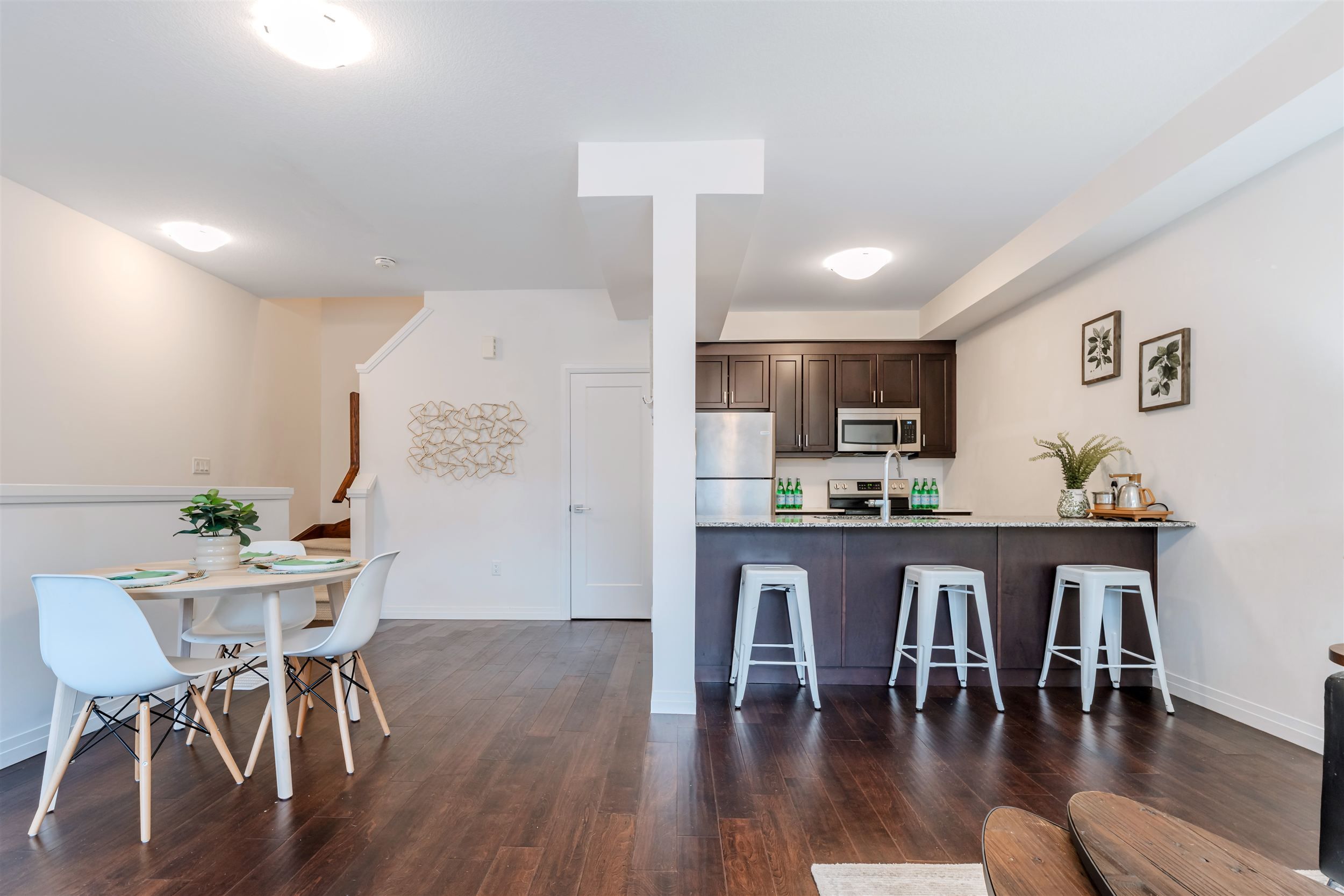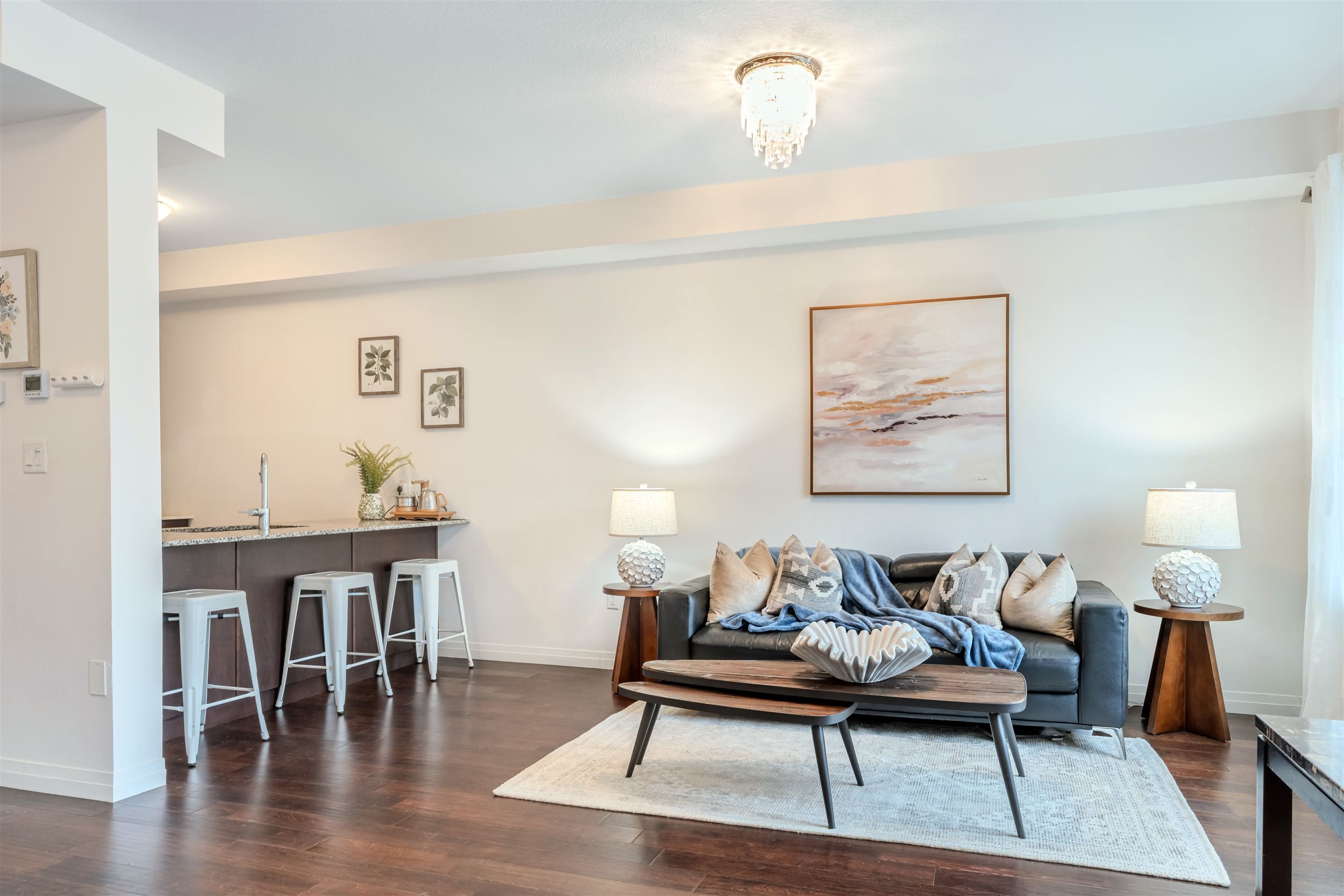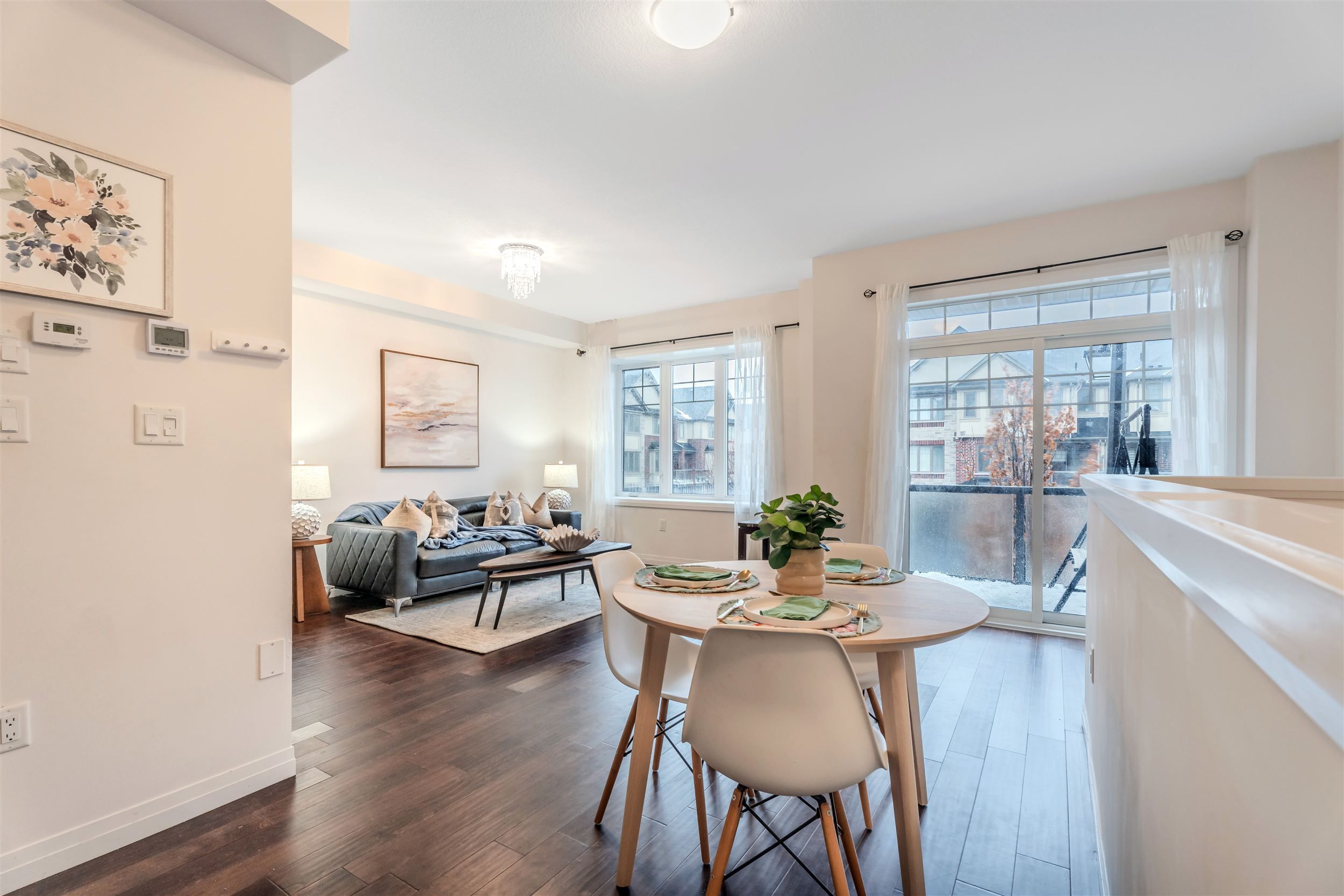 • Open-concept living area with luxury hardwood floors and natural light.