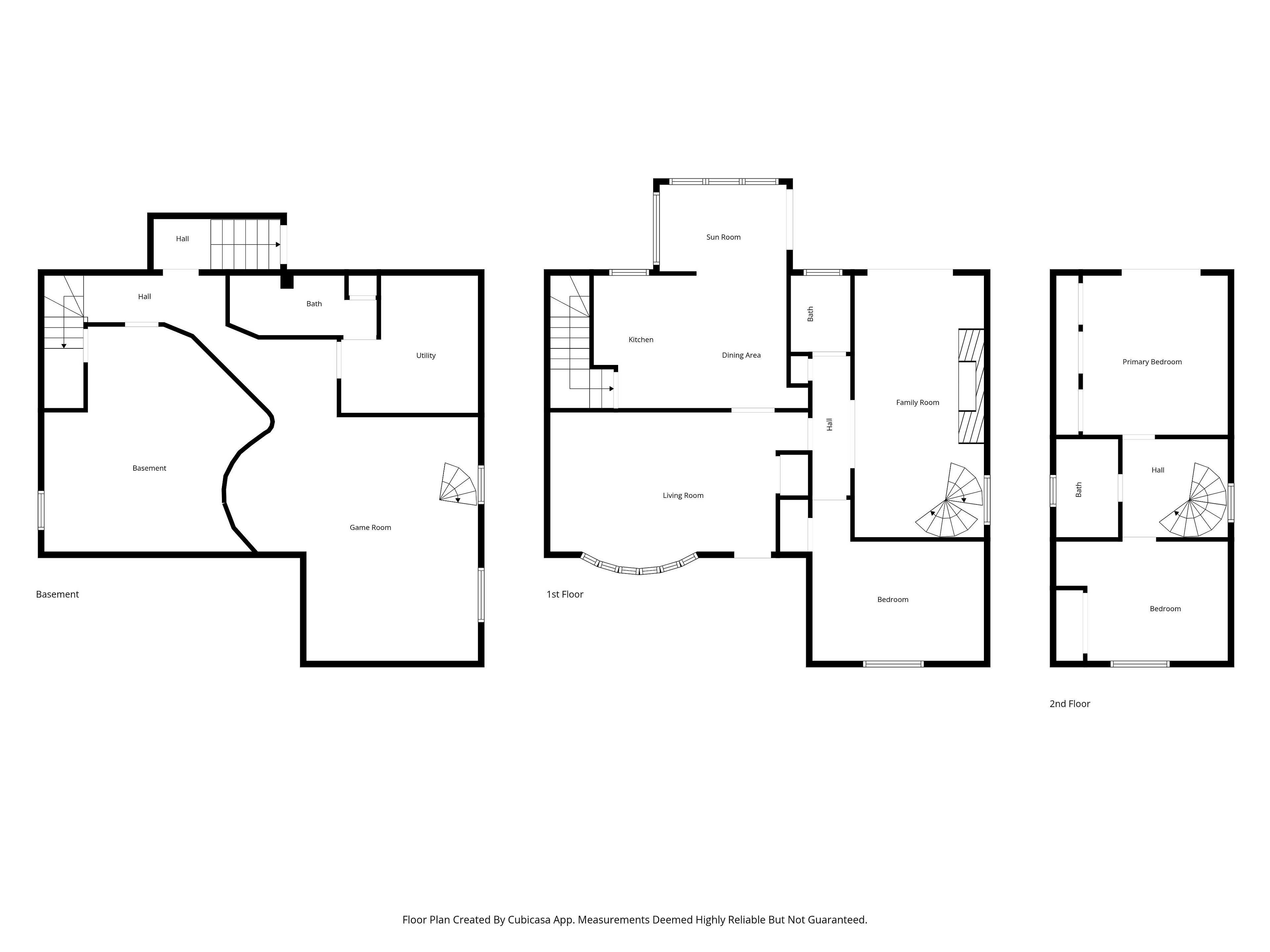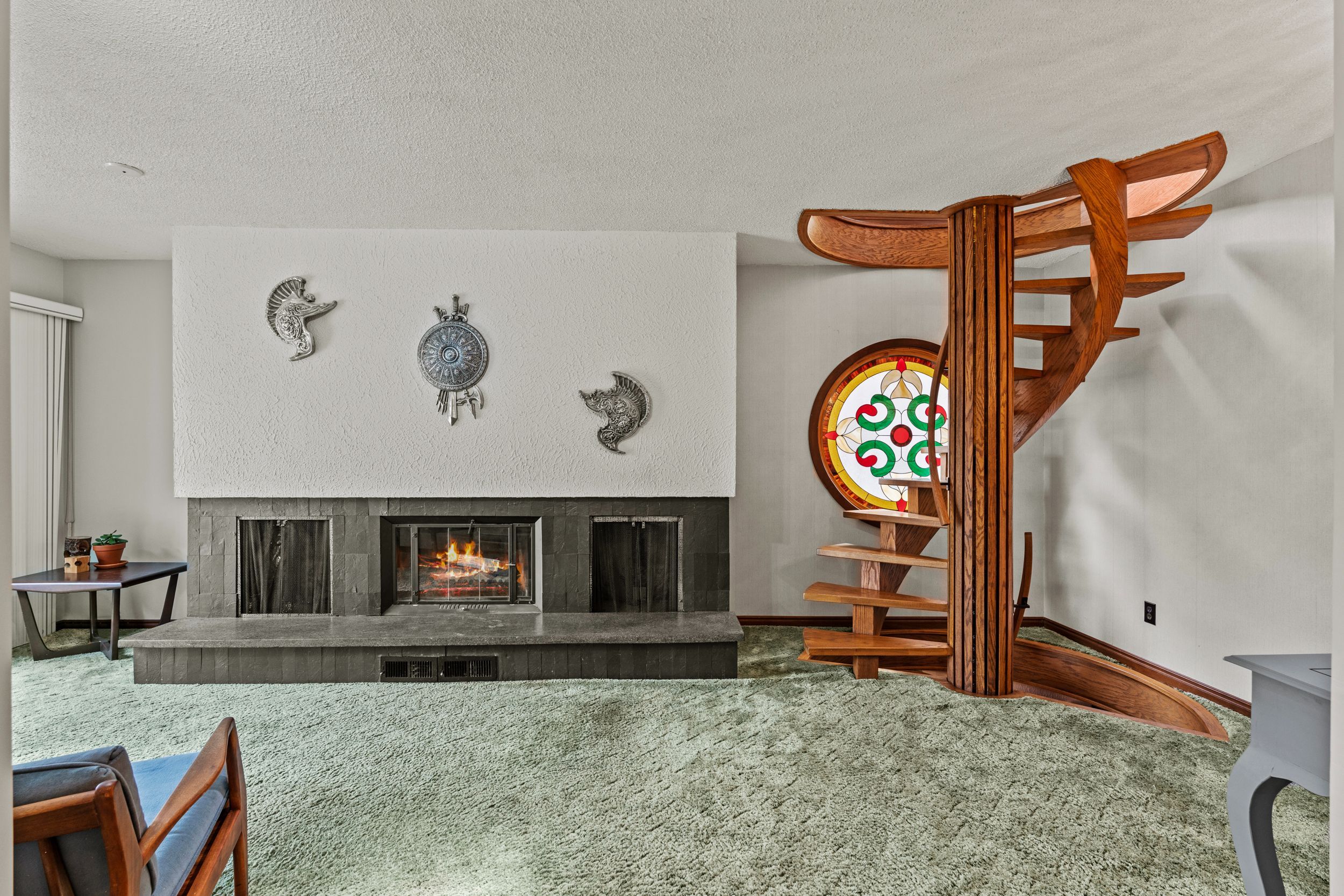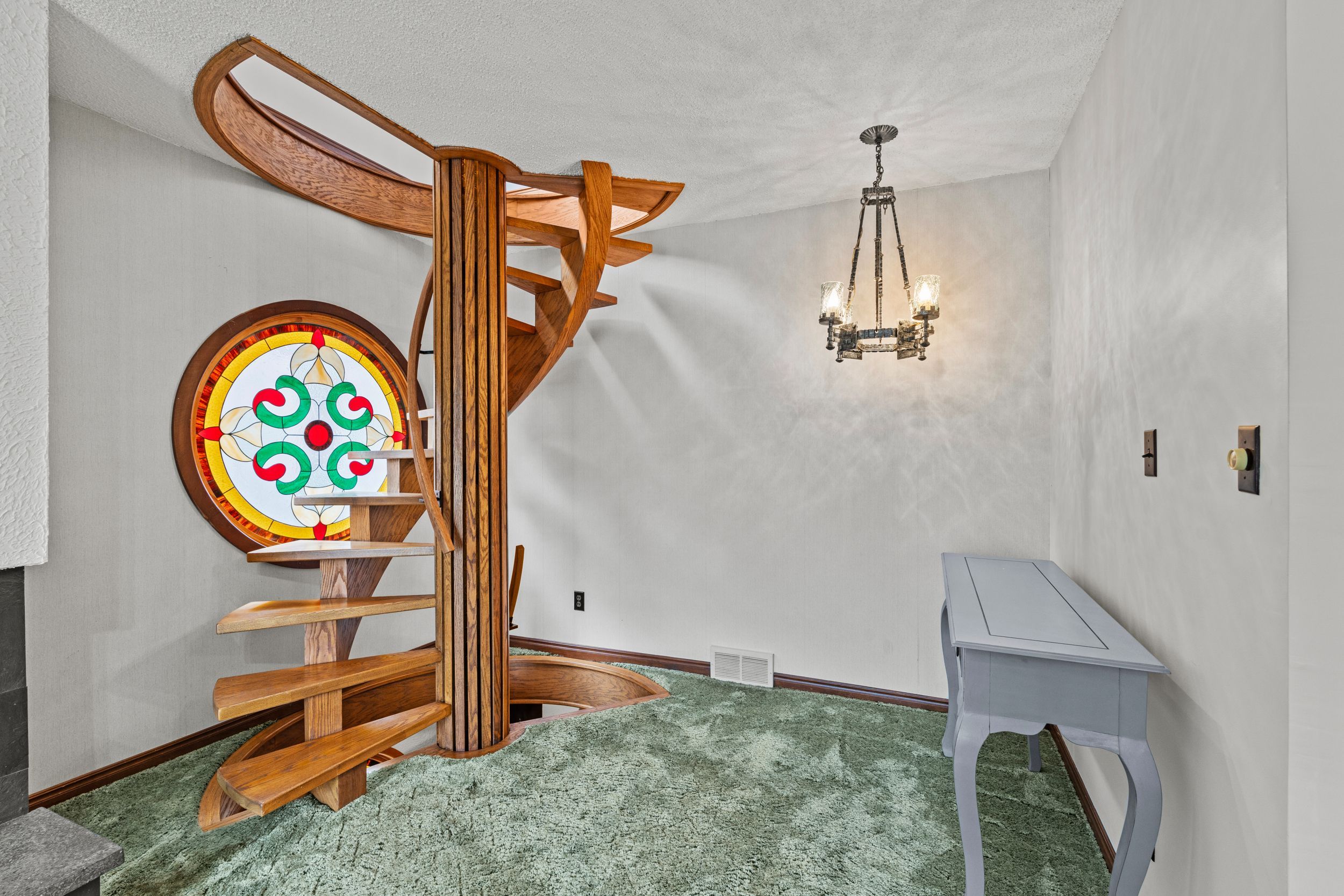 • Custom handmade spiral staircase adds charm and connects all three levels.