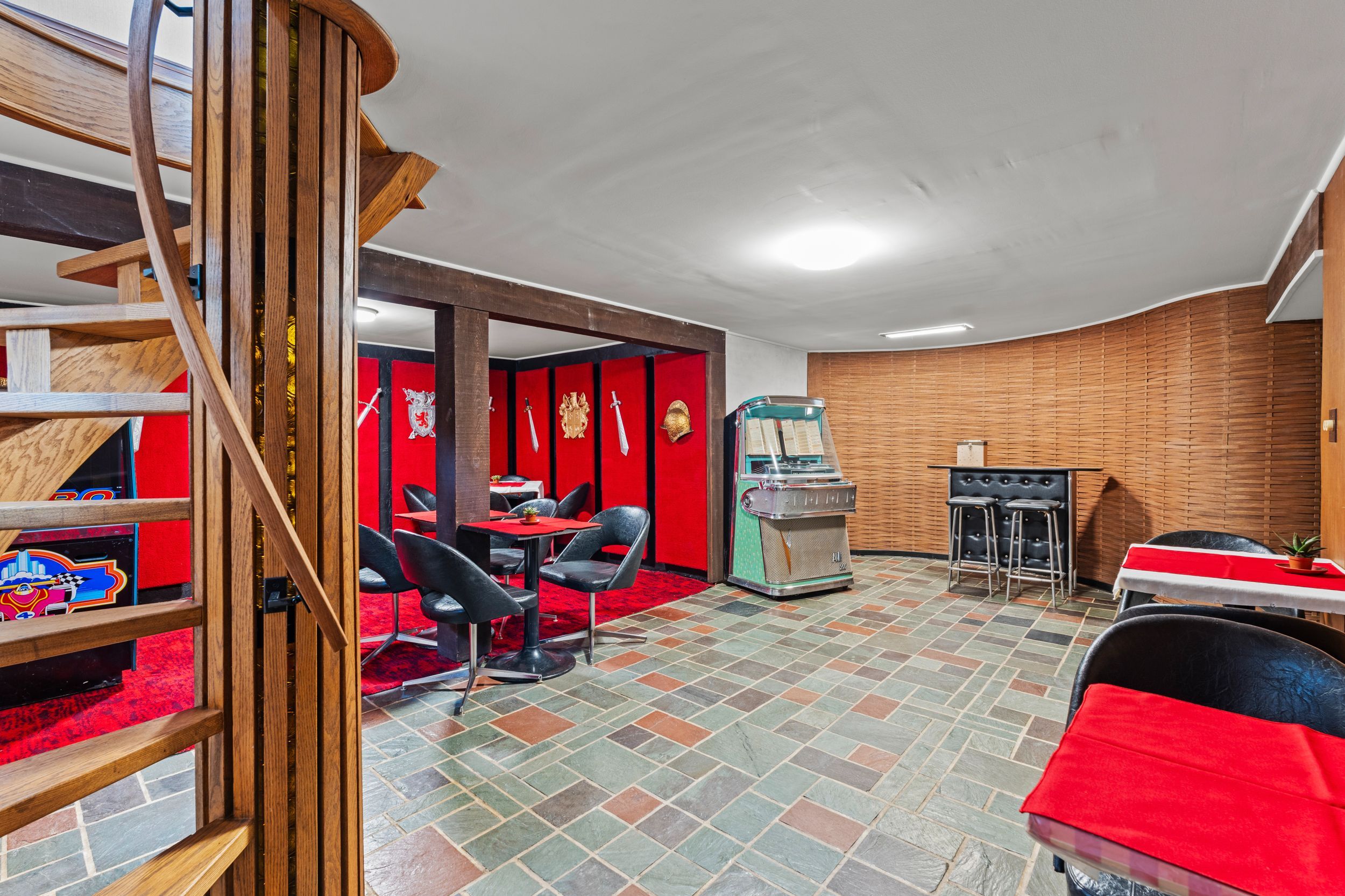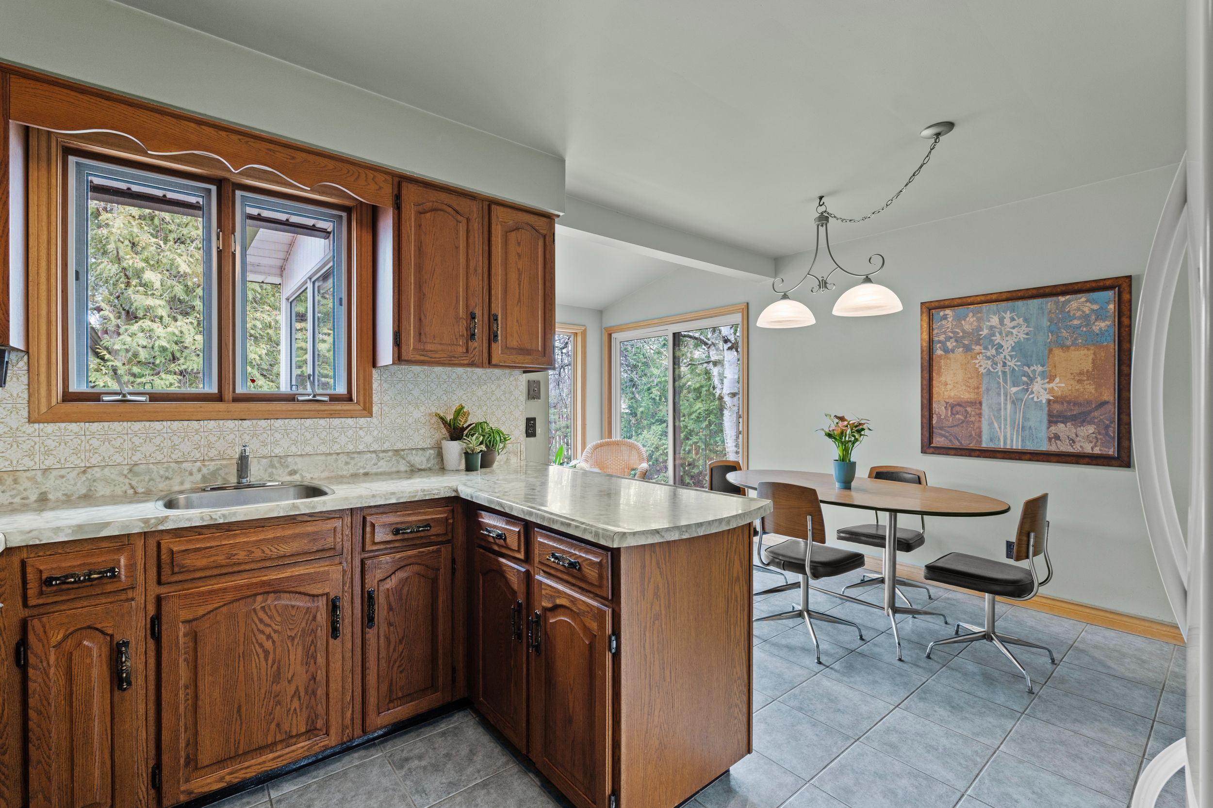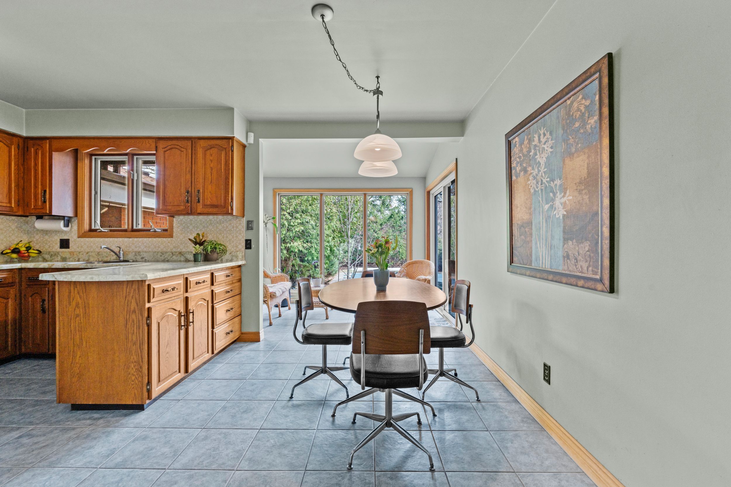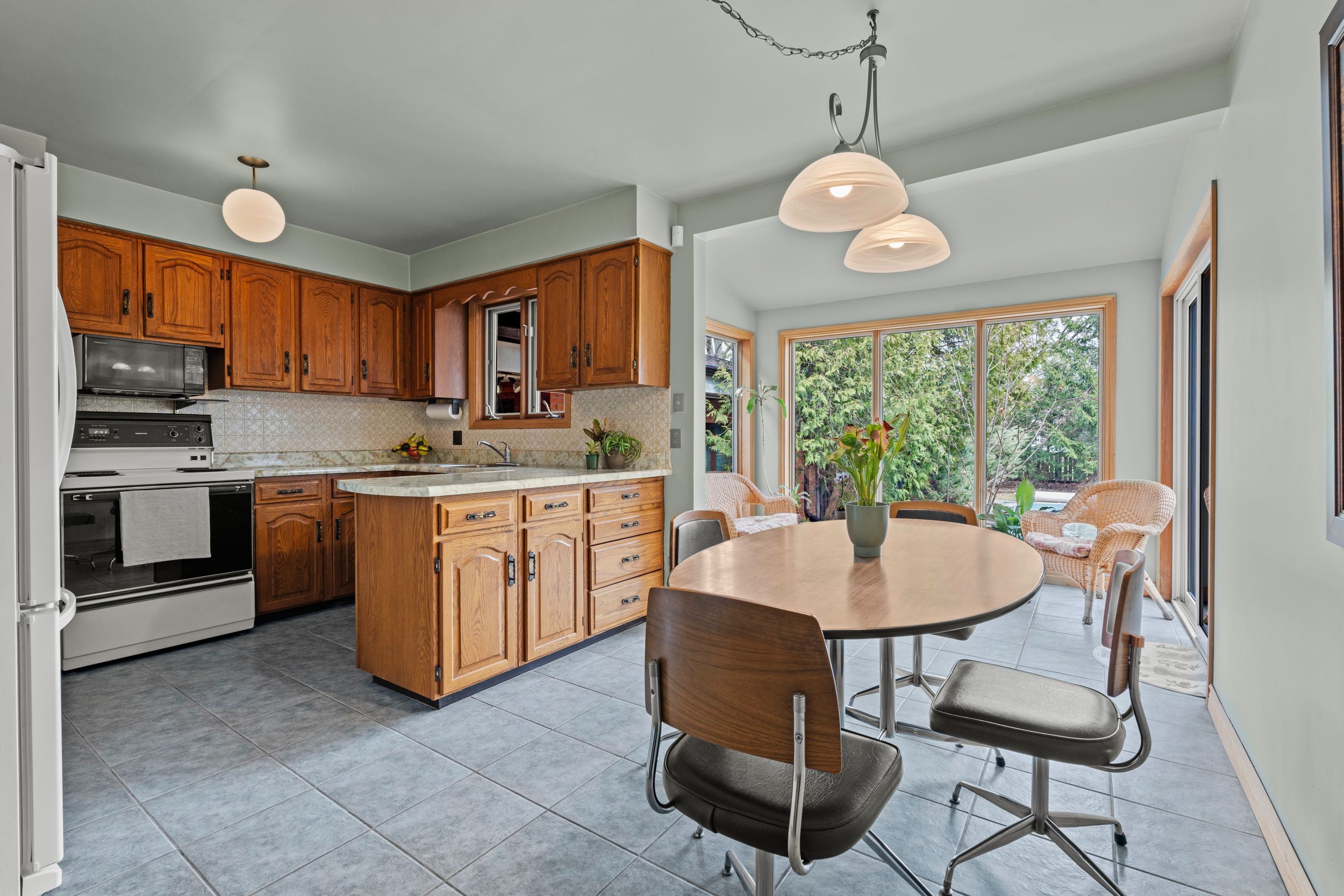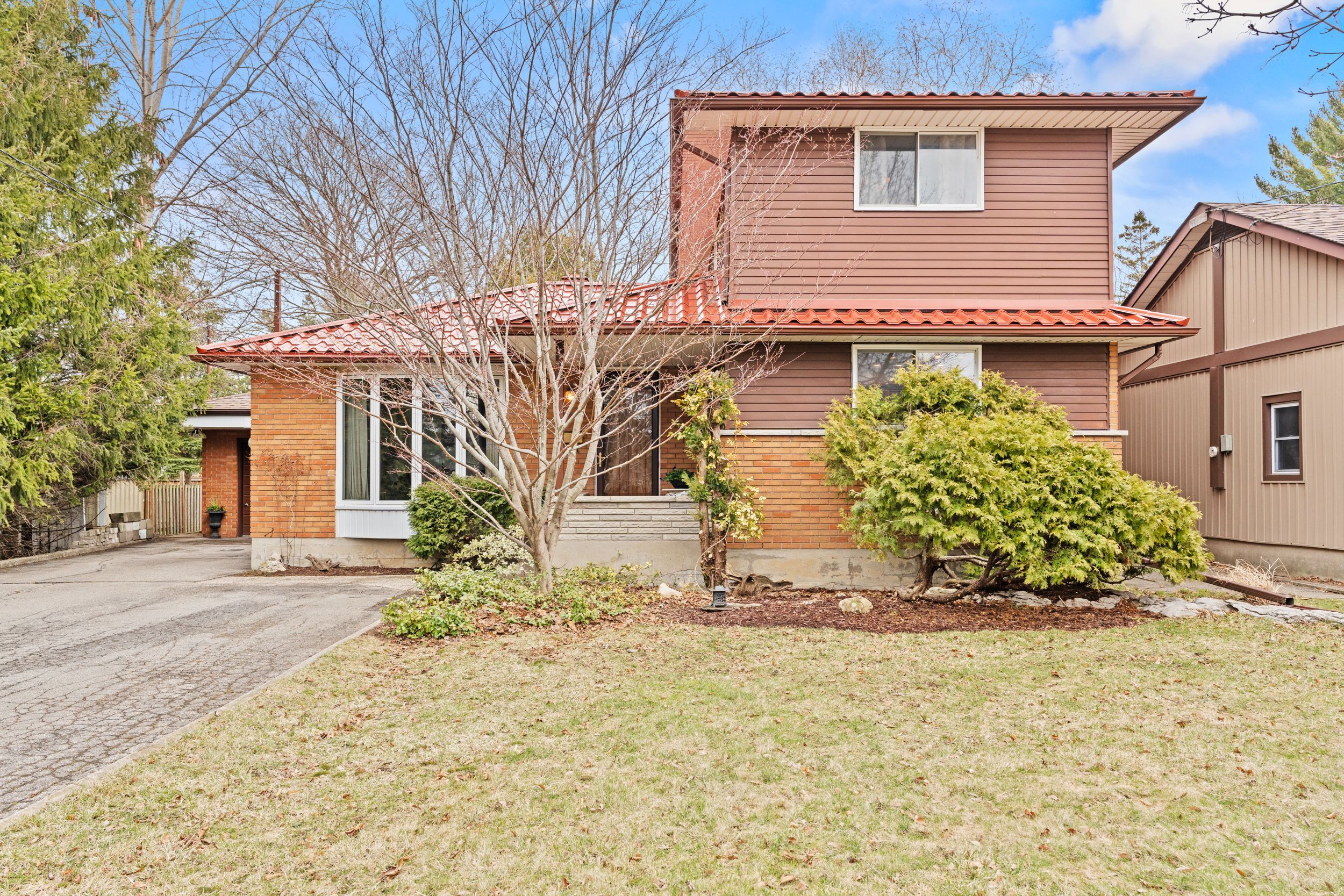 If you're looking for a cookie cutter home, this isn't it. If you want something truly special then you're going to love what this north end property has to offer! Located just off parnell road and minutes from lake ontario, this beautifully maintained two storey home sits on a large private lot with ample parking and a setting that's hard to find. Step inside and you're immediately greeted by mid-century character. The slate tile foyer leads into a bright formal living room highlighted by a large picture window that fills the space with natural light. The kitchen offers generous space with an eat-in dining area and opens to a panoramic sitting area overlooking the backyard and pool. A standout feature is the main floor family room with a slate woodburning fireplace and a custom handmade spiral staircase that connects all three levels. The staircase is a true focal point, complemented by custom stained glass windows. This space also features patio doors to the backyard along with a main floor bedroom and two piece bathroom. Upstairs, you'll find two spacious bedrooms with ample closet space and a four piece bathroom. The lower level offers excellent flexibility with separate access from both the spiral staircase and a secondary staircase off the kitchen with side door entry, ideal for in-law potential. This level includes a large rec-room, storage, cold cellar, laundry and a three piece bathroom. The oversized heated garage features its own hydro service and is roughed in for a pool heater. The yard is thoughtfully designed with a private pool area plus a separate green space tucked behind, giving you more usable outdoor space than expected. A rare opportunity to own a home with character, space and versatility in one of the north-end's most desirable locations.