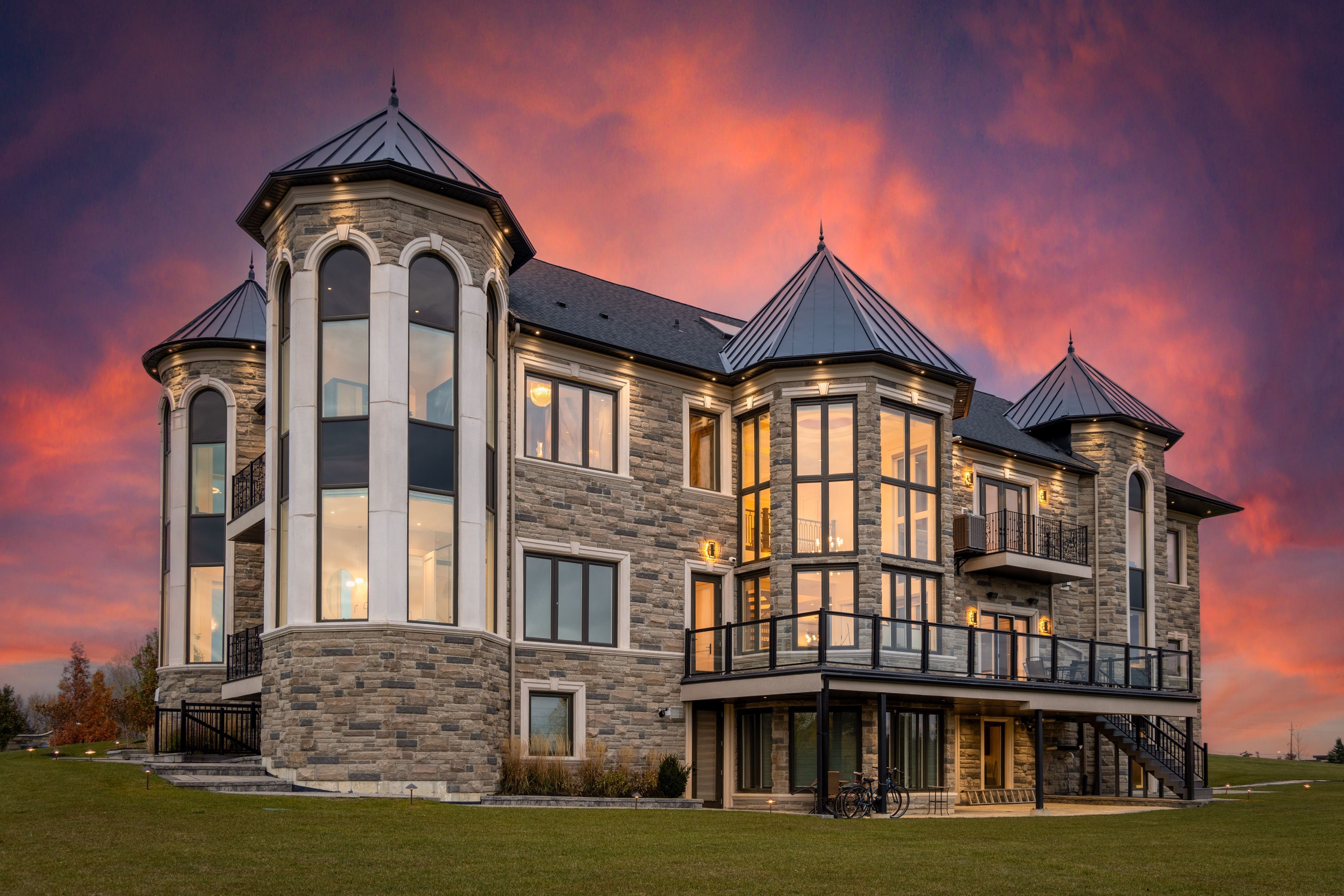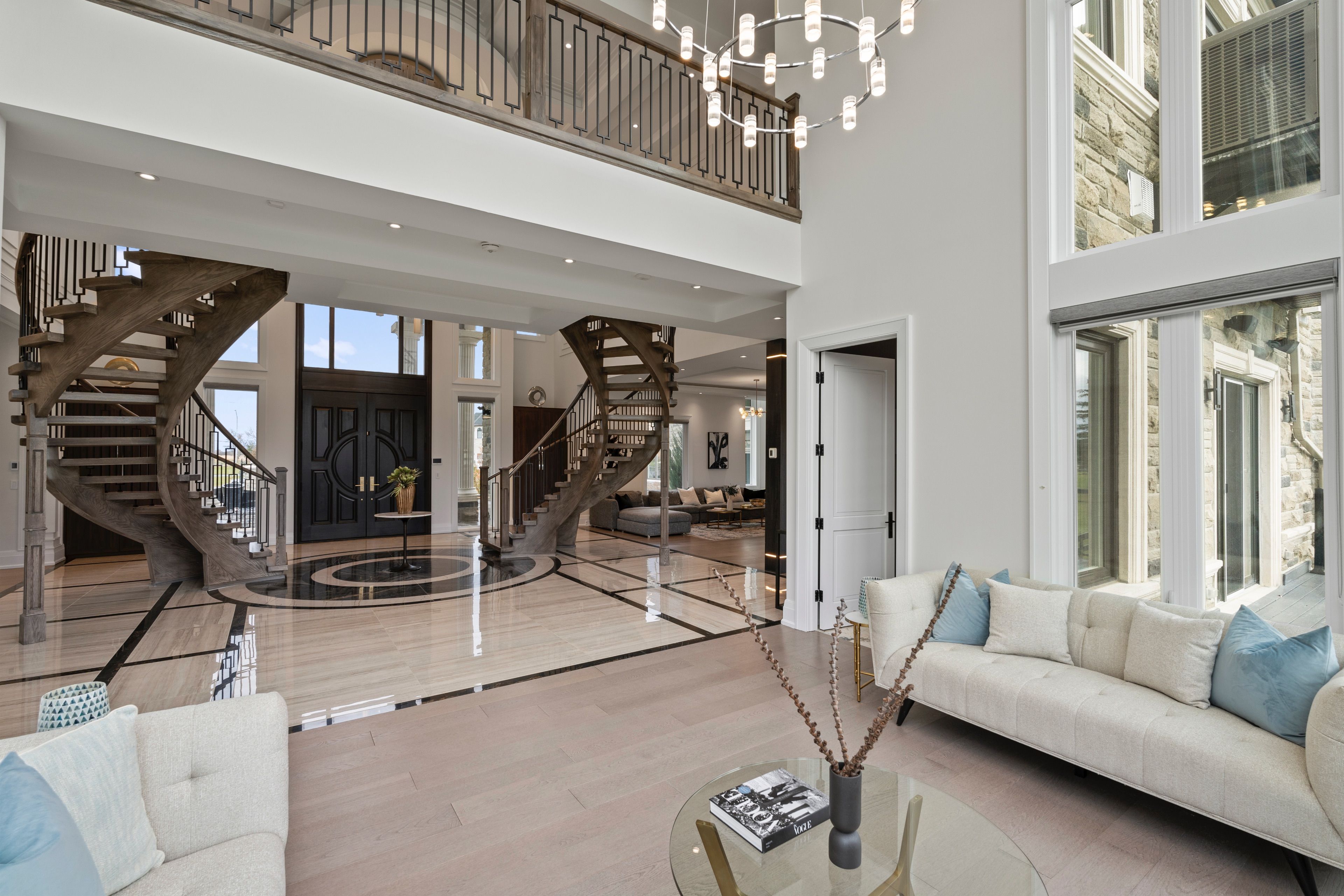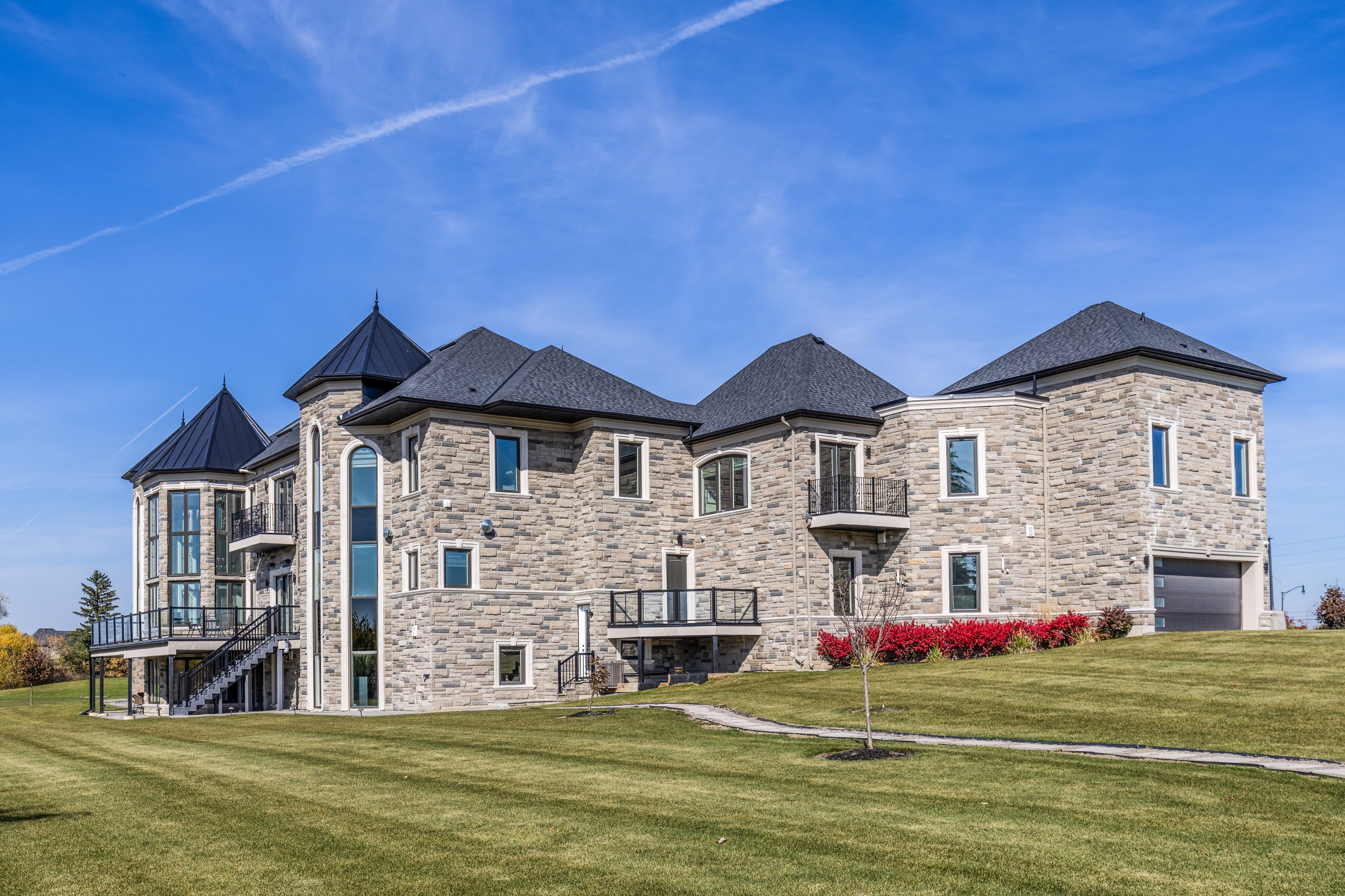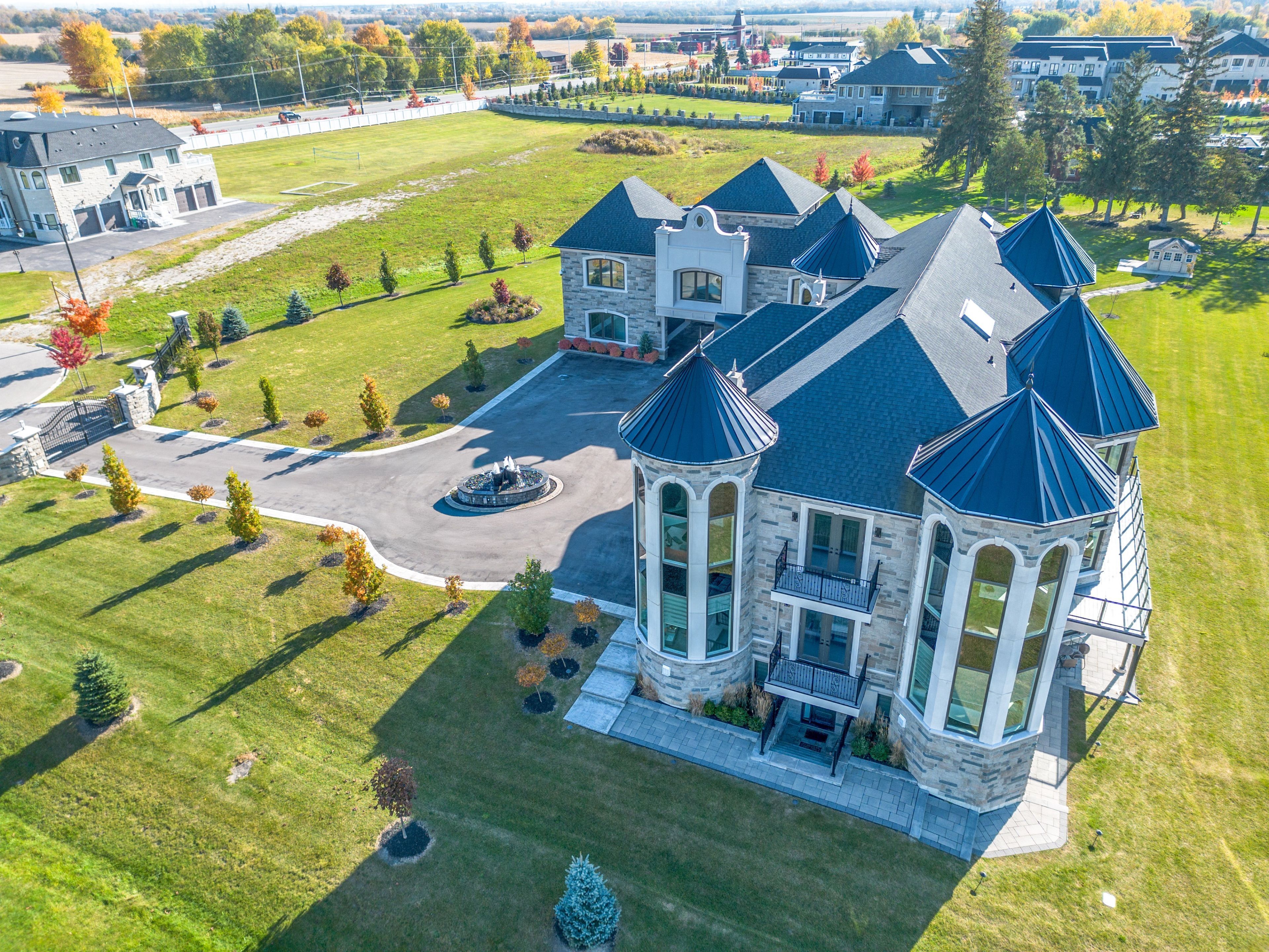 Welcome to 4 st. Lukes court, a breathtaking 13,000+ sq. Ft. Estate set on two pristine acres with scenic ravine views, nestled in the prestigious castlemore estates neighbourhood. This modern victorian-inspired masterpiece combines timeless architecture with state-of-the-art luxury, showcasing a grand stone exterior, soaring turret towers and a dramatic double staircase beneath 22 ft. Ceilings. At the heart of the home lies a stunning chefs kitchen, featuring dual waterfall islands, top-tier wolf and miele appliances, and a separate spice kitchen offering both beauty and functionality for everyday living and exceptional entertaining. The upper level boasts five spacious bedrooms, including three stunning primary suites with spa-like ensuites, private balconies, and a turreted lounge. The above-ground lower level offers a legal two-bedroom in-law suite, home theatre, gym, sauna, and entertainment lounges with full kitchen and bar. Complemented by sun-filled spaces enhanced with opulent finishes throughout, each level seamlessly accessible by a custom elevator for seamless accessibility. Featuring a five-car garage, grand fountain courtyard, expansive deck, and meticulously landscaped grounds, this one-of-a-kind estate is a must see!