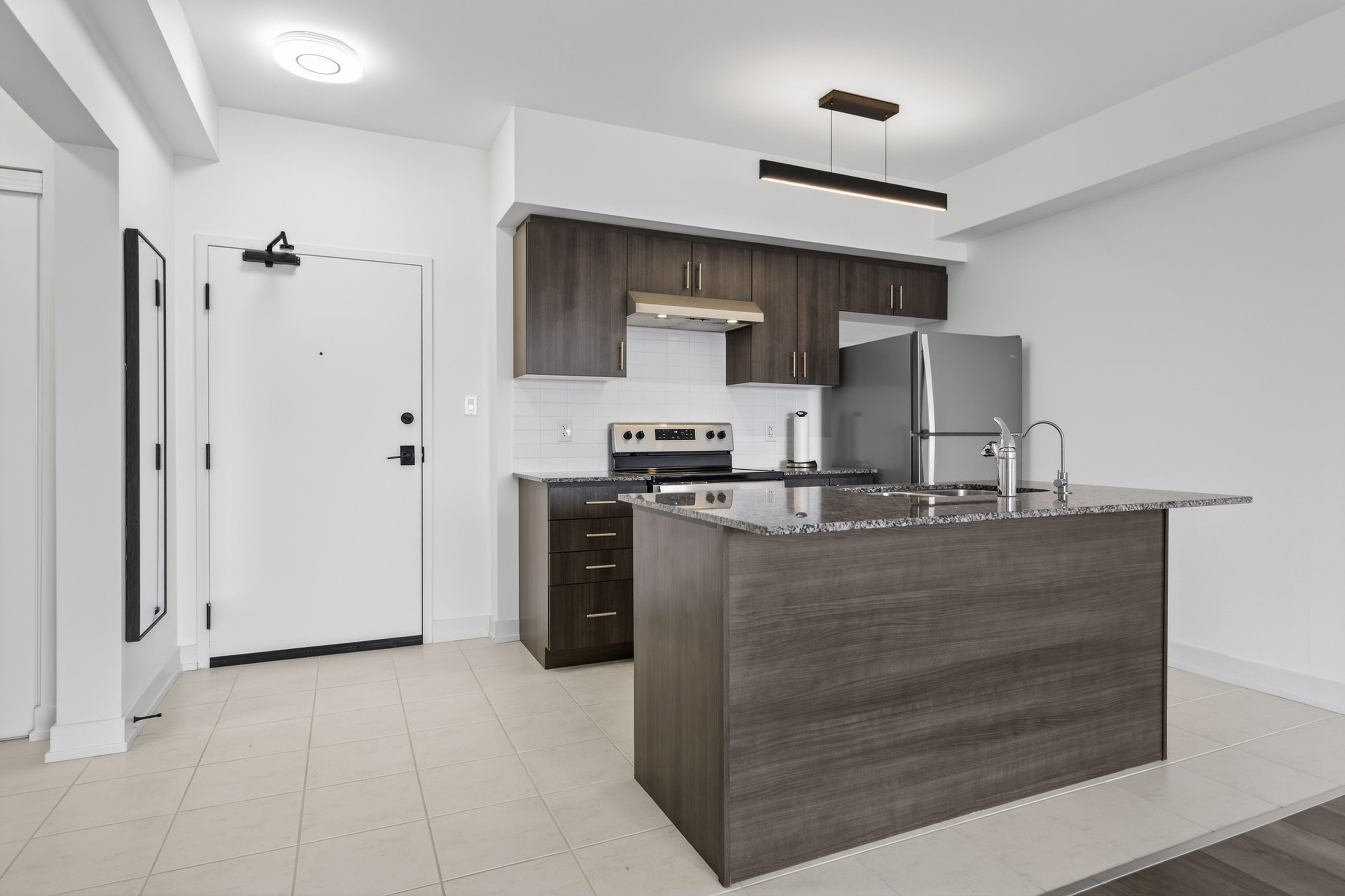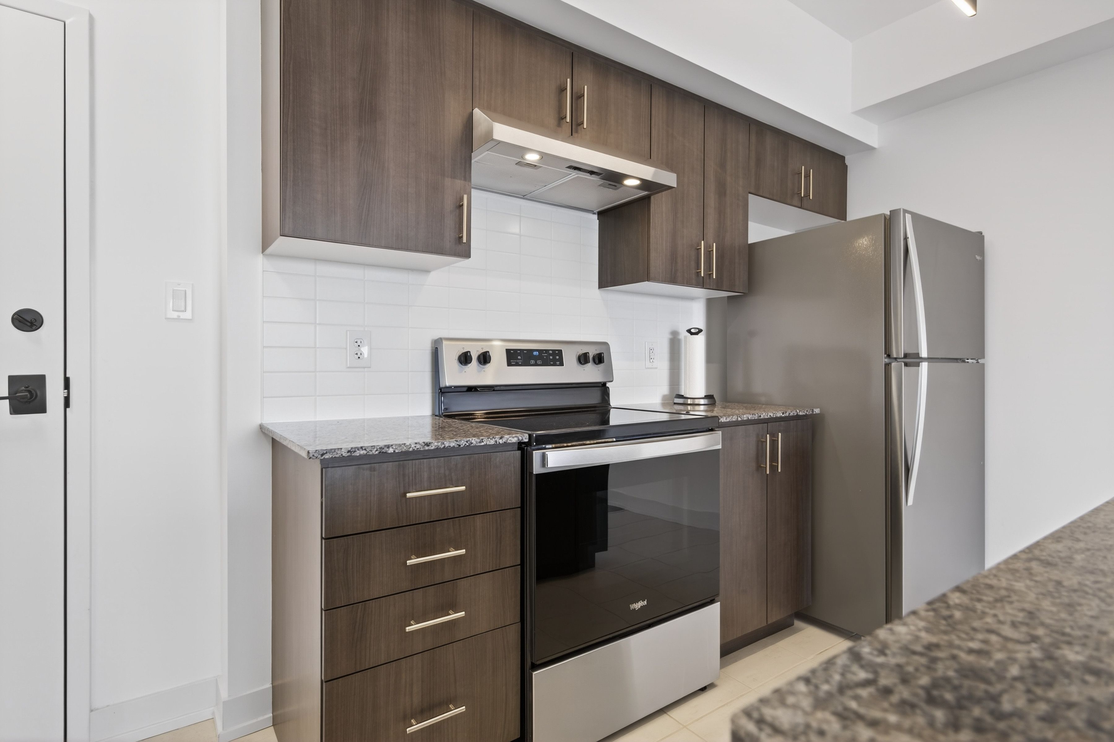 • Stylish kitchen with granite countertops and stainless steel appliances.